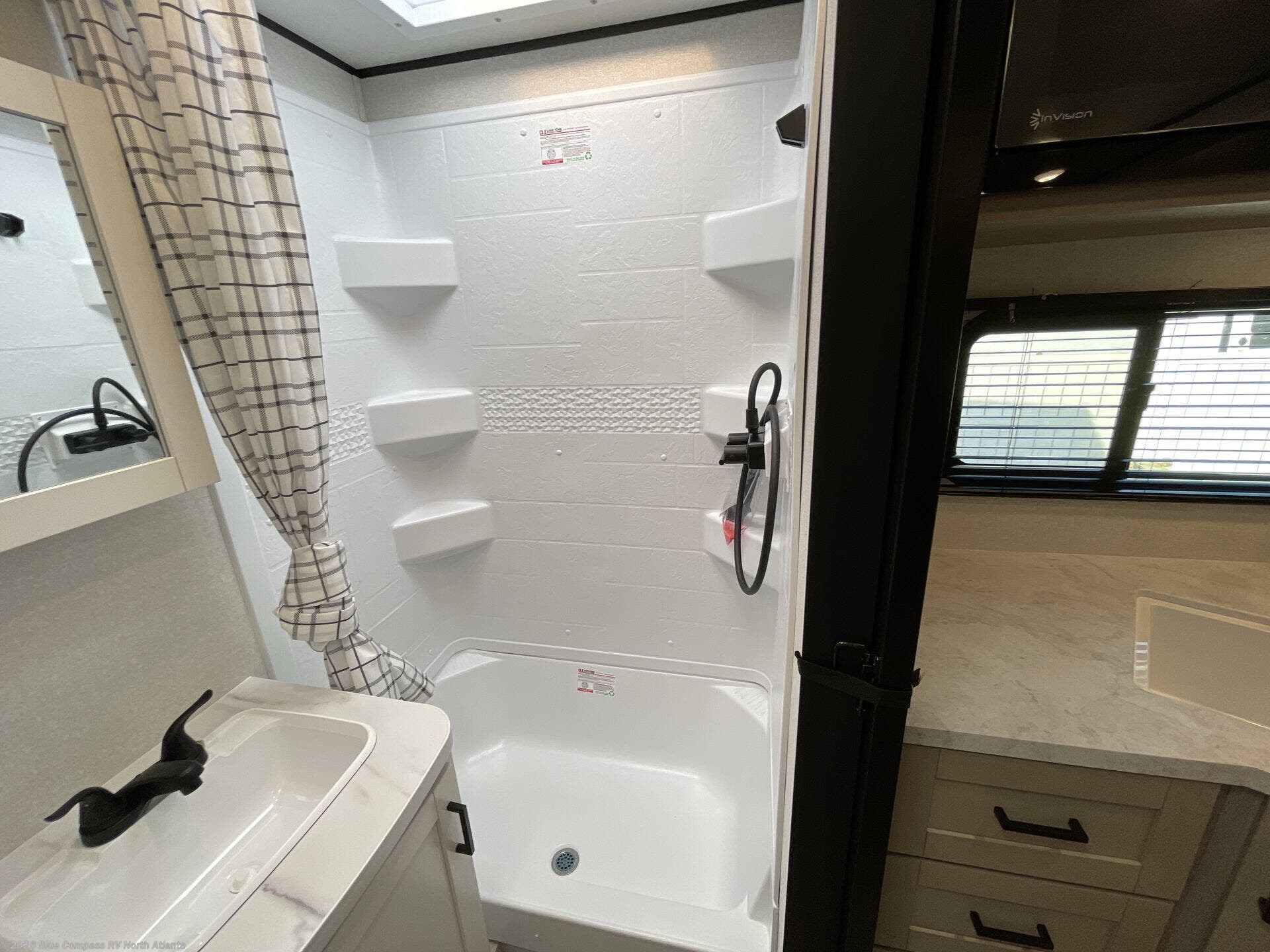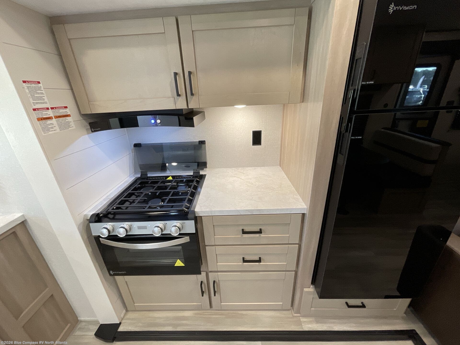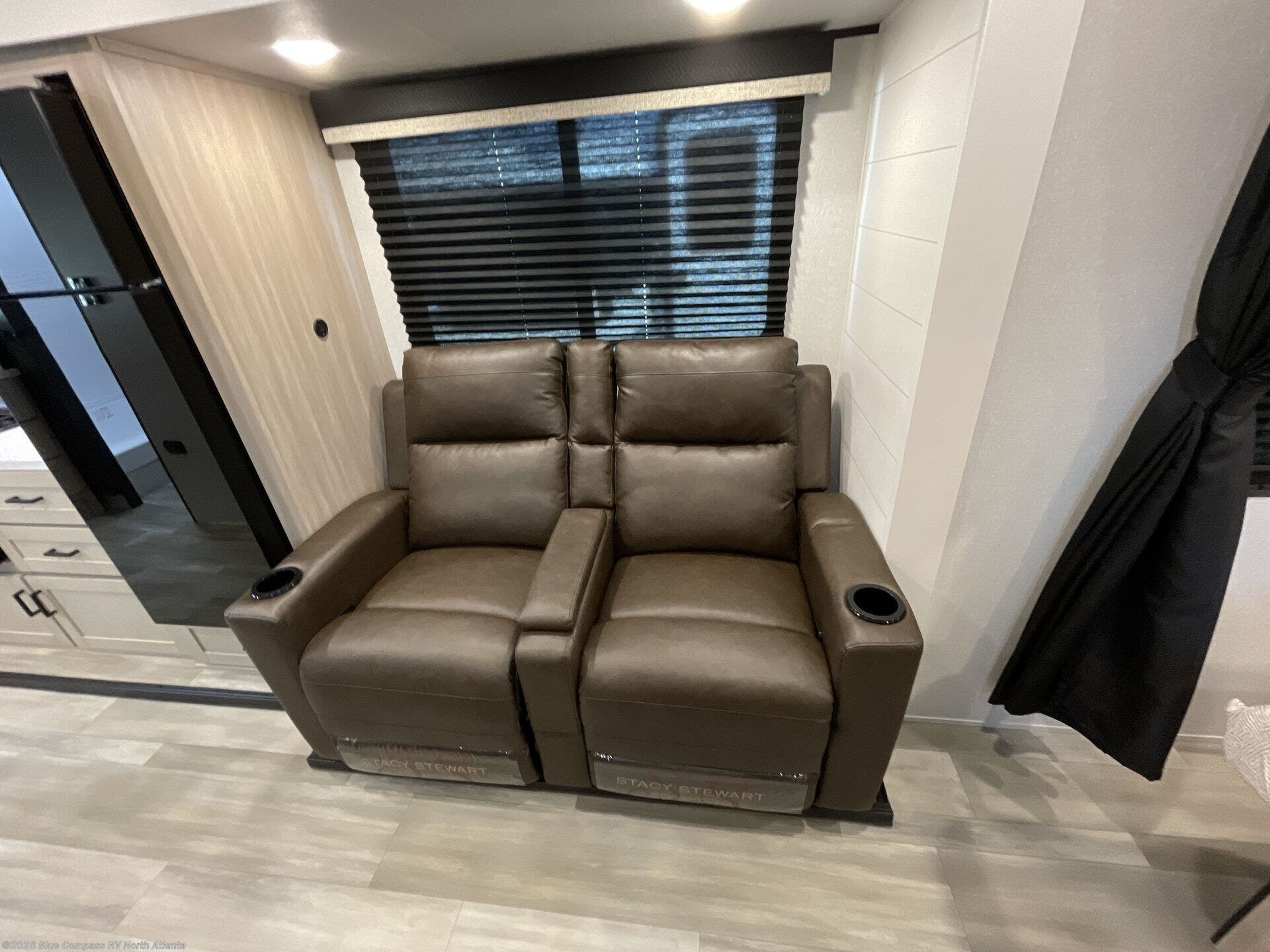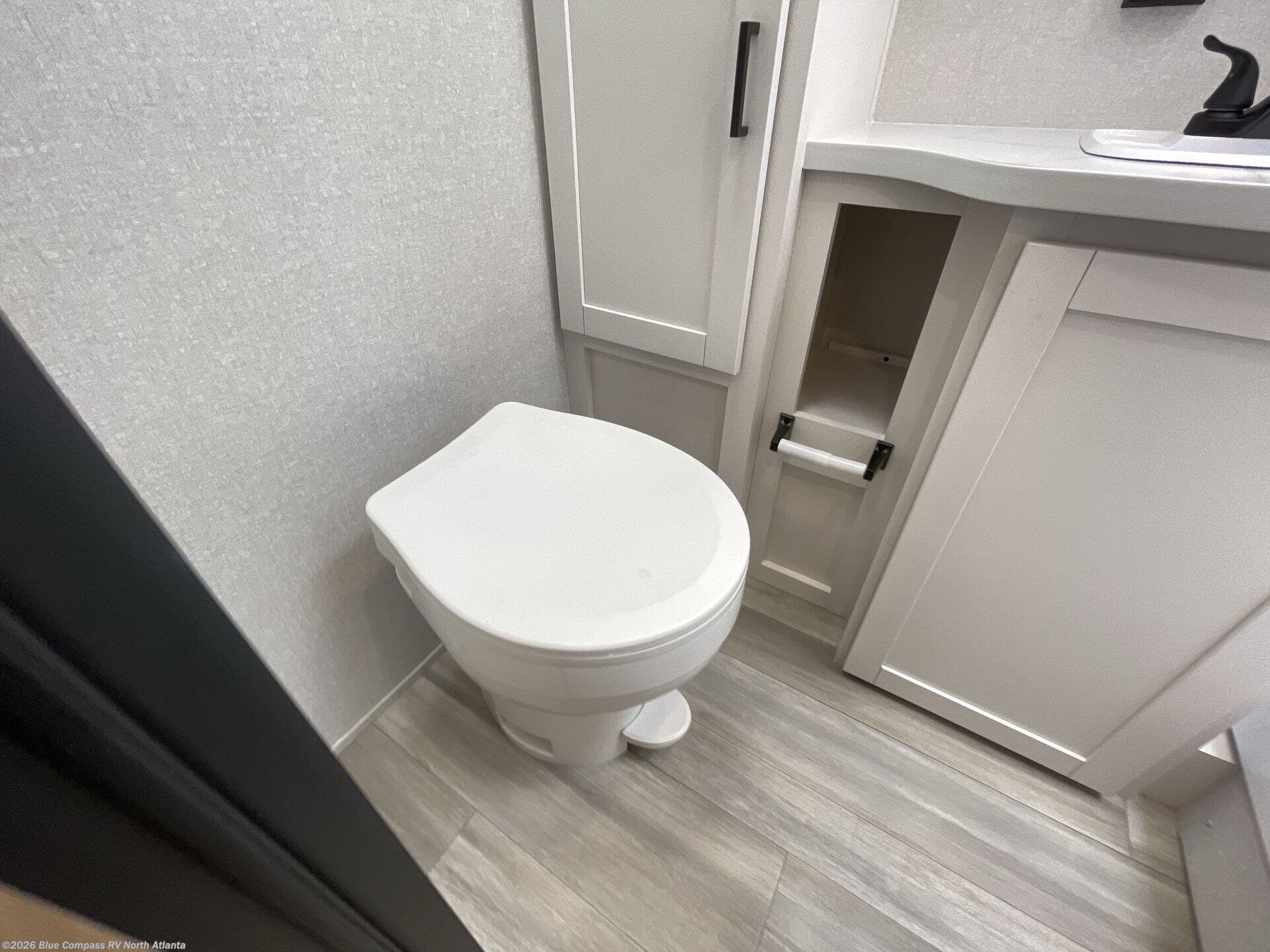 You'll love having your own space in this travel trailer thanks to the front bedroom with a queen bed, dual bedside wardrobes, and privacy curtain. A large slide out provides more space to move about, and there is theater seating here to relax in the evenings. You can make meals on the three-burner cooktop or in the microwave oven, and you can dine at the booth dinette. This unit also includes a 12V refrigerator and pantry for food storge plus ample overhead cabinets for your personal belongings.