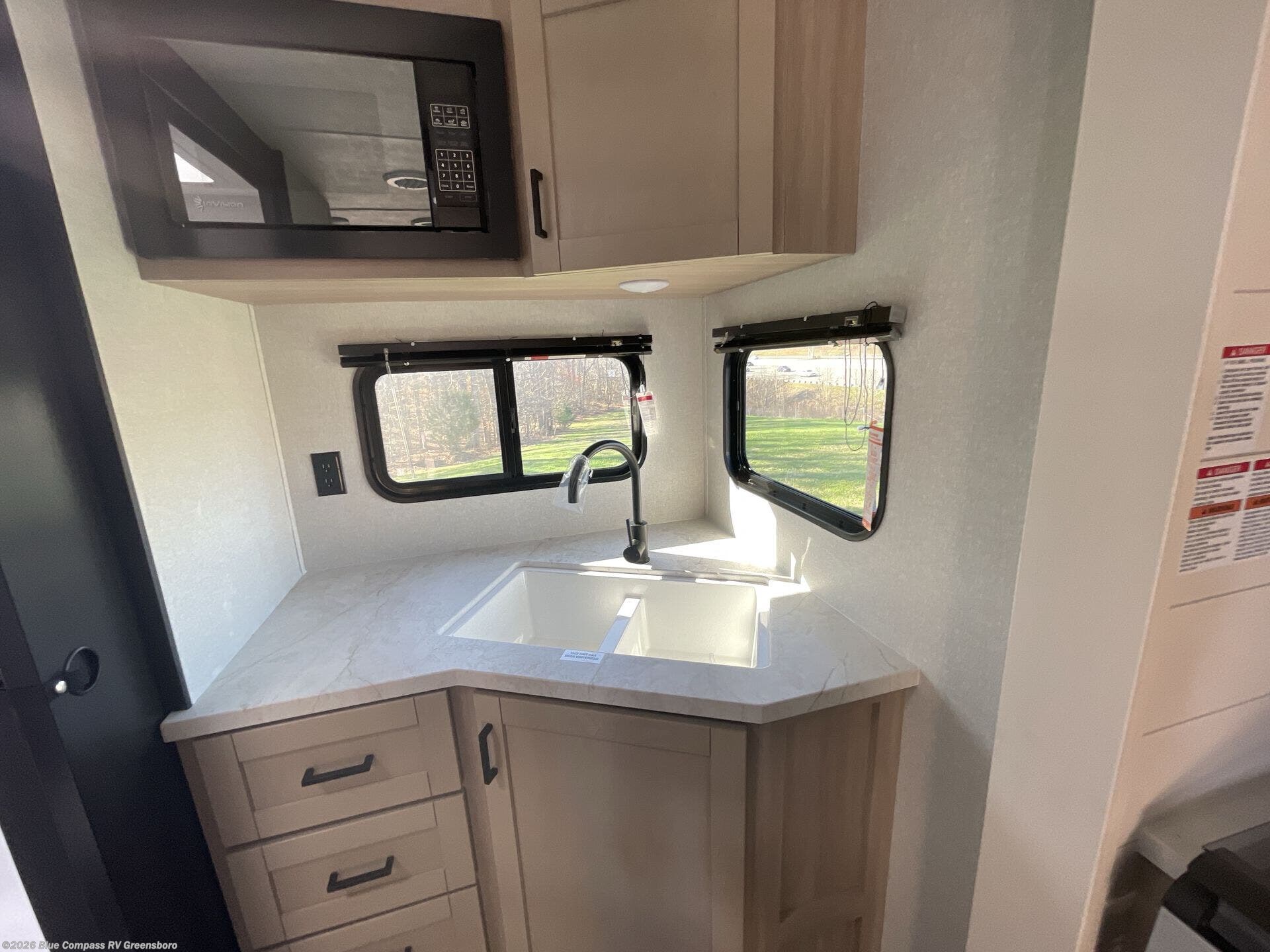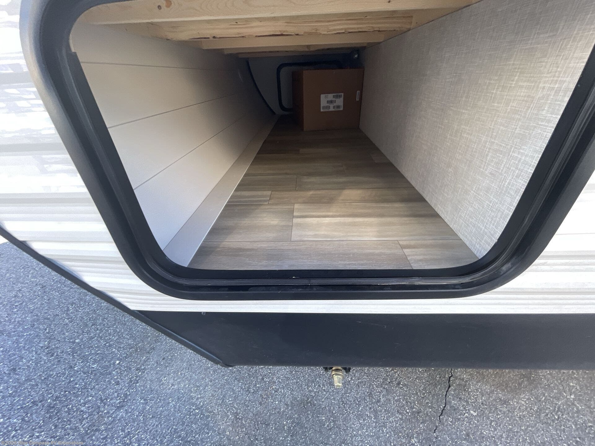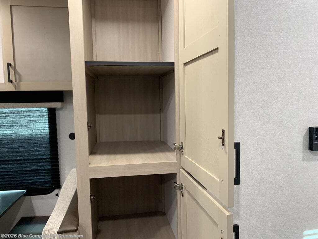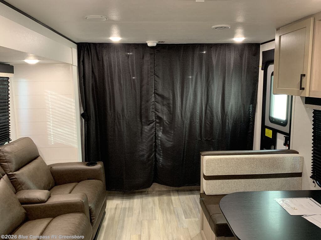 You'll love having your own space in this travel trailer thanks to the front bedroom with a queen bed, dual bedside wardrobes, and privacy curtain. A large slide out provides more space to move about, and there is theater seating here to relax in the evenings. You can make meals on the three-burner cooktop or in the microwave oven, and you can dine at the booth dinette. This unit also includes a 12V refrigerator and pantry for food storge plus ample overhead cabinets for your personal belongings.