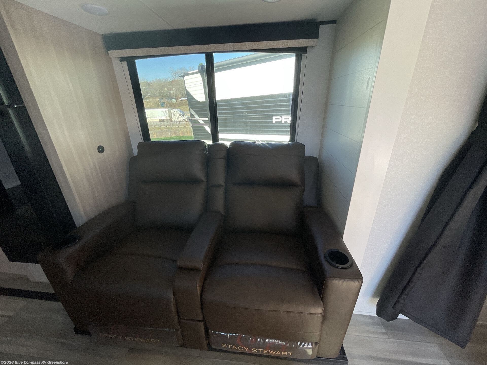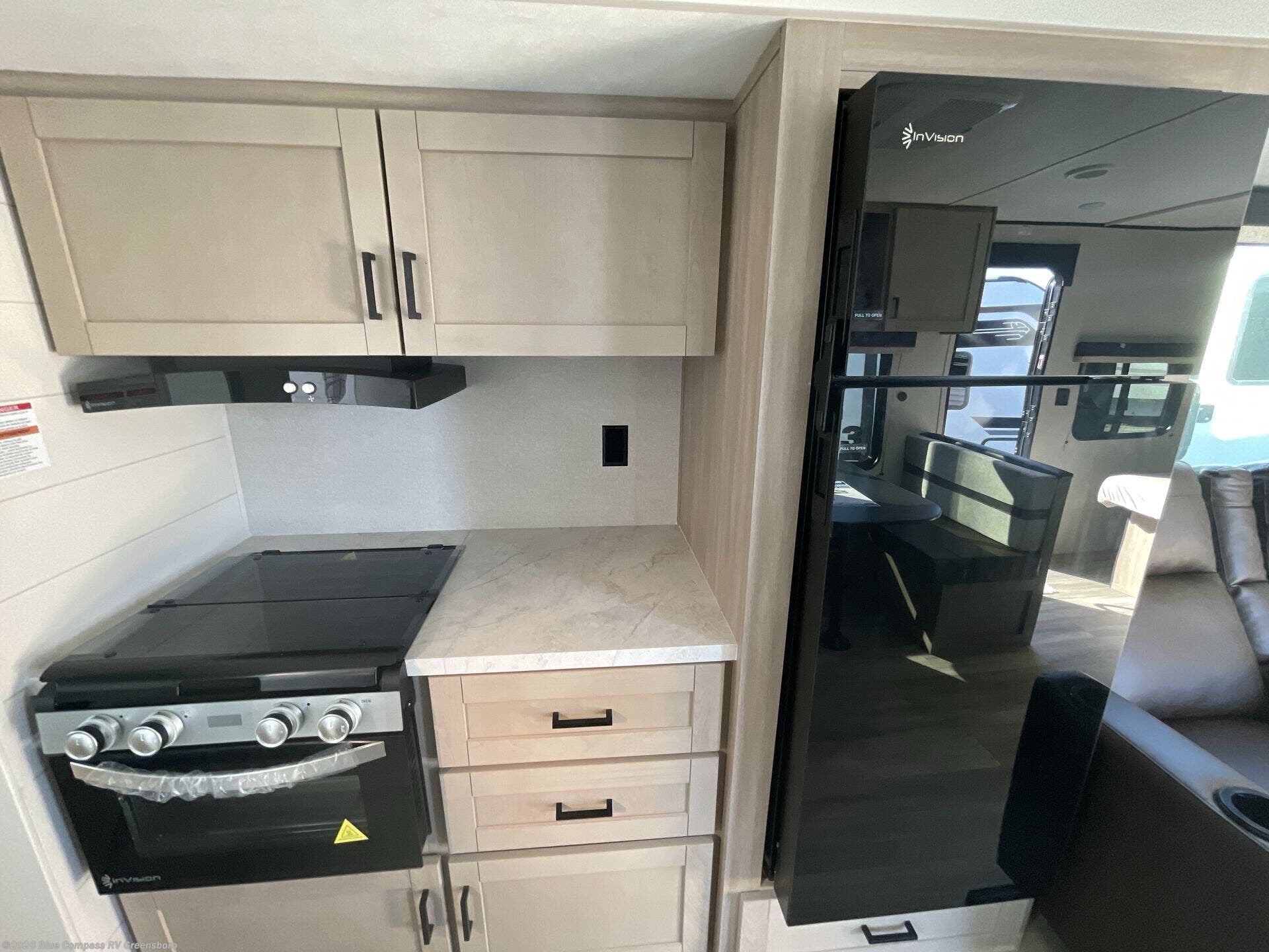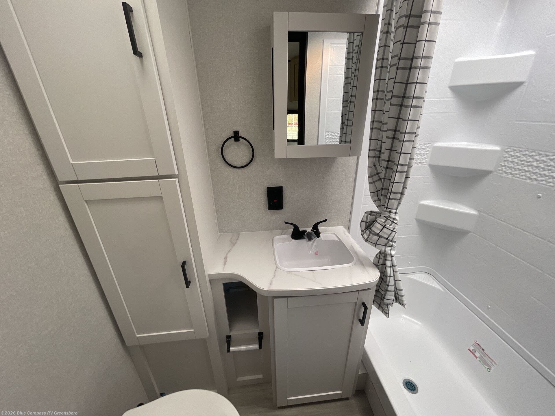 You'll love having your own space in this travel trailer thanks to the front bedroom with a queen bed, dual bedside wardrobes, and privacy curtain. A large slide out provides more space to move about, and there is theater seating here to relax in the evenings. You can make meals on the three-burner cooktop or in the microwave oven, and you can dine at the booth dinette. This unit also includes a 12V refrigerator and pantry for food storge plus ample overhead cabinets for your personal belongings.