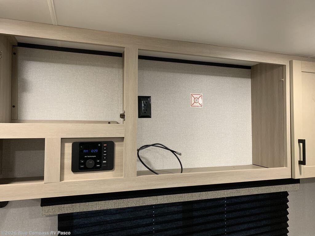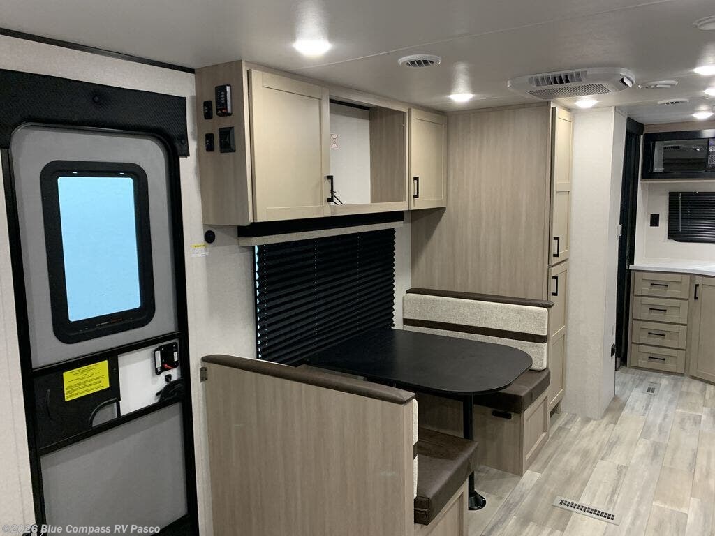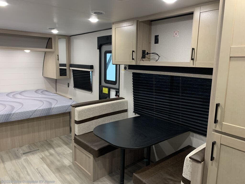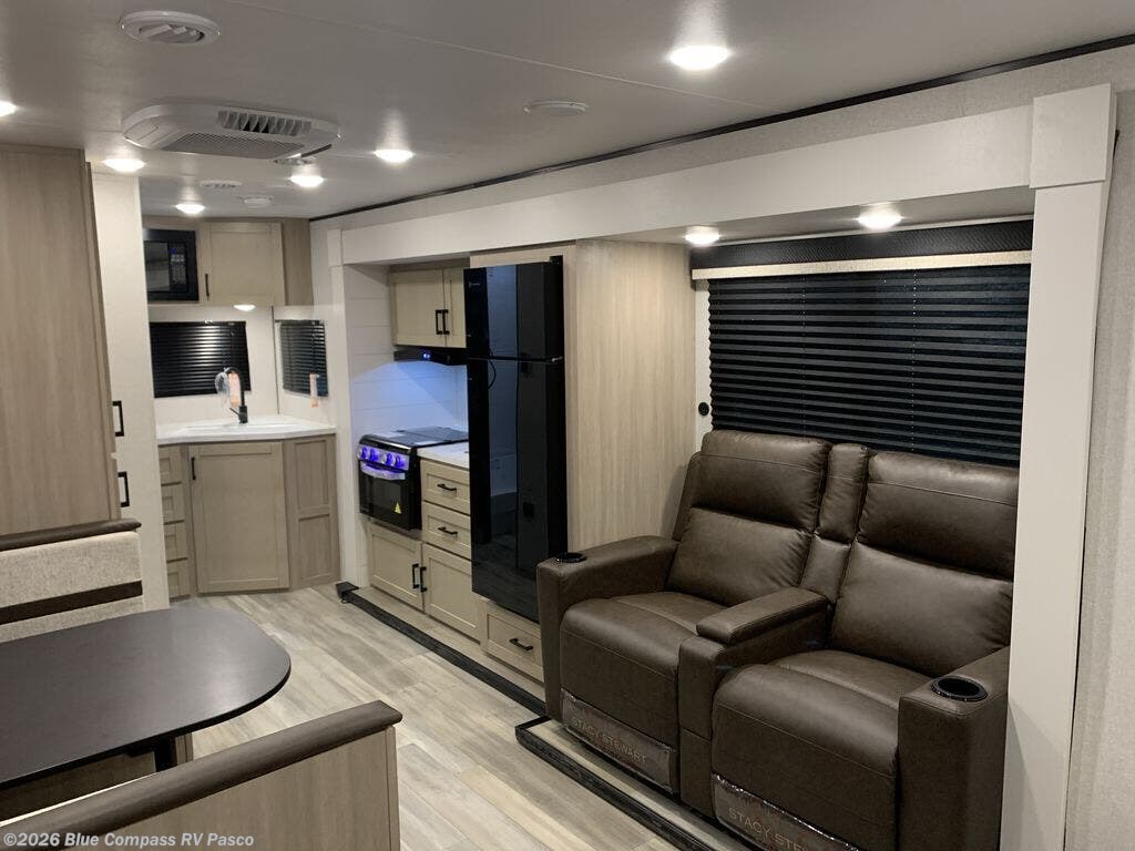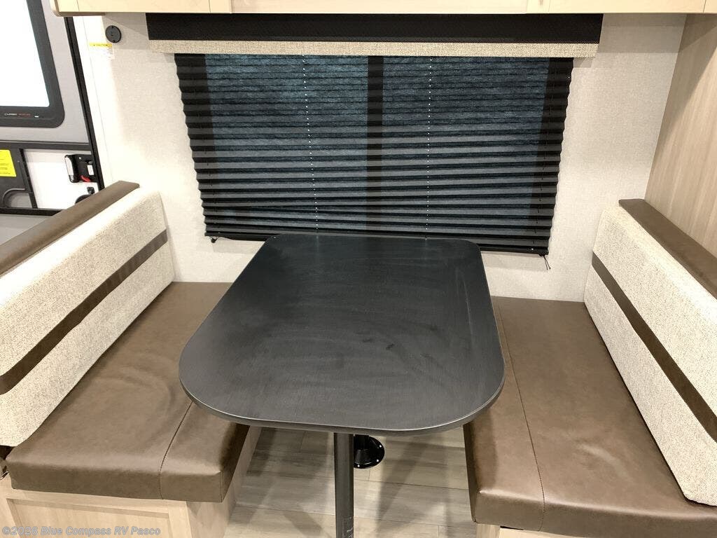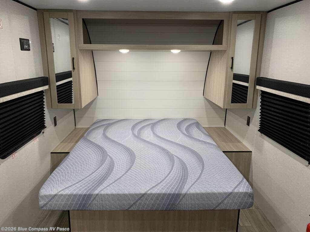 You'll love having your own space in this travel trailer thanks to the front bedroom with a queen bed, dual bedside wardrobes, and privacy curtain. A large slide out provides more space to move about, and there is theater seating here to relax in the evenings. You can make meals on the three-burner cooktop or in the microwave oven, and you can dine at the booth dinette. This unit also includes a 12V refrigerator and pantry for food storge plus ample overhead cabinets for your personal belongings.