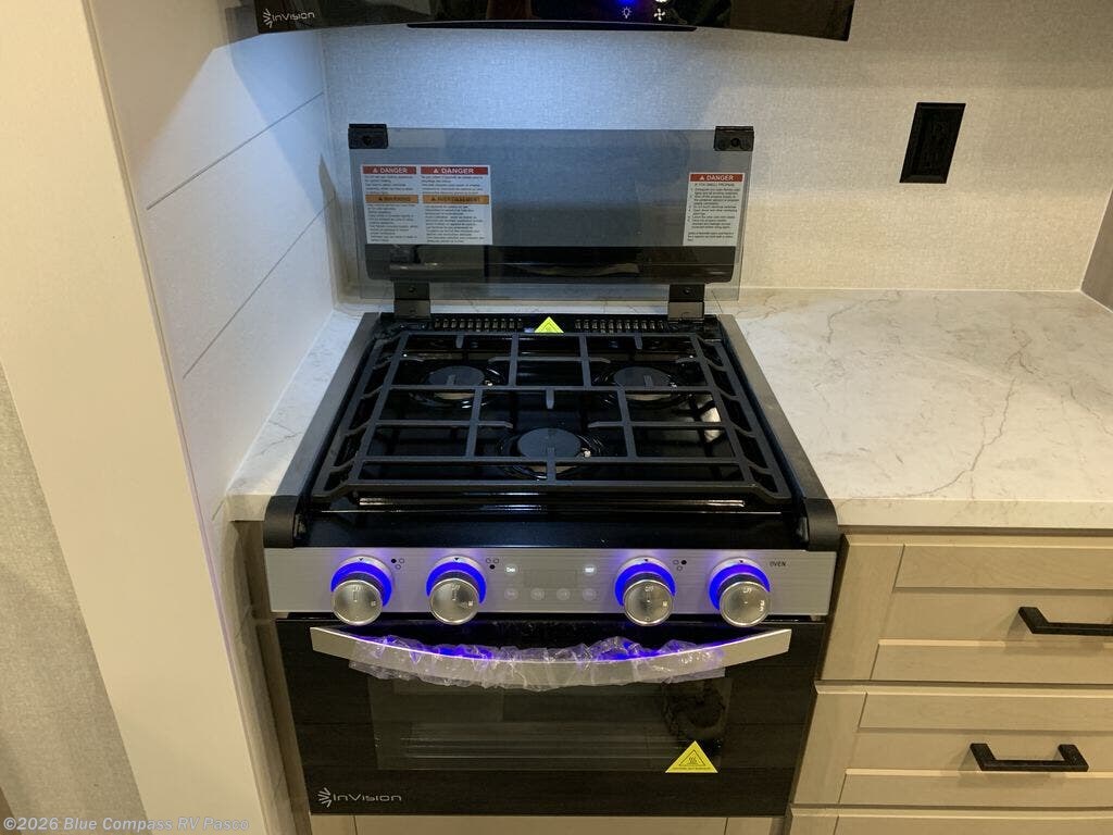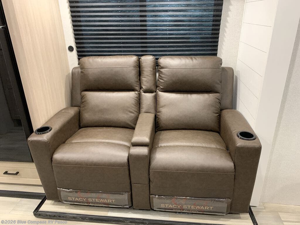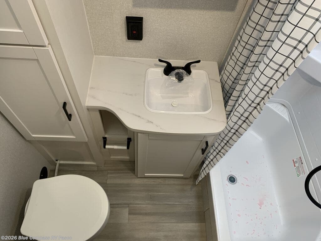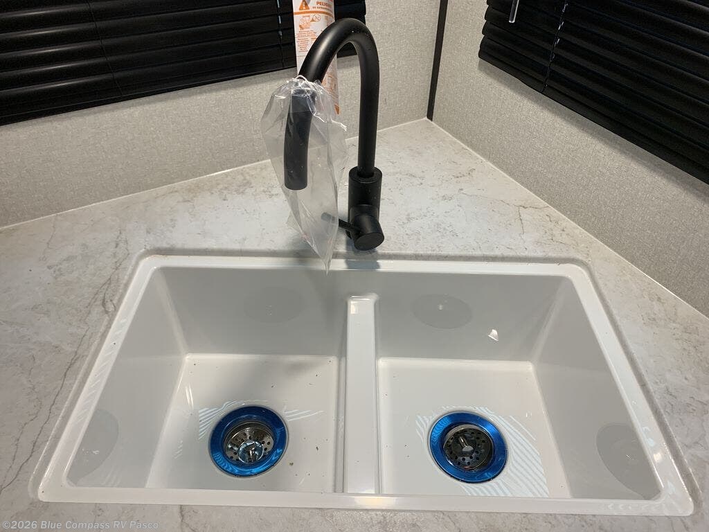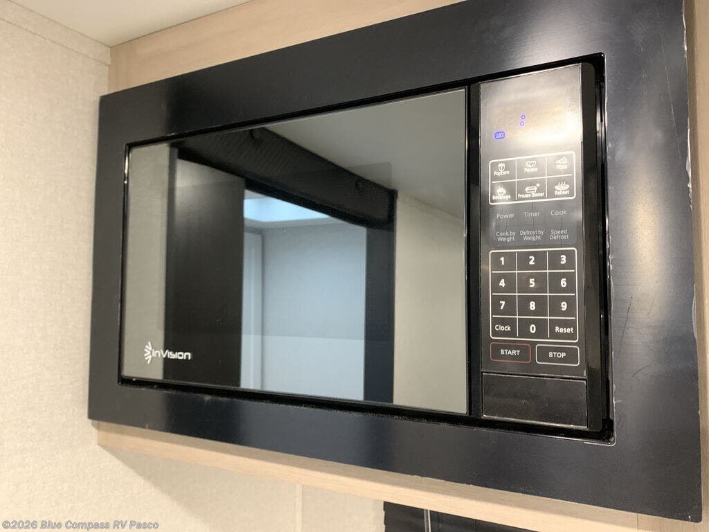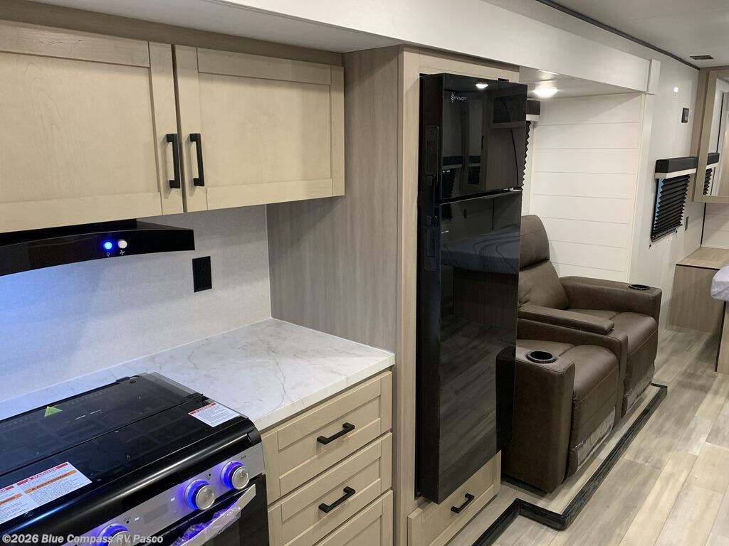You'll love having your own space in this travel trailer thanks to the front bedroom with a queen bed, dual bedside wardrobes, and privacy curtain. A large slide out provides more space to move about, and there is theater seating here to relax in the evenings. You can make meals on the three-burner cooktop or in the microwave oven, and you can dine at the booth dinette. This unit also includes a 12V refrigerator and pantry for food storge plus ample overhead cabinets for your personal belongings.