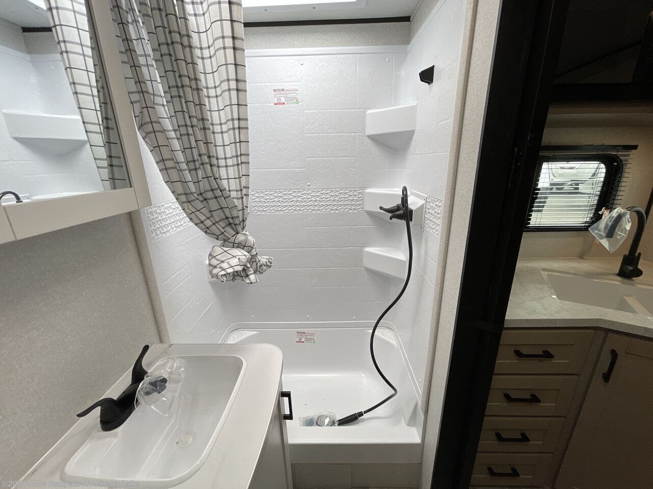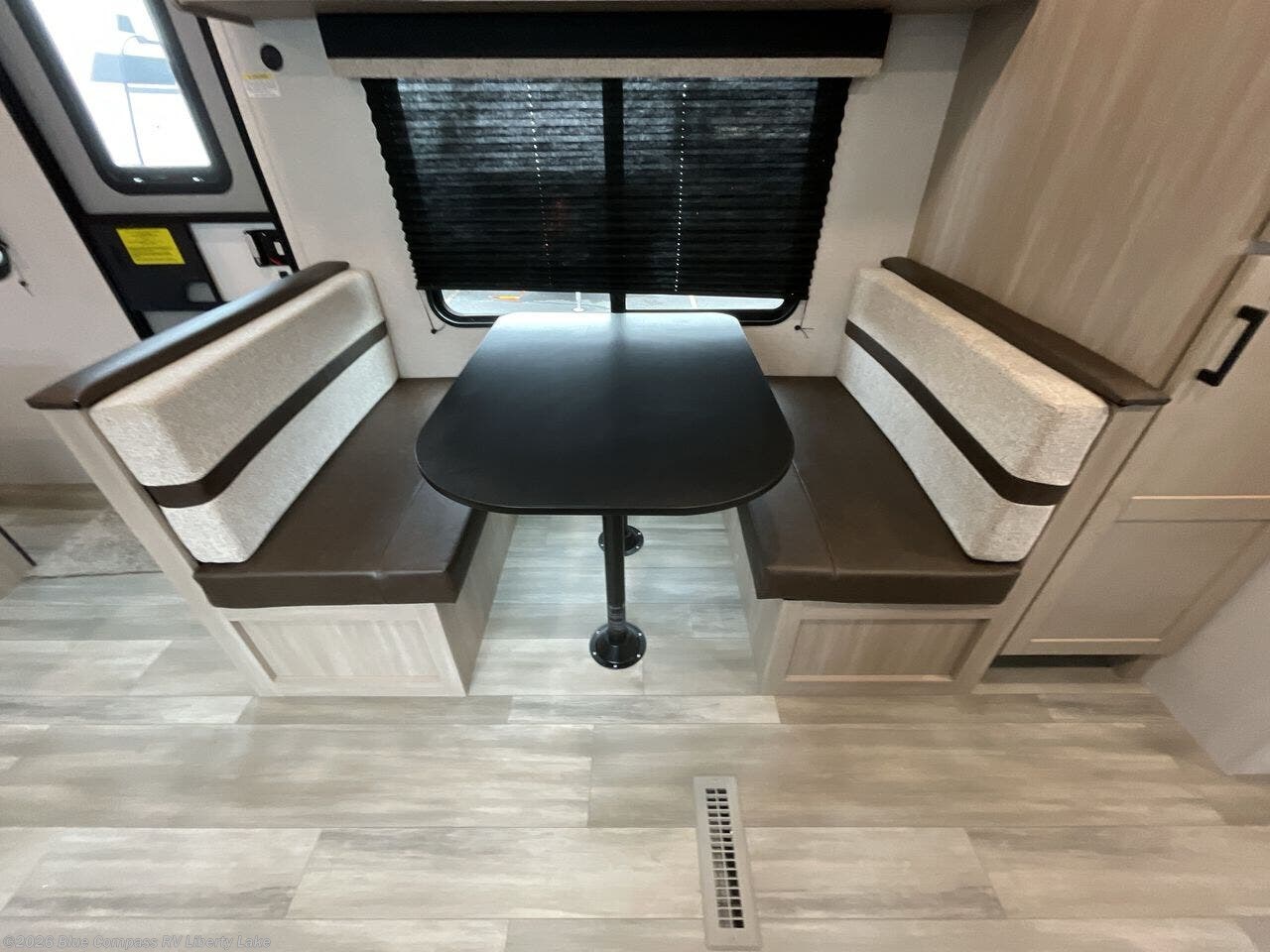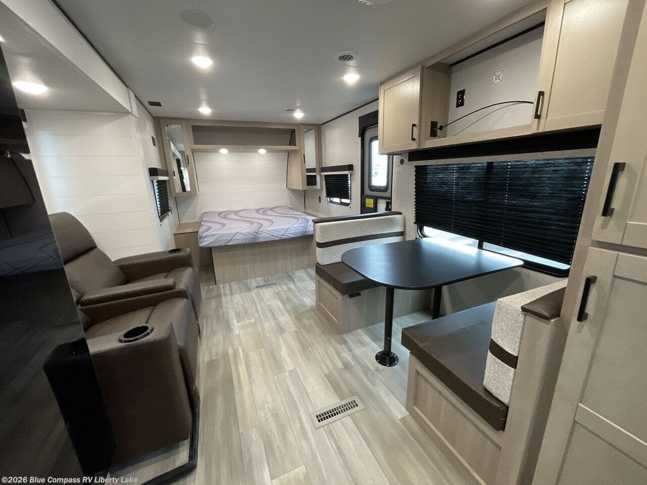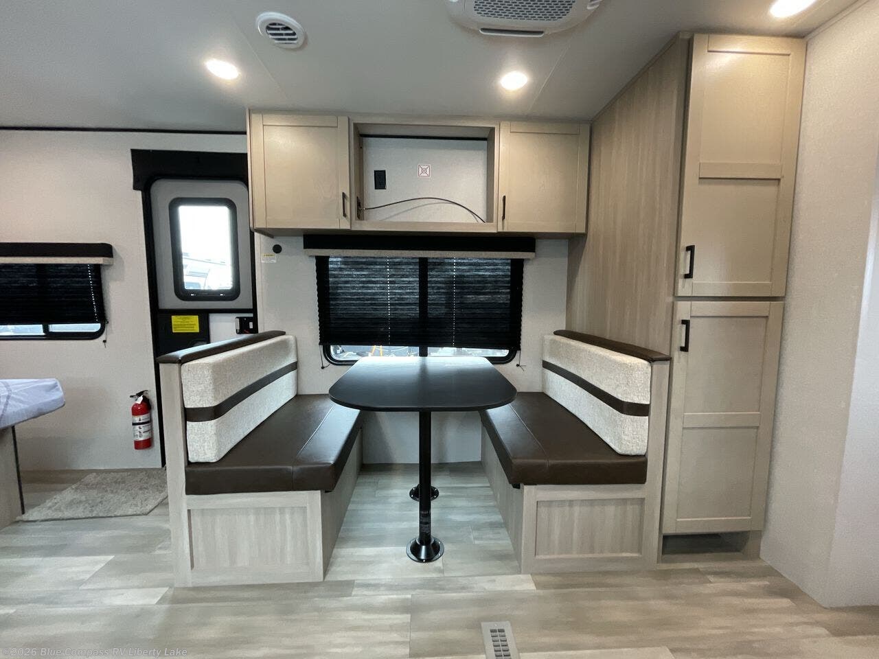 You'll love having your own space in this travel trailer thanks to the front bedroom with a queen bed, dual bedside wardrobes, and privacy curtain. A large slide out provides more space to move about, and there is theater seating here to relax in the evenings. You can make meals on the three-burner cooktop or in the microwave oven, and you can dine at the booth dinette. This unit also includes a 12V refrigerator and pantry for food storge plus ample overhead cabinets for your personal belongings.