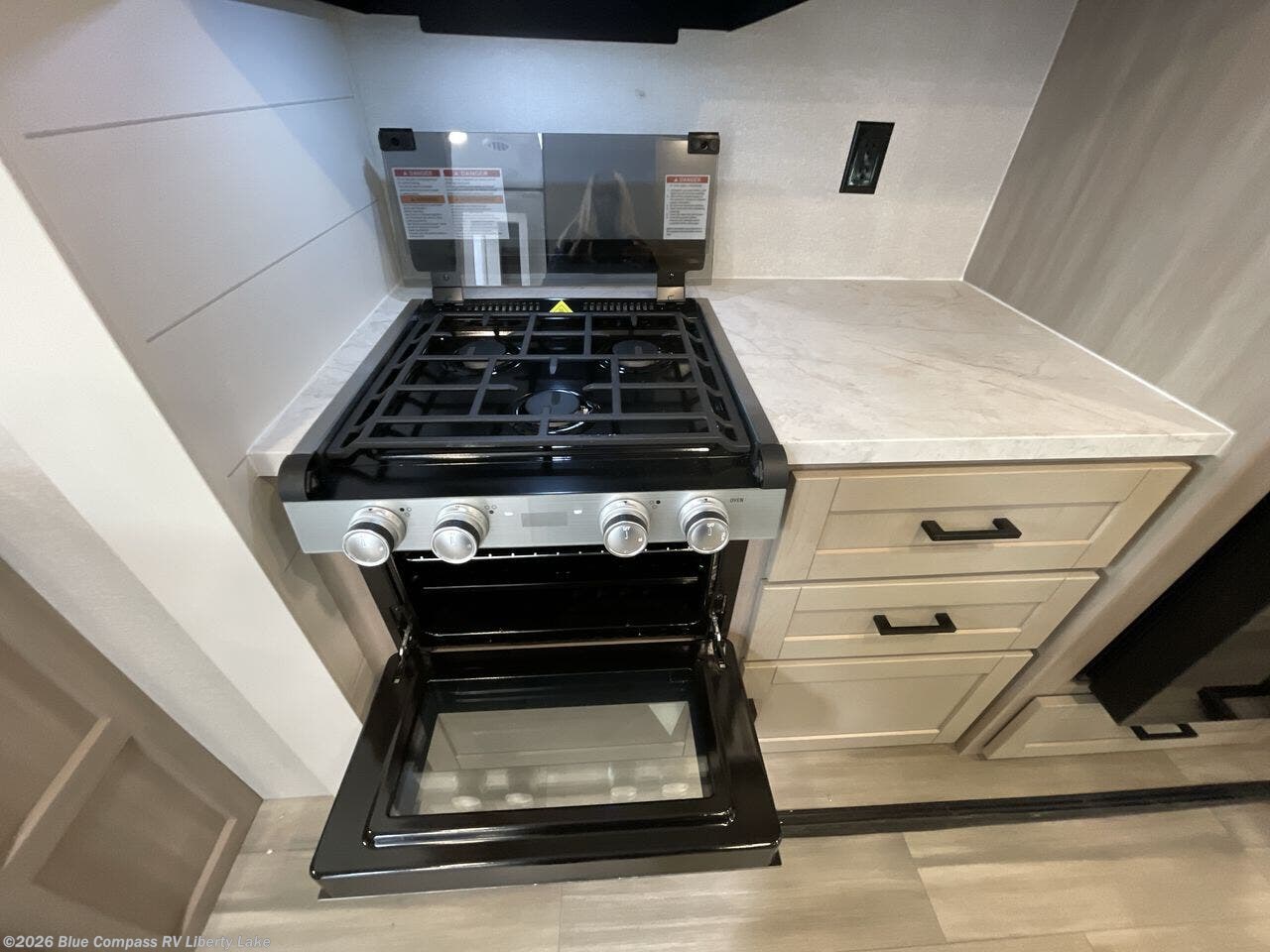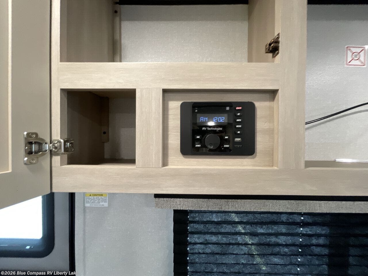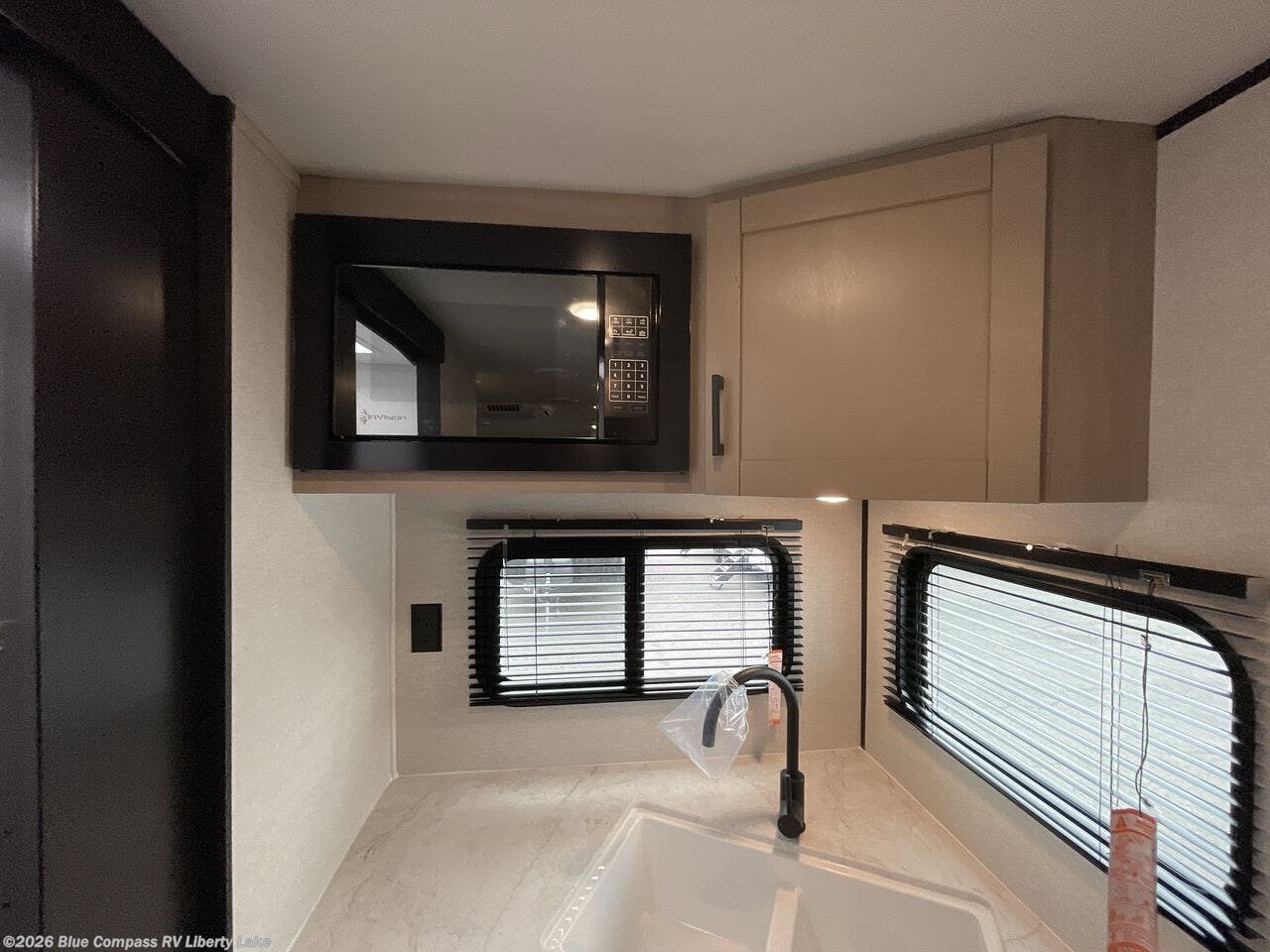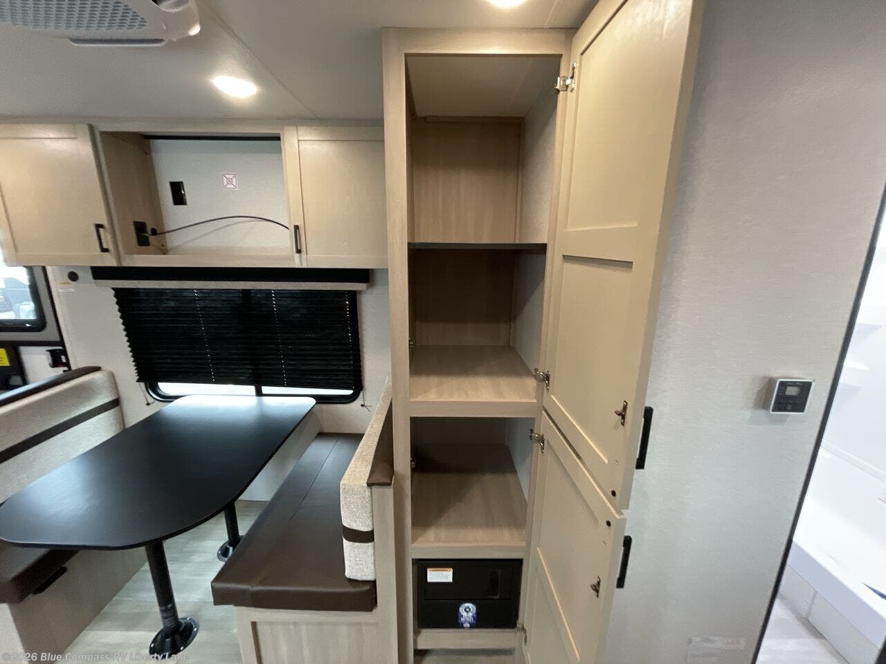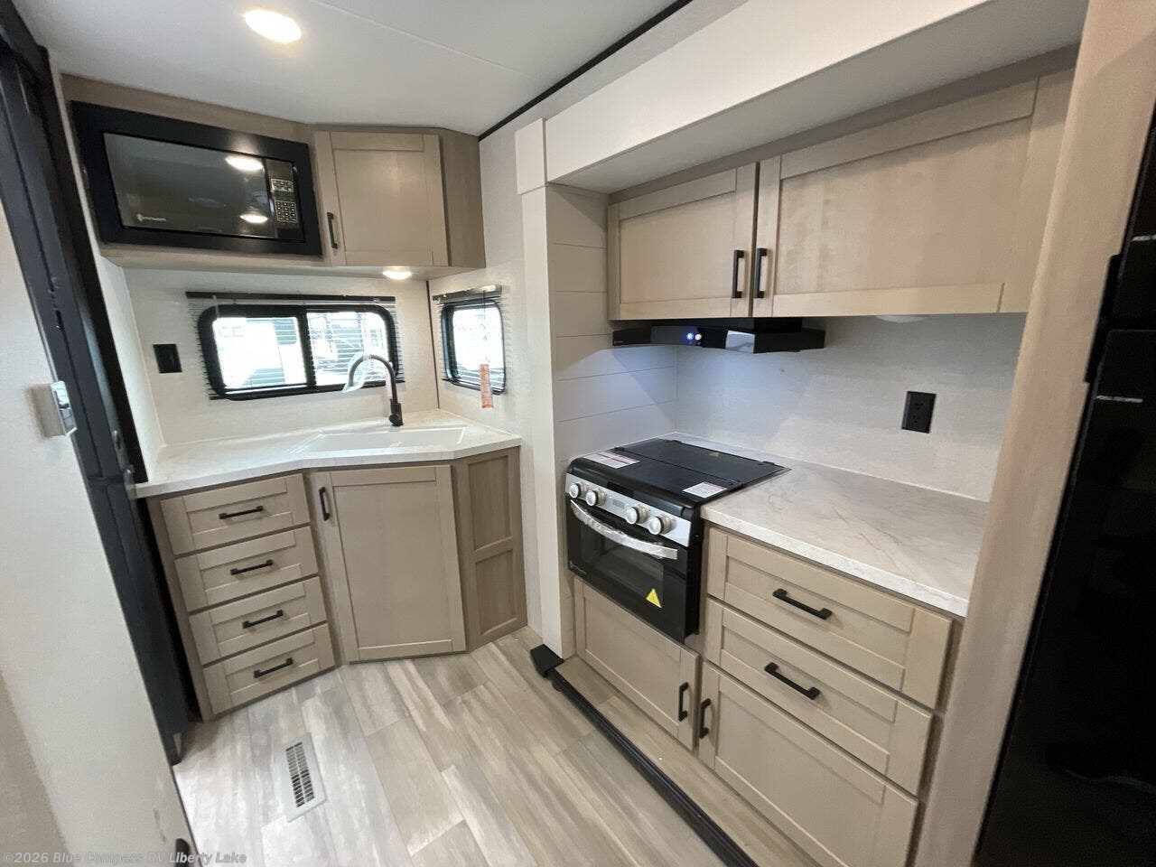 You'll love having your own space in this travel trailer thanks to the front bedroom with a queen bed, dual bedside wardrobes, and privacy curtain. A large slide out provides more space to move about, and there is theater seating here to relax in the evenings. You can make meals on the three-burner cooktop or in the microwave oven, and you can dine at the booth dinette. This unit also includes a 12V refrigerator and pantry for food storge plus ample overhead cabinets for your personal belongings.