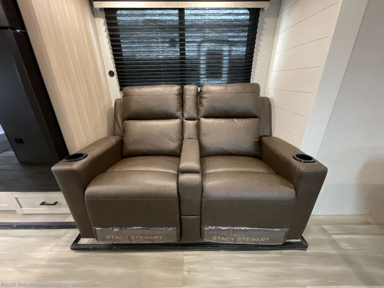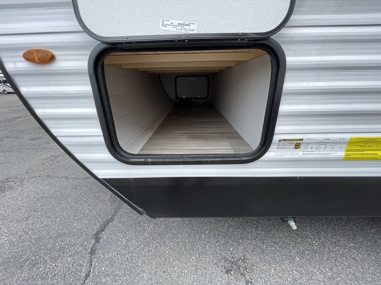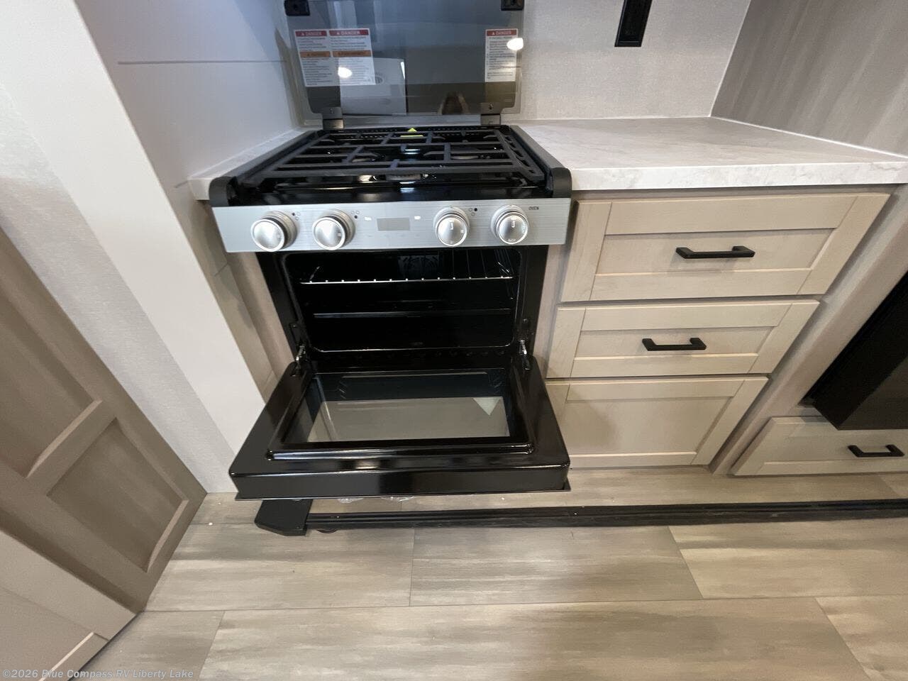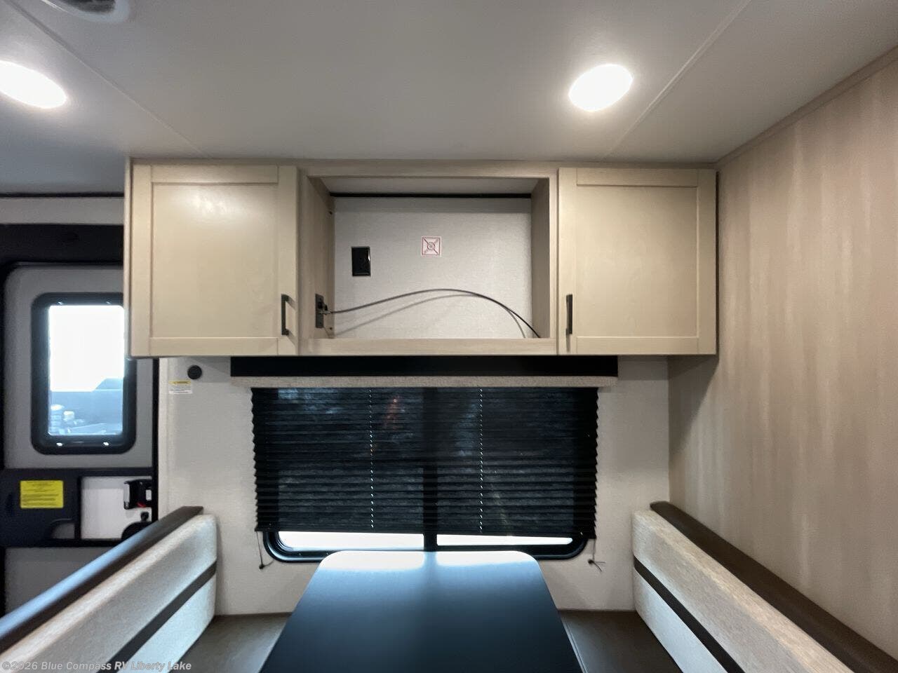 You'll love having your own space in this travel trailer thanks to the front bedroom with a queen bed, dual bedside wardrobes, and privacy curtain. A large slide out provides more space to move about, and there is theater seating here to relax in the evenings. You can make meals on the three-burner cooktop or in the microwave oven, and you can dine at the booth dinette. This unit also includes a 12V refrigerator and pantry for food storge plus ample overhead cabinets for your personal belongings.