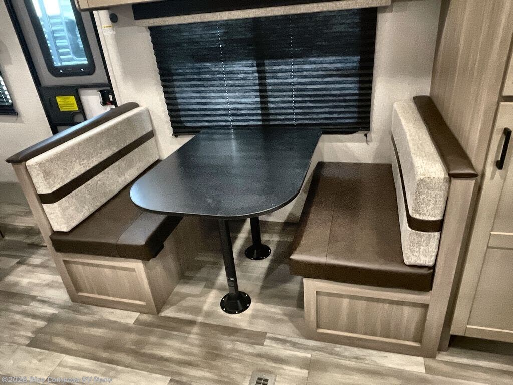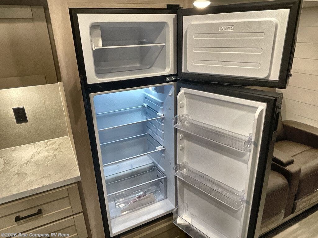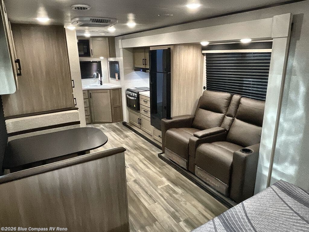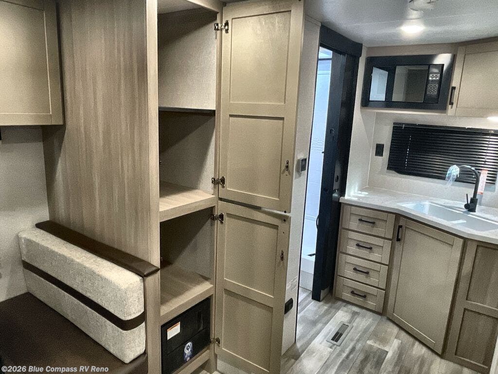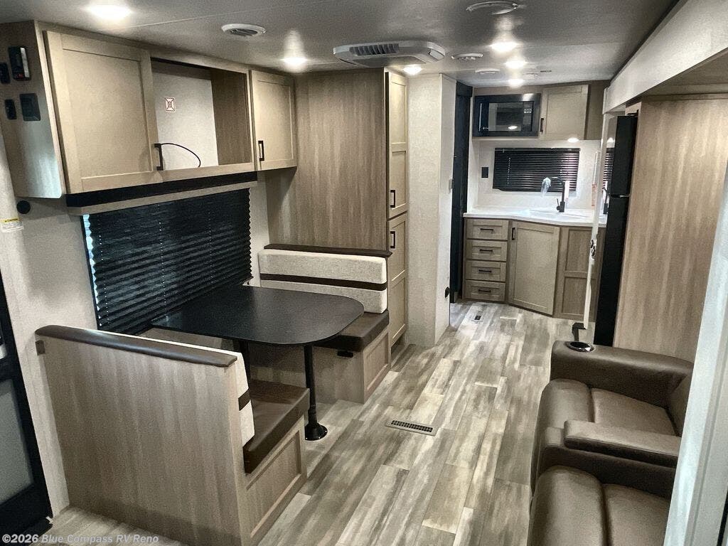 You'll love having your own space in this travel trailer thanks to the front bedroom with a queen bed, dual bedside wardrobes, and privacy curtain. A large slide out provides more space to move about, and there is theater seating here to relax in the evenings. You can make meals on the three-burner cooktop or in the microwave oven, and you can dine at the booth dinette. This unit also includes a 12V refrigerator and pantry for food storge plus ample overhead cabinets for your personal belongings.