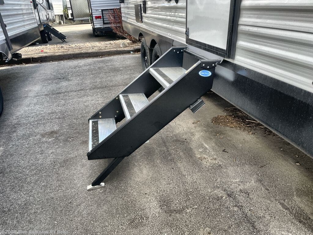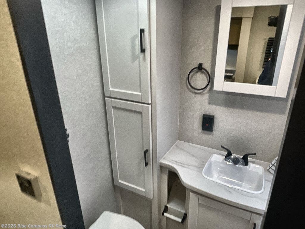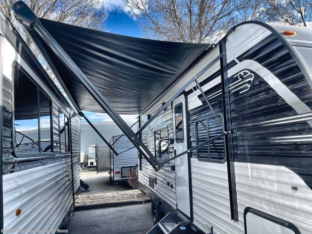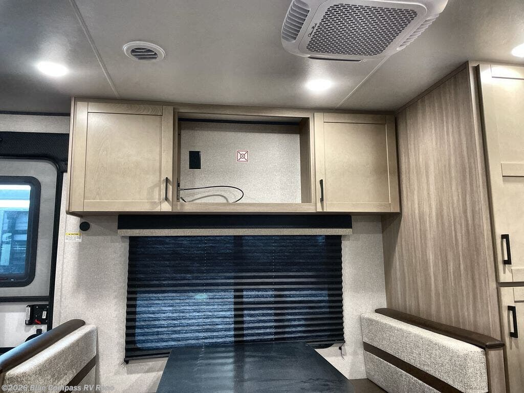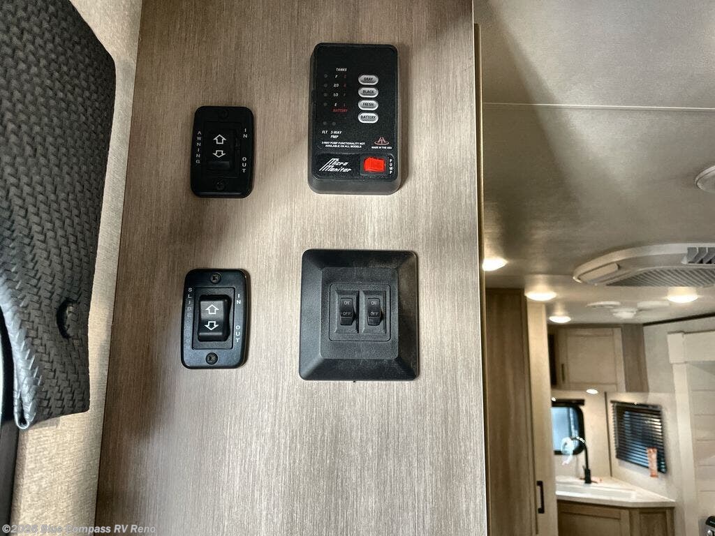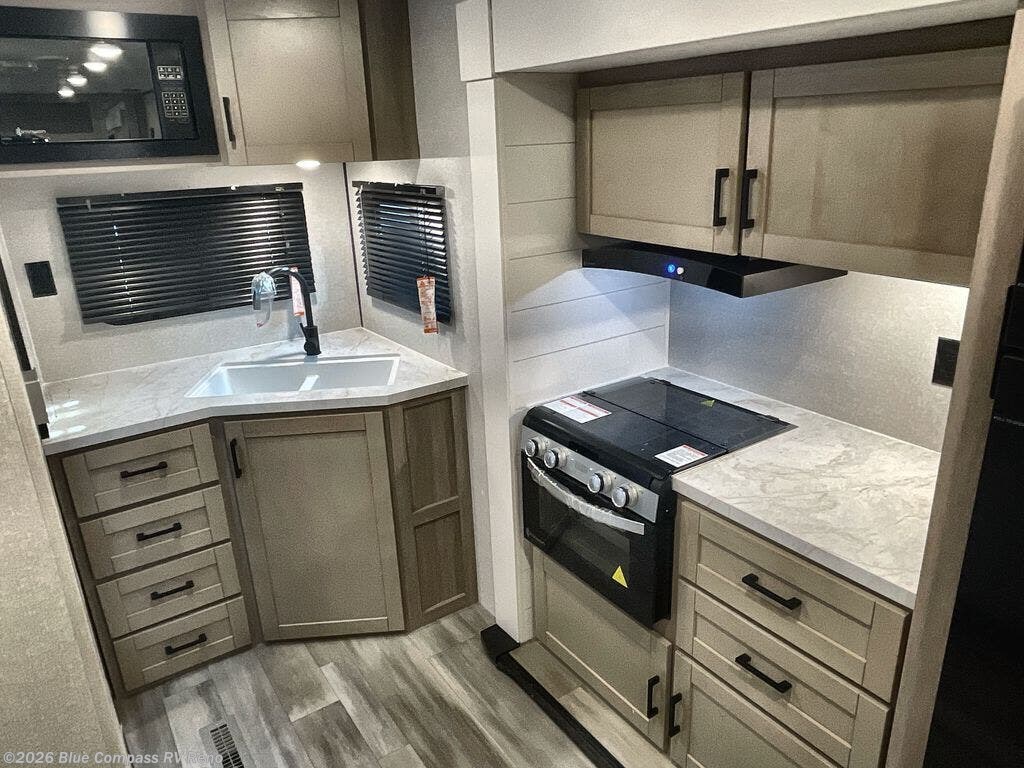 You'll love having your own space in this travel trailer thanks to the front bedroom with a queen bed, dual bedside wardrobes, and privacy curtain. A large slide out provides more space to move about, and there is theater seating here to relax in the evenings. You can make meals on the three-burner cooktop or in the microwave oven, and you can dine at the booth dinette. This unit also includes a 12V refrigerator and pantry for food storge plus ample overhead cabinets for your personal belongings.
