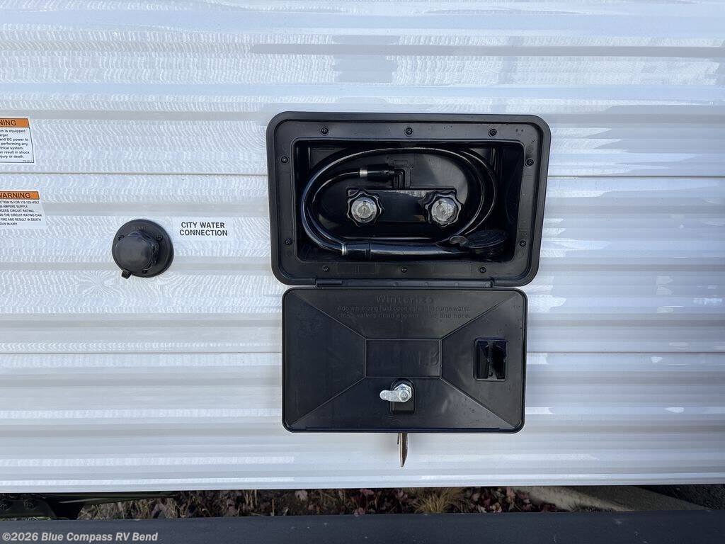 You'll love having your own space in this travel trailer thanks to the front bedroom with a queen bed, dual bedside wardrobes, and privacy curtain. A large slide out provides more space to move about, and there is theater seating here to relax in the evenings. You can make meals on the three-burner cooktop or in the microwave oven, and you can dine at the booth dinette. This unit also includes a 12V refrigerator and pantry for food storge plus ample overhead cabinets for your personal belongings.