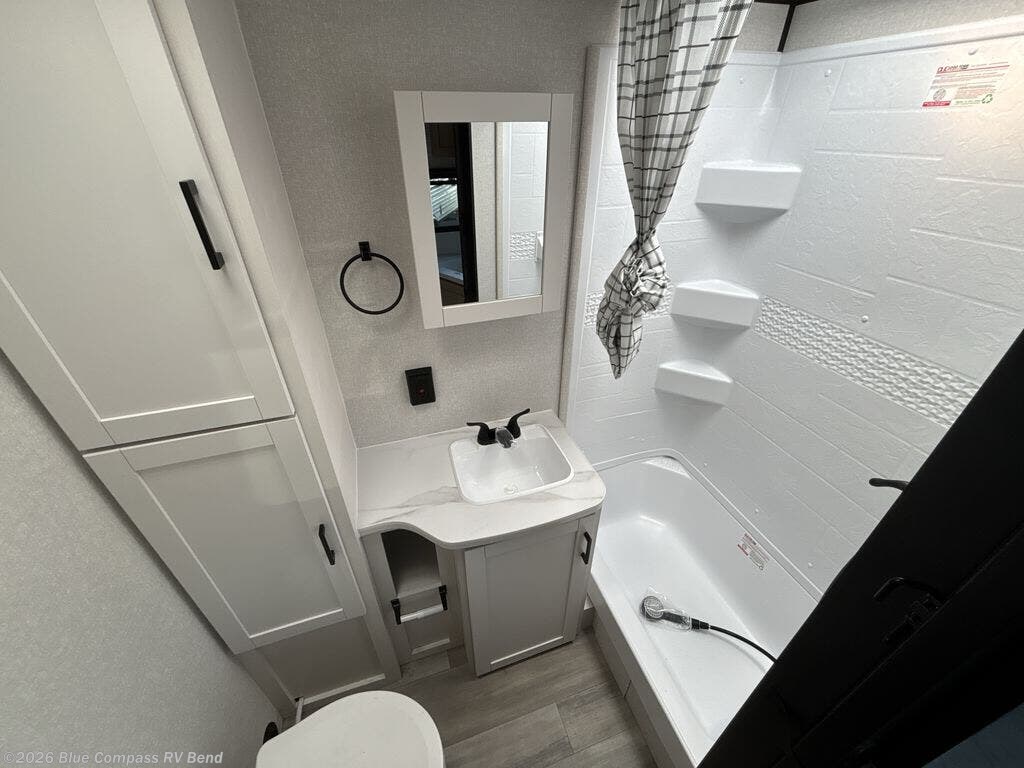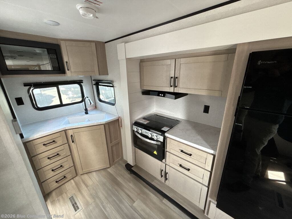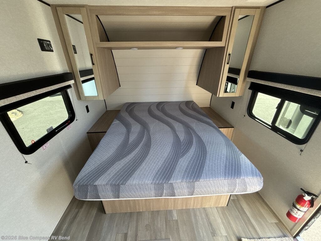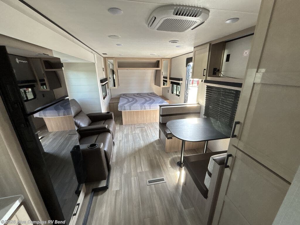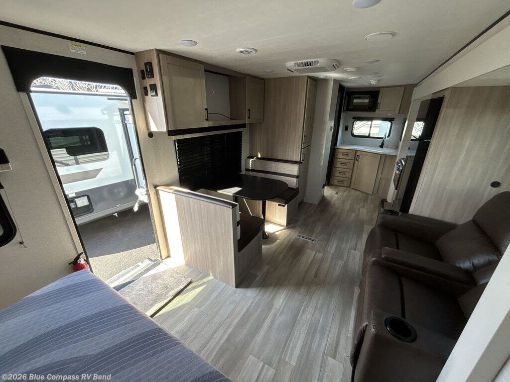 You'll love having your own space in this travel trailer thanks to the front bedroom with a queen bed, dual bedside wardrobes, and privacy curtain. A large slide out provides more space to move about, and there is theater seating here to relax in the evenings. You can make meals on the three-burner cooktop or in the microwave oven, and you can dine at the booth dinette. This unit also includes a 12V refrigerator and pantry for food storge plus ample overhead cabinets for your personal belongings.