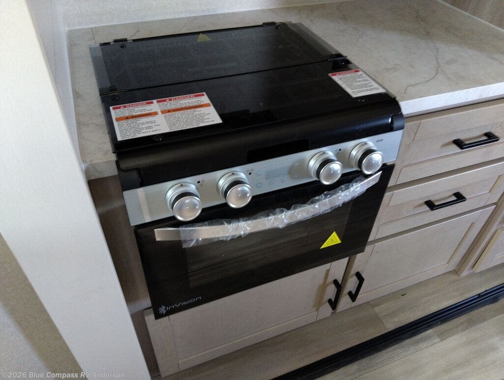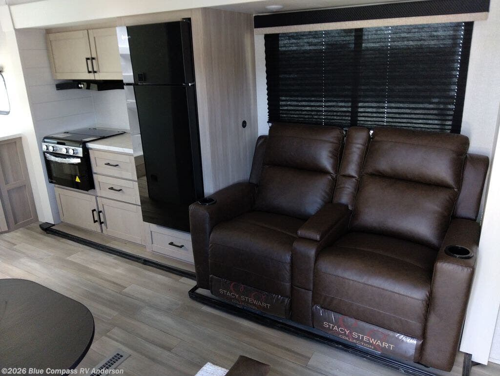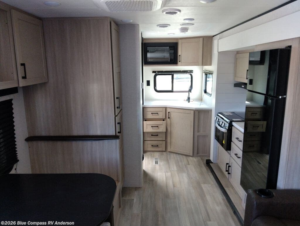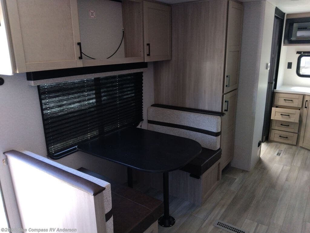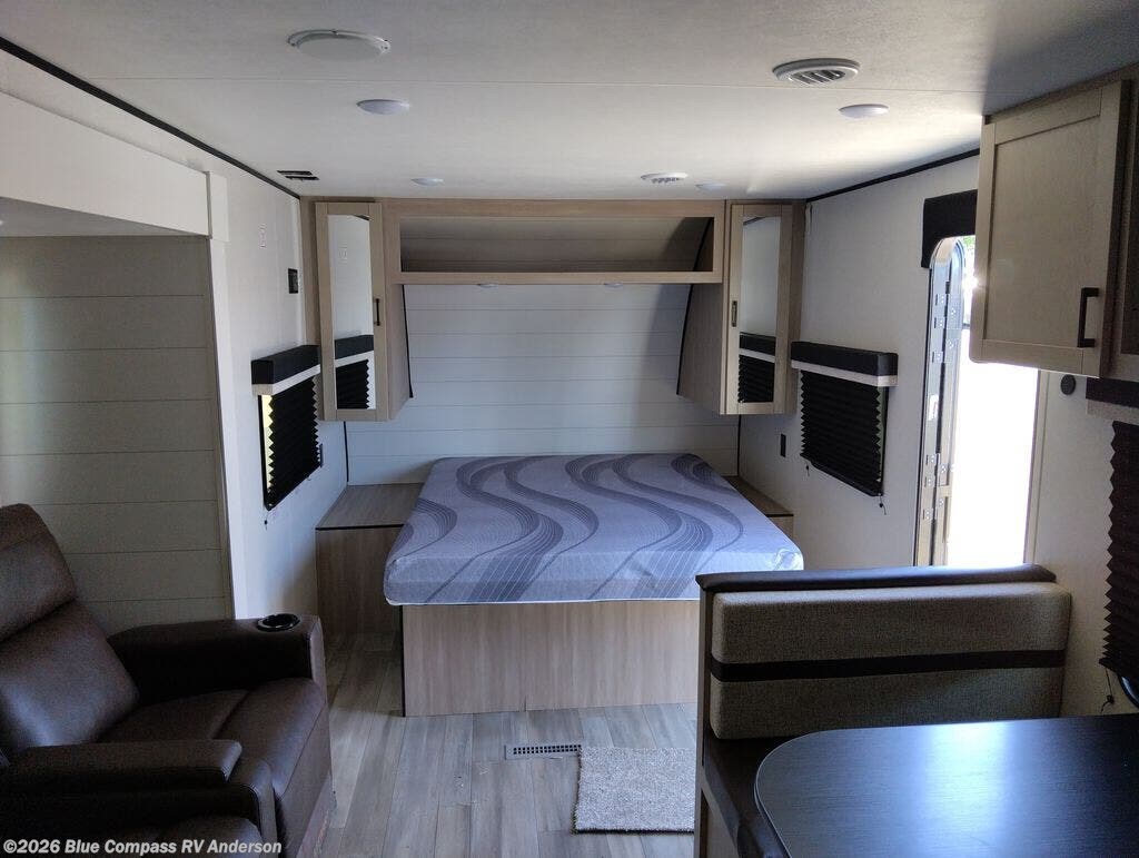 You'll love having your own space in this travel trailer thanks to the front bedroom with a queen bed, dual bedside wardrobes, and privacy curtain. A large slide out provides more space to move about, and there is theater seating here to relax in the evenings. You can make meals on the three-burner cooktop or in the microwave oven, and you can dine at the booth dinette. This unit also includes a 12V refrigerator and pantry for food storge plus ample overhead cabinets for your personal belongings.