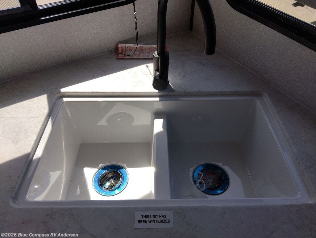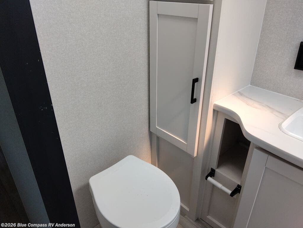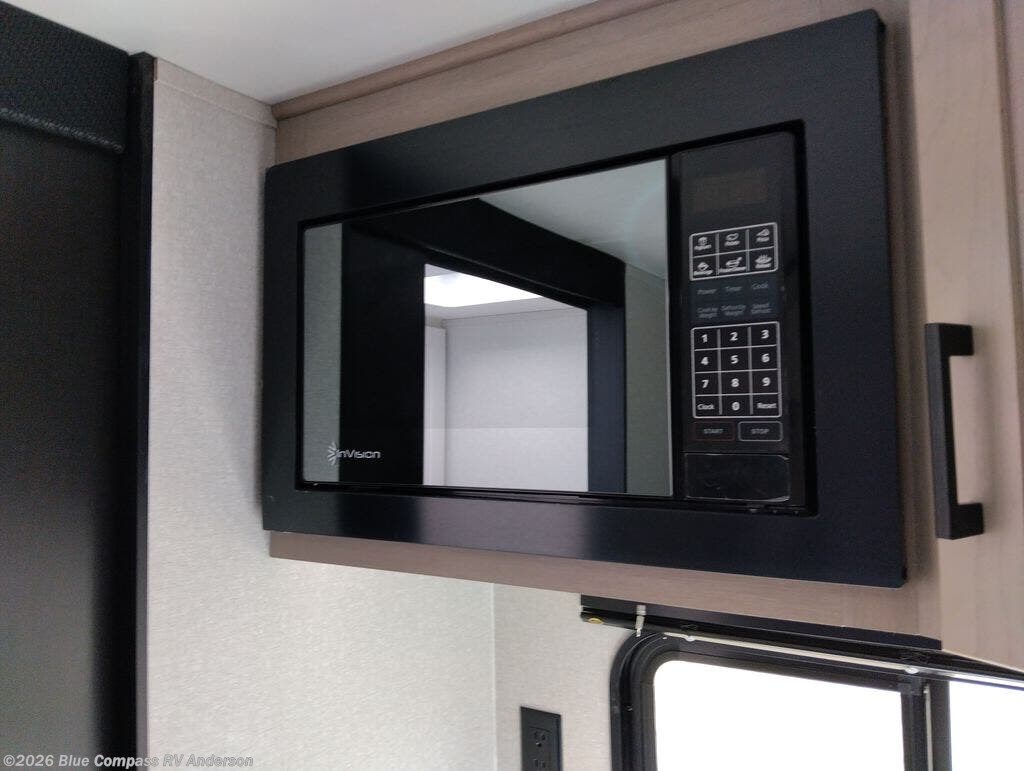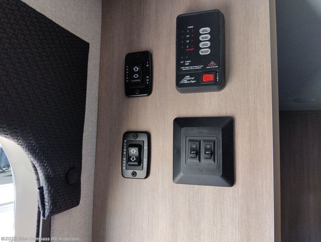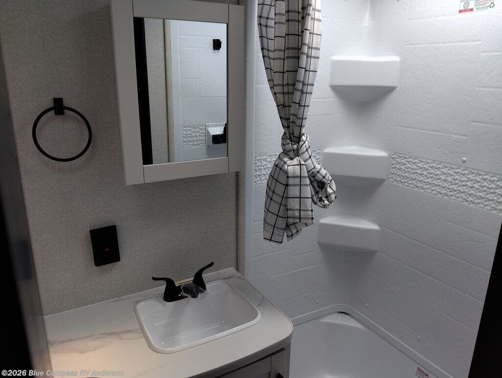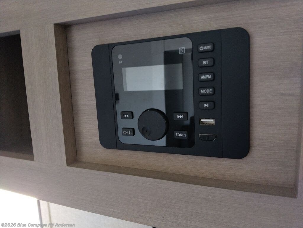 You'll love having your own space in this travel trailer thanks to the front bedroom with a queen bed, dual bedside wardrobes, and privacy curtain. A large slide out provides more space to move about, and there is theater seating here to relax in the evenings. You can make meals on the three-burner cooktop or in the microwave oven, and you can dine at the booth dinette. This unit also includes a 12V refrigerator and pantry for food storge plus ample overhead cabinets for your personal belongings.