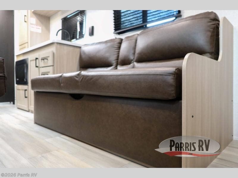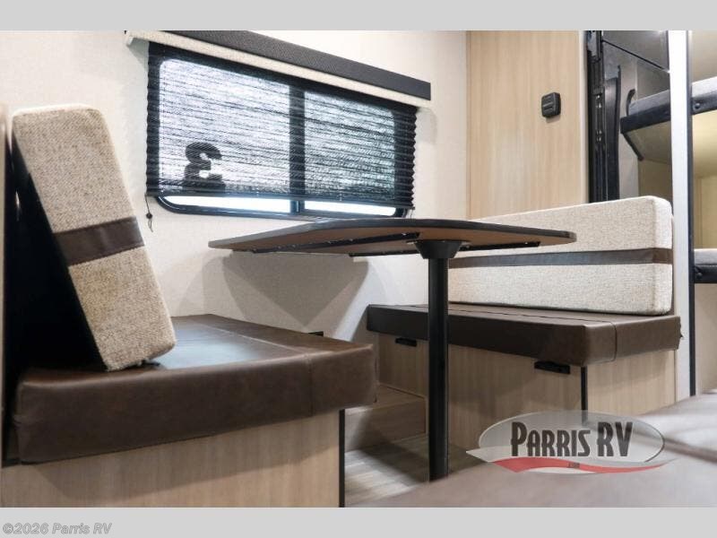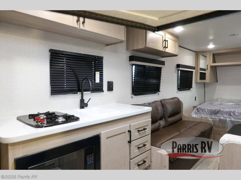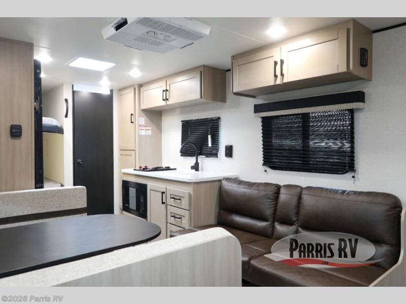 Camping trips are made easy in this Lynx Edition travel trailer with double-size bunk beds for guests or little ones. You'll find a front walk-around queen bed for a great night's rest, along with dual bedside wardrobes to keep your things tidy. The rear corner private bath includes a foot-flush toilet and a 40" shower, so you won't have to leave the camper in the middle of the night. A two-burner cooktop and microwave oven will let you make meals each day, and you'll find seating spaces at the booth dinette or on the sofa!
