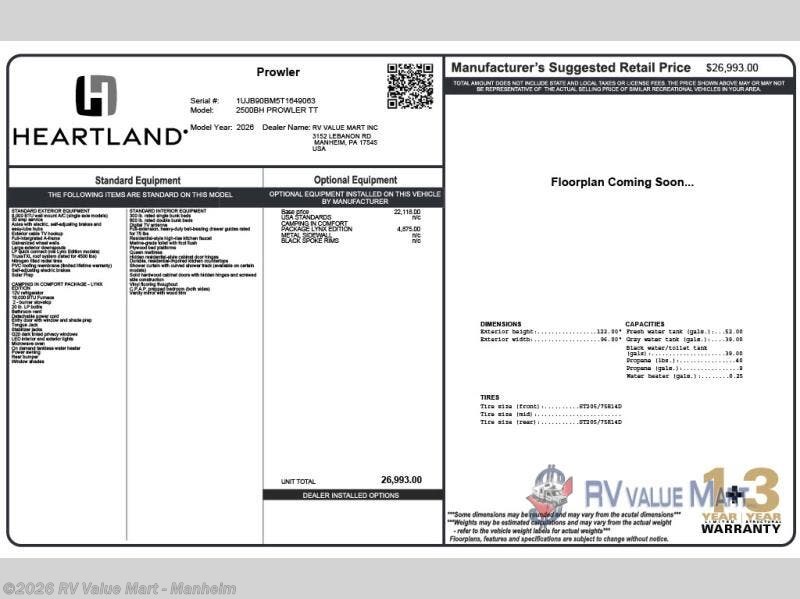 Request More Info on this 2026 Heartland Prowler 2500BH Offered for sale by RV Value Mart - Manheim