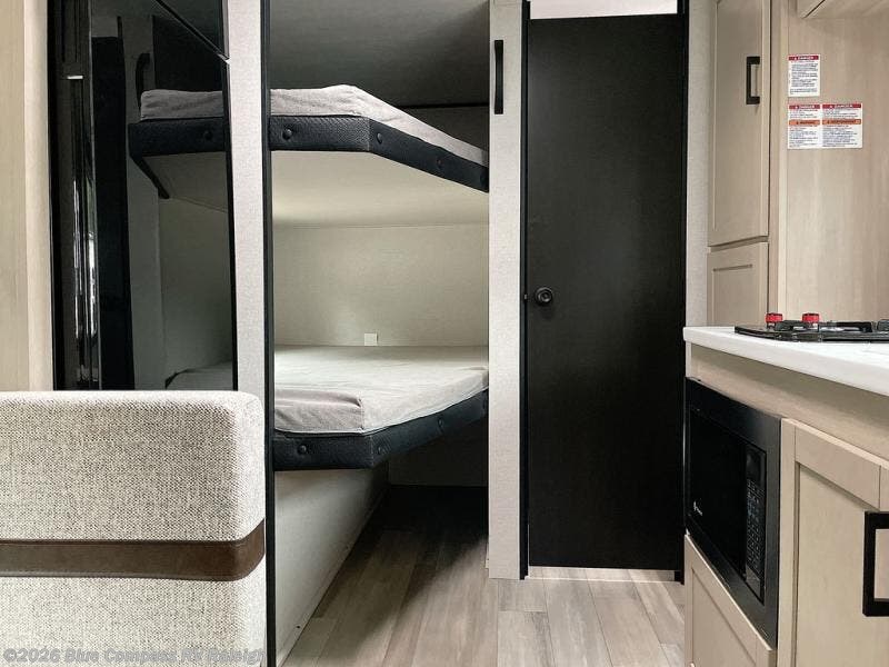 Camping trips are made easy in this Lynx Edition travel trailer with double-size bunk beds for guests or little ones. You'll find a front walk-around queen bed for a great night's rest, along with dual bedside wardrobes to keep your things tidy. The rear corner private bath includes a foot-flush toilet and a 40" shower, so you won't have to leave the camper in the middle of the night. A two-burner cooktop and microwave oven will let you make meals each day, and you'll find seating spaces at the booth dinette or on the sofa!