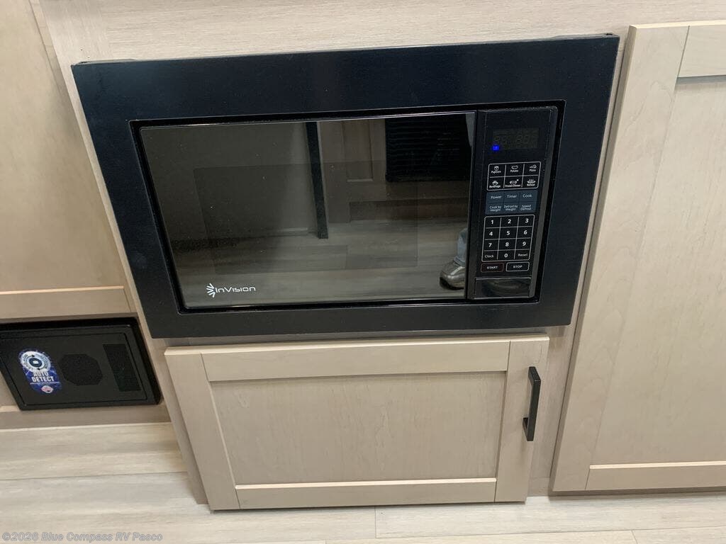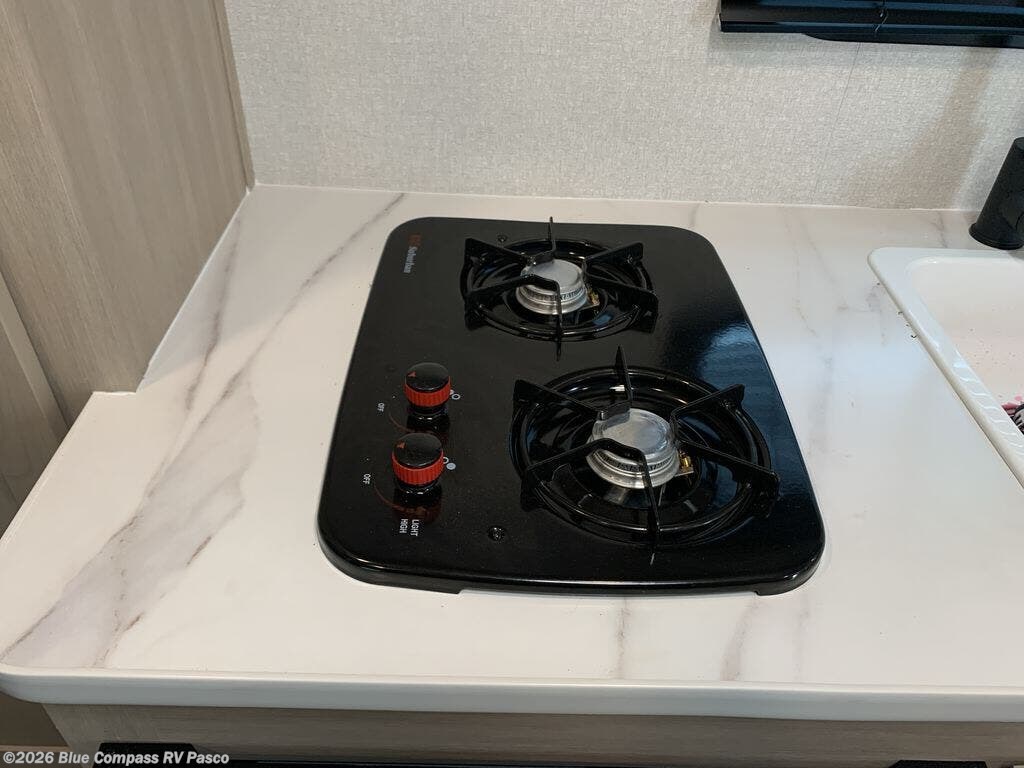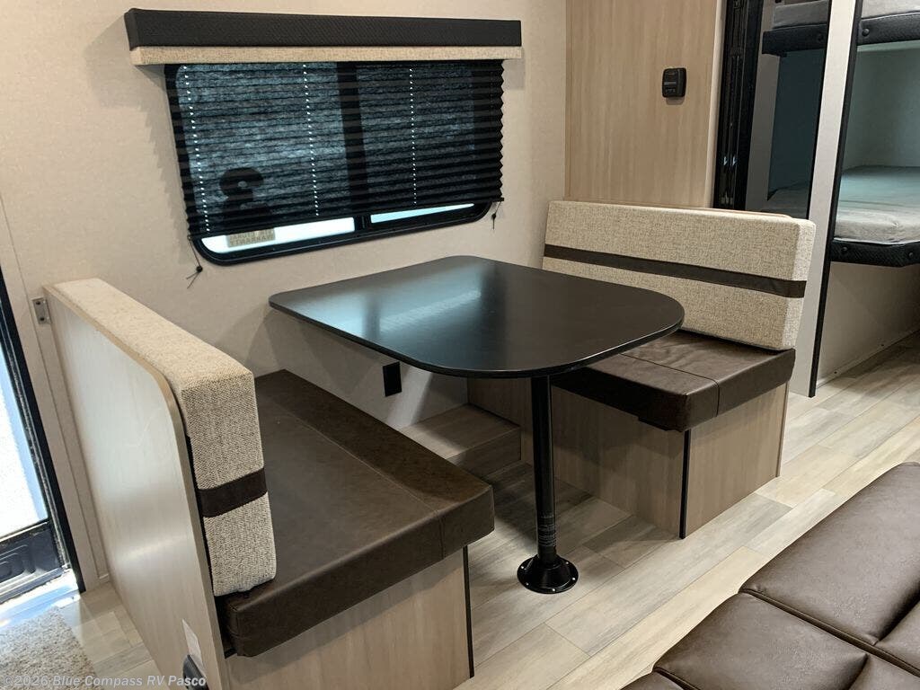 Camping trips are made easy in this Lynx Edition travel trailer with double-size bunk beds for guests or little ones. You'll find a front walk-around queen bed for a great night's rest, along with dual bedside wardrobes to keep your things tidy. The rear corner private bath includes a foot-flush toilet and a 40" shower, so you won't have to leave the camper in the middle of the night. A two-burner cooktop and microwave oven will let you make meals each day, and you'll find seating spaces at the booth dinette or on the sofa!