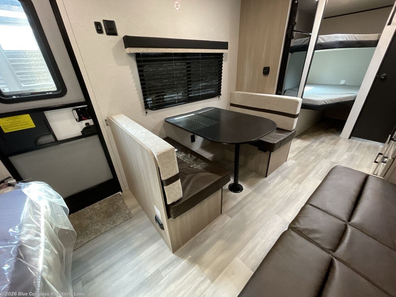 Camping trips are made easy in this Lynx Edition travel trailer with double-size bunk beds for guests or little ones. You'll find a front walk-around queen bed for a great night's rest, along with dual bedside wardrobes to keep your things tidy. The rear corner private bath includes a foot-flush toilet and a 40" shower, so you won't have to leave the camper in the middle of the night. A two-burner cooktop and microwave oven will let you make meals each day, and you'll find seating spaces at the booth dinette or on the sofa!