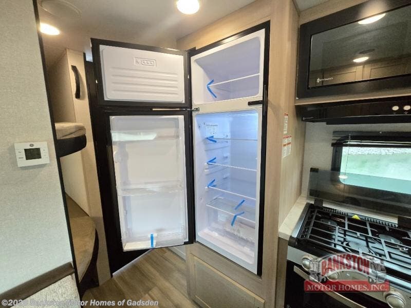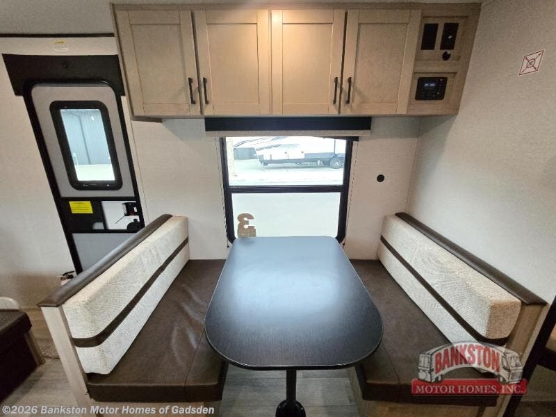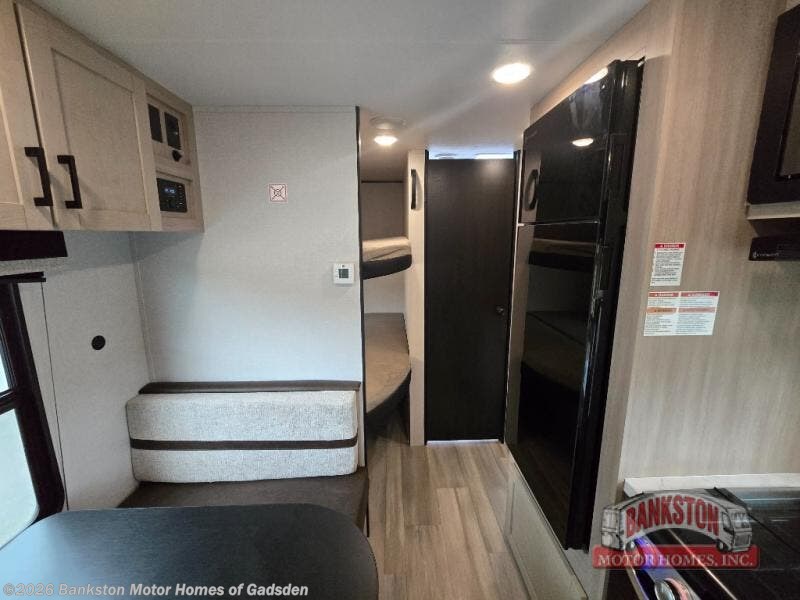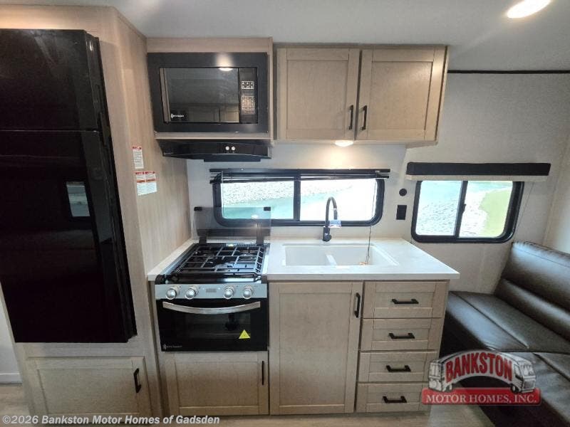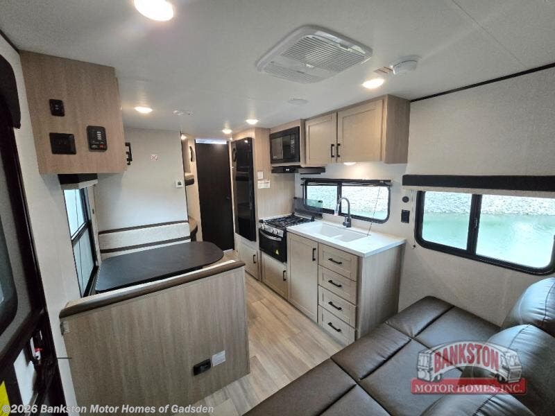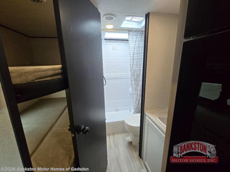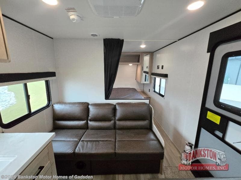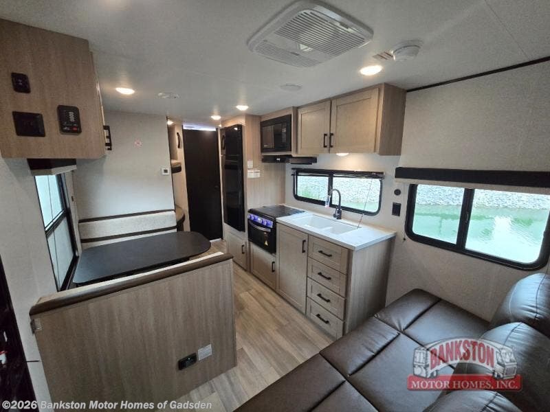 Camping trips are made easy in this spacious travel trailer with double-size bunk beds for guests or little ones. You'll find a front walk-around queen bed for a great night's rest, along with dual bedside wardrobes to keep your things tidy and a privacy curtain. The rear corner private bath includes a foot-flush toilet and a 24" x 40" shower, so you won't have to leave the camper in the middle of the night. A three-burner cooktop and microwave oven will let you make meals each day, and you'll find seating spaces at the booth dinette or on the sofa!