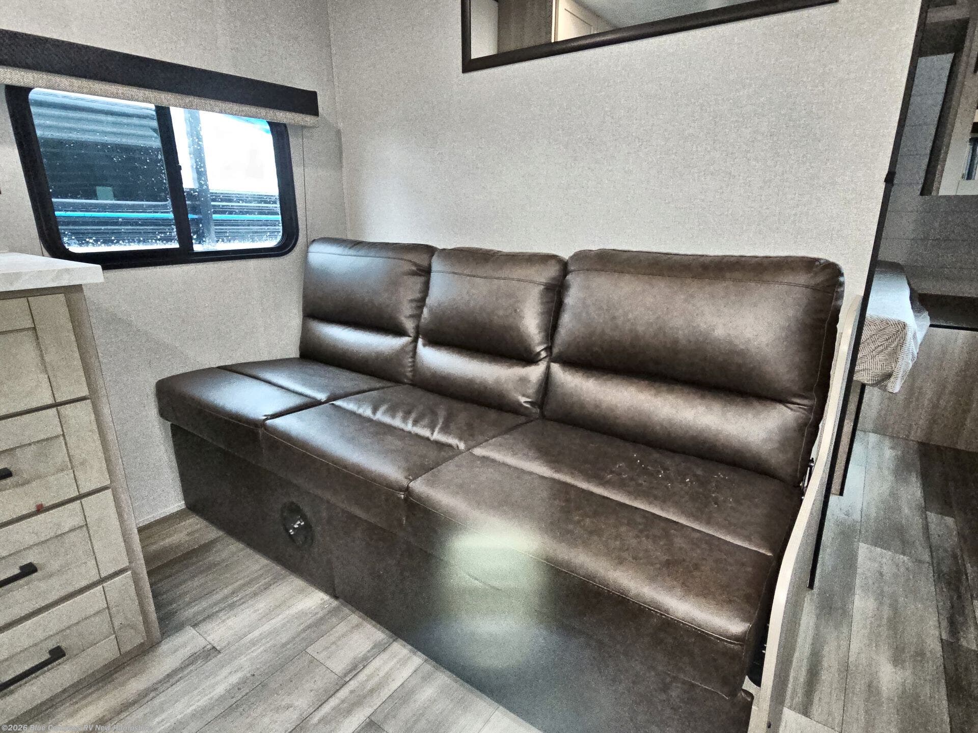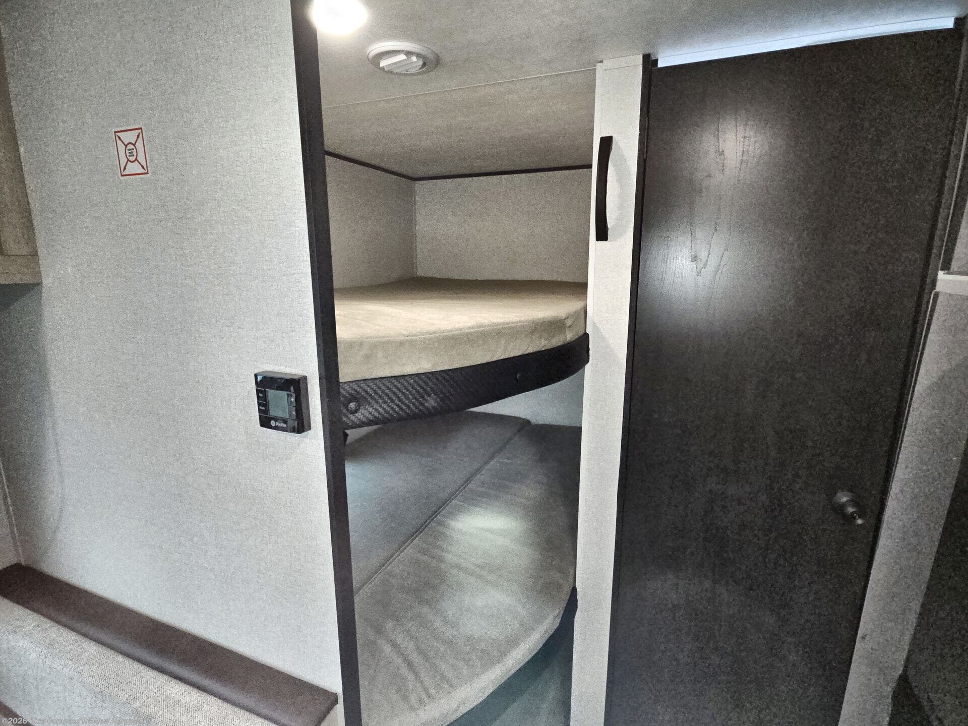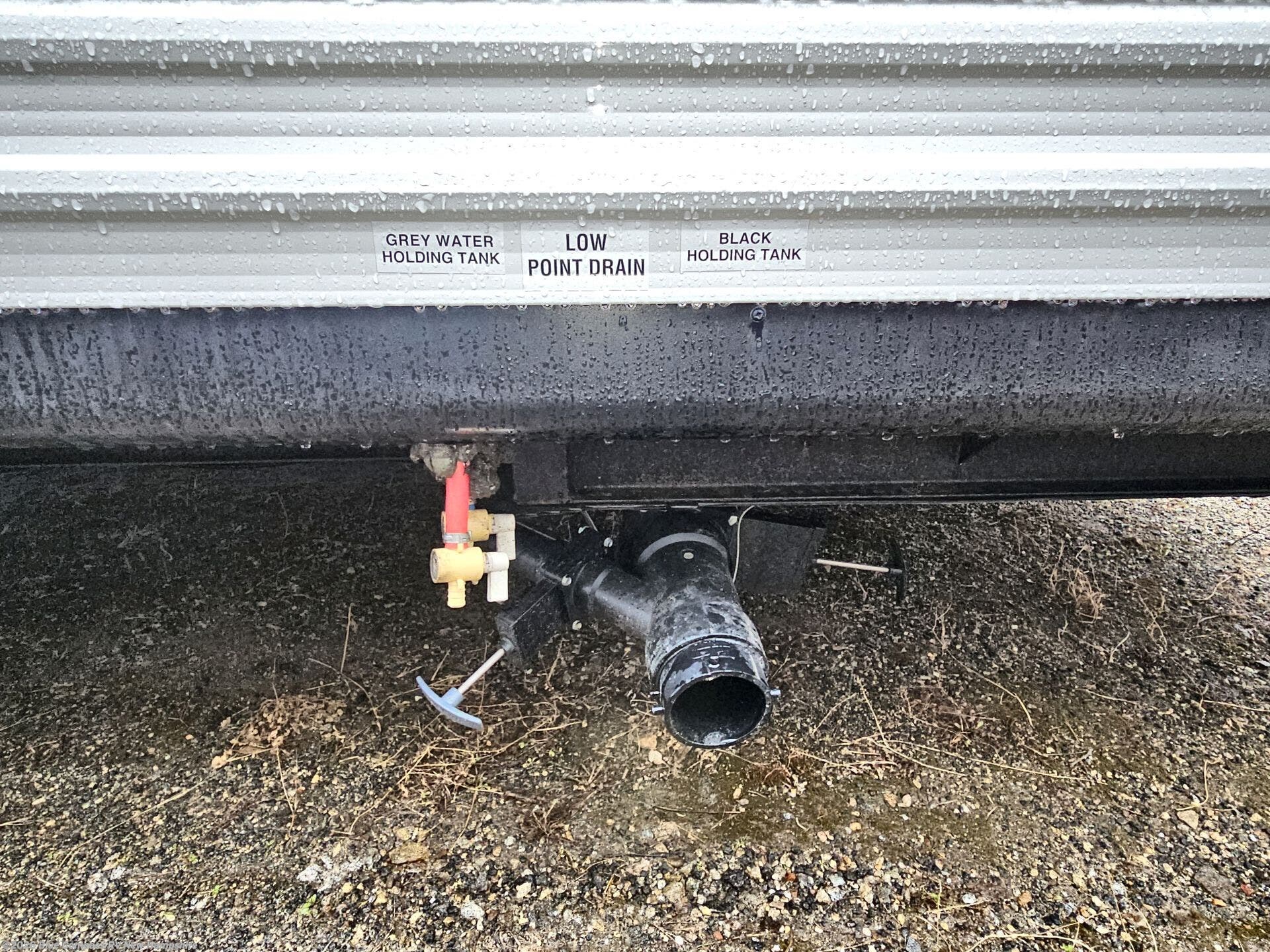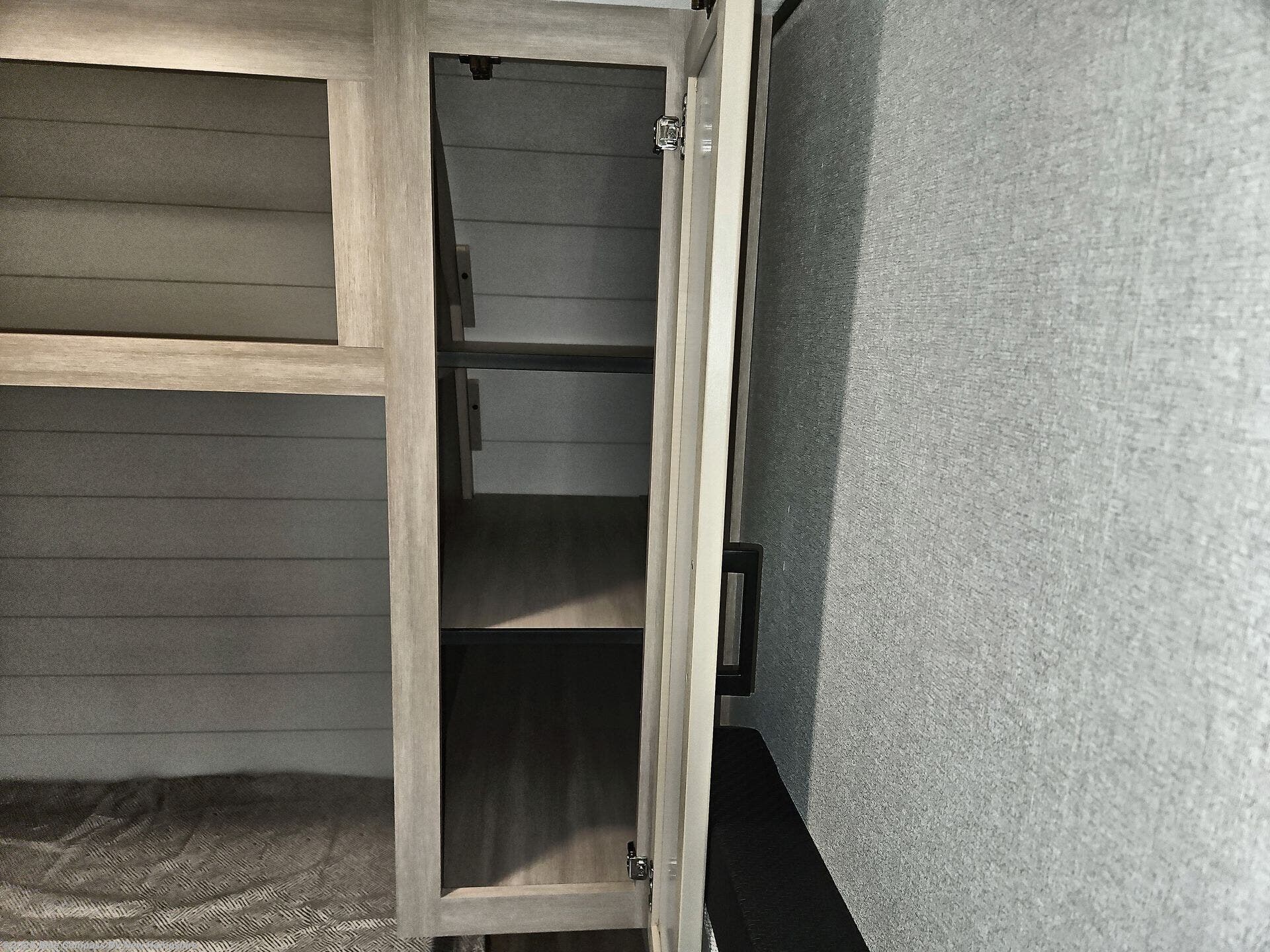 Camping trips are made easy in this spacious travel trailer with double-size bunk beds for guests or little ones. You'll find a front walk-around queen bed for a great night's rest, along with dual bedside wardrobes to keep your things tidy and a privacy curtain. The rear corner private bath includes a foot-flush toilet and a 24" x 40" shower, so you won't have to leave the camper in the middle of the night. A three-burner cooktop and microwave oven will let you make meals each day, and you'll find seating spaces at the booth dinette or on the sofa!