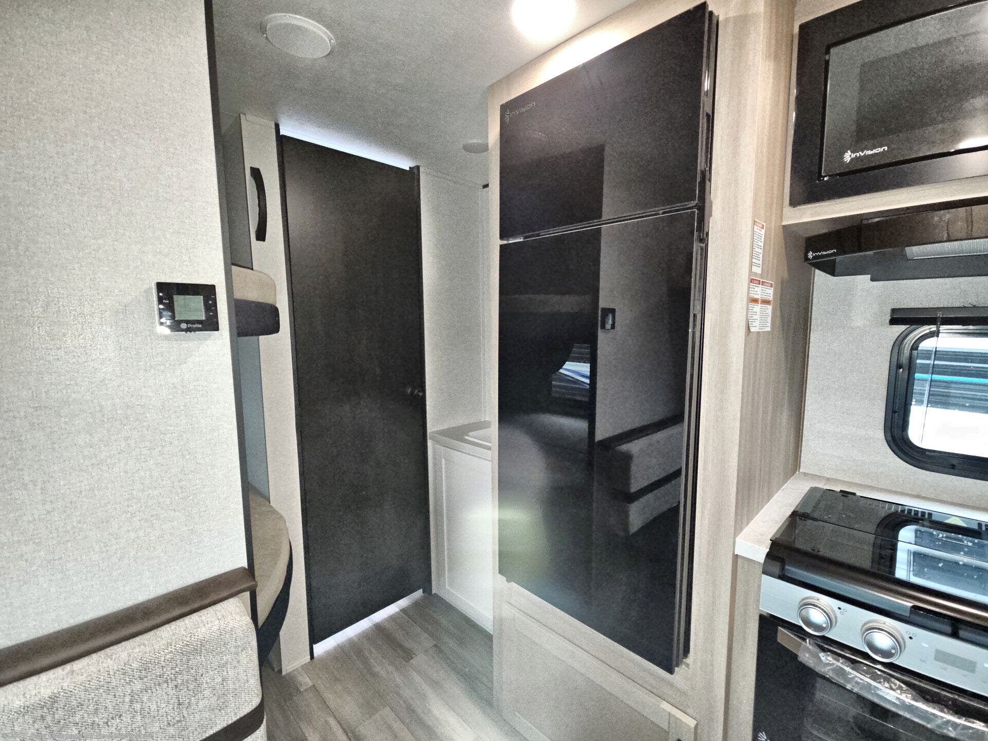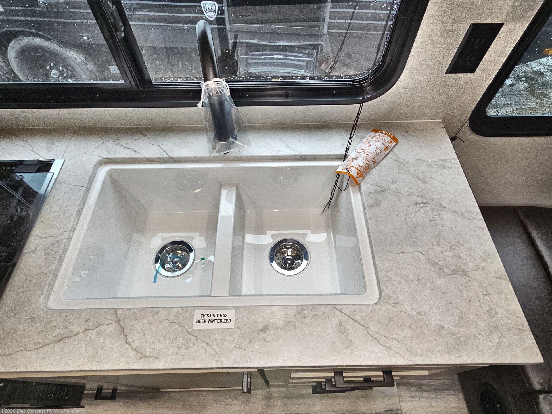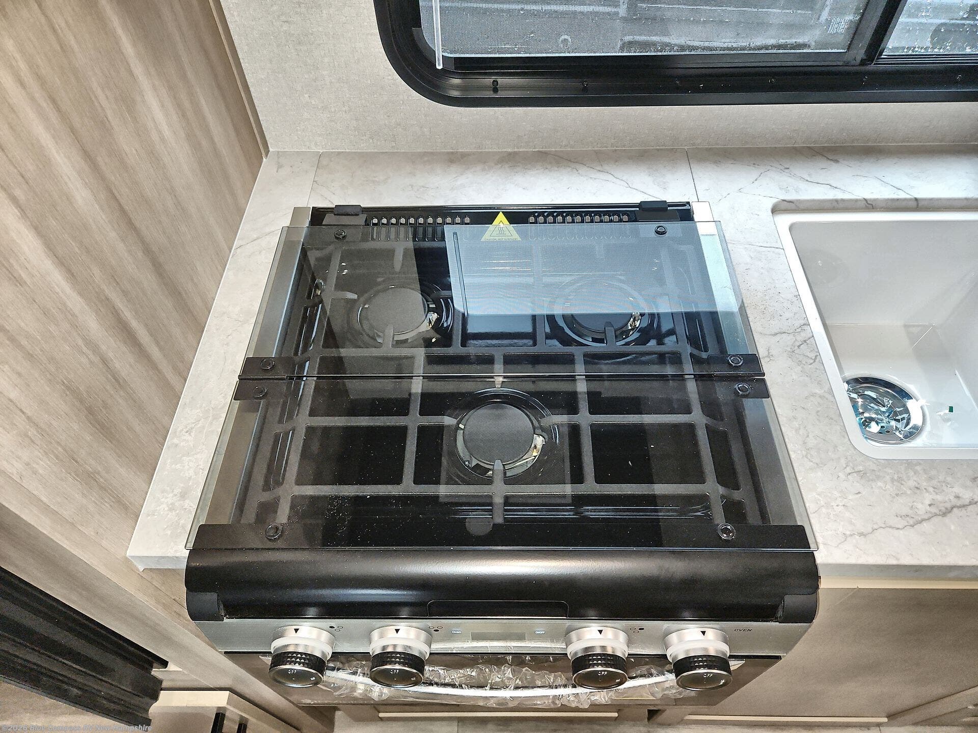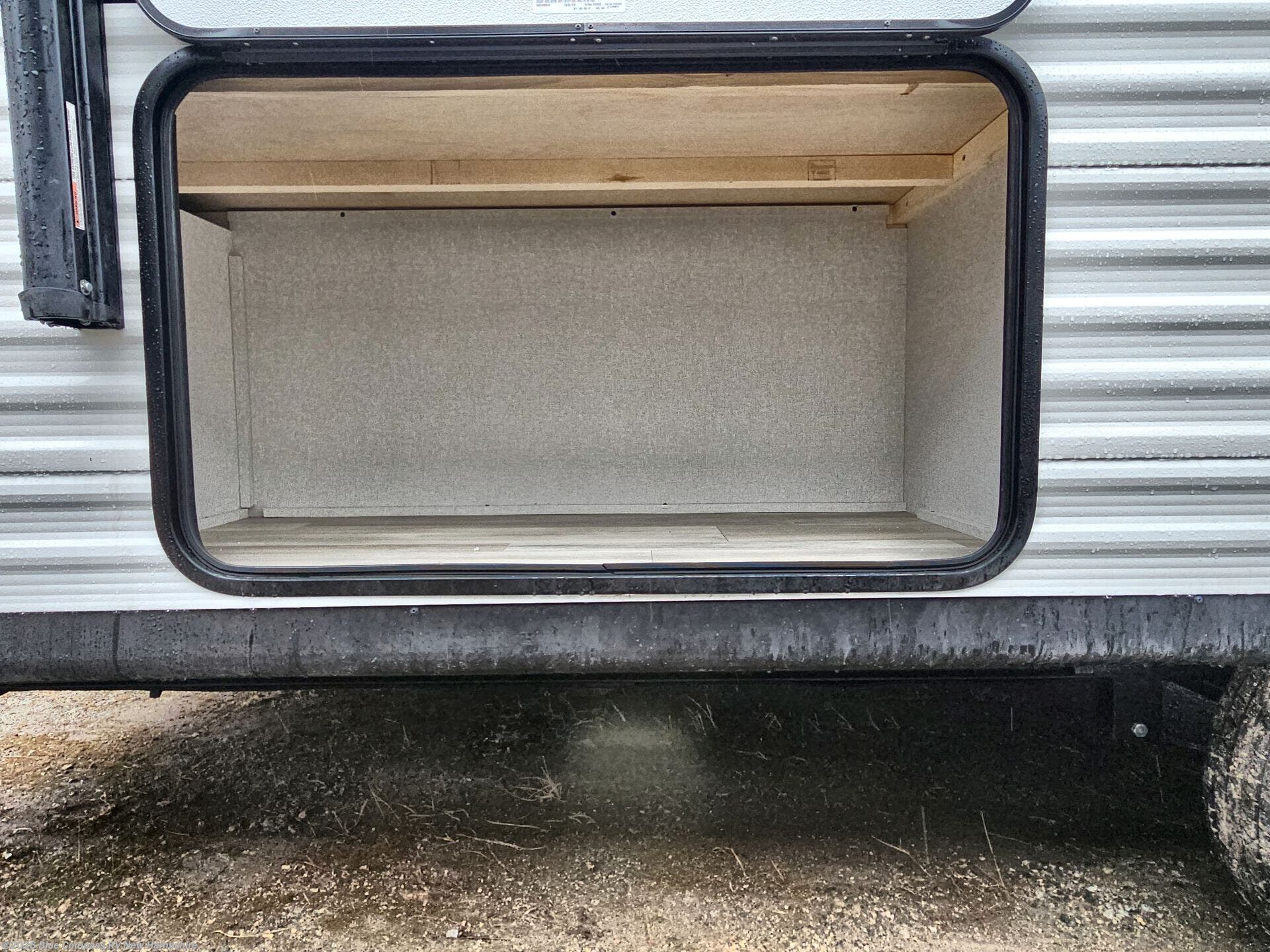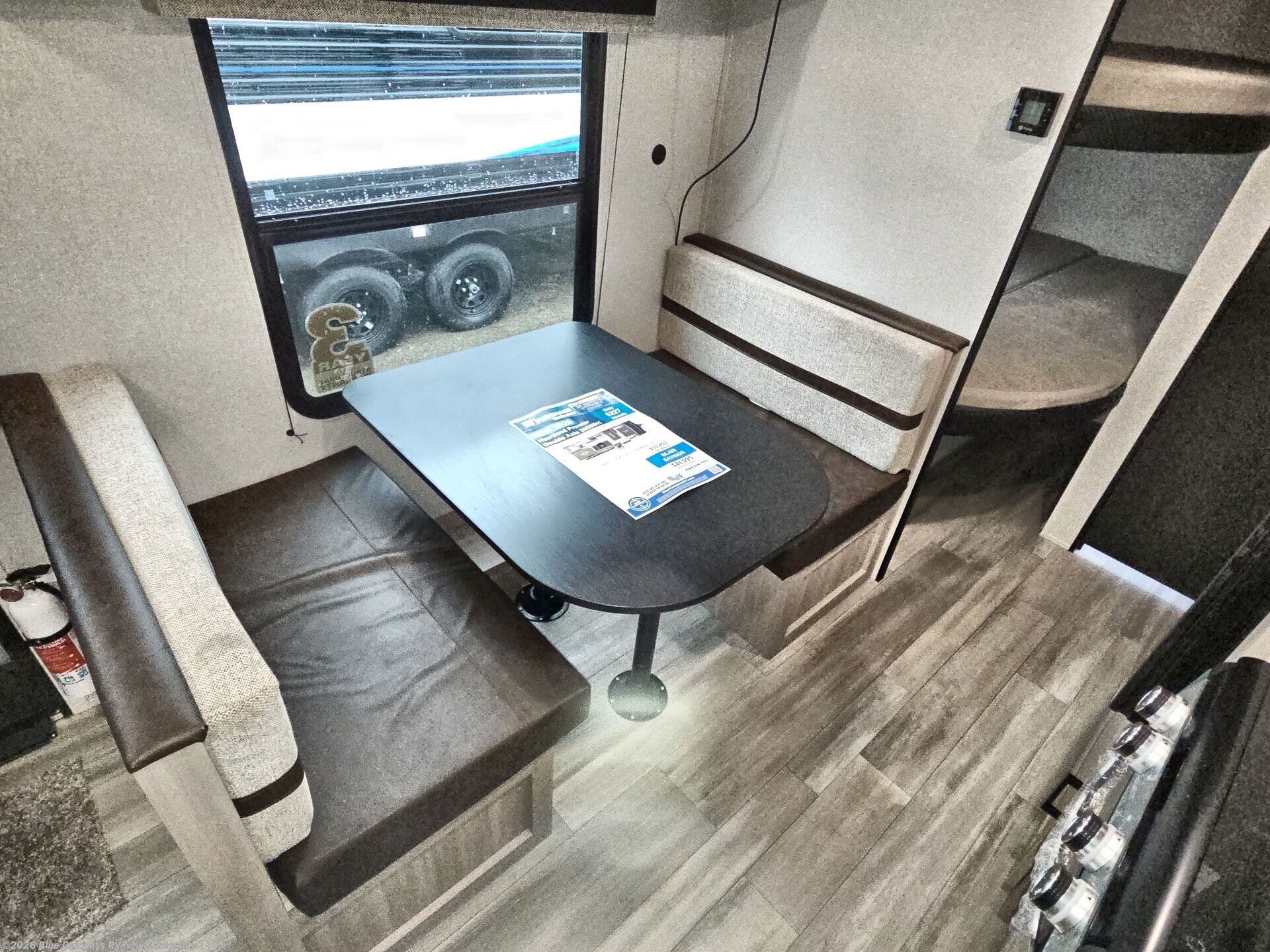 Camping trips are made easy in this spacious travel trailer with double-size bunk beds for guests or little ones. You'll find a front walk-around queen bed for a great night's rest, along with dual bedside wardrobes to keep your things tidy and a privacy curtain. The rear corner private bath includes a foot-flush toilet and a 24" x 40" shower, so you won't have to leave the camper in the middle of the night. A three-burner cooktop and microwave oven will let you make meals each day, and you'll find seating spaces at the booth dinette or on the sofa!