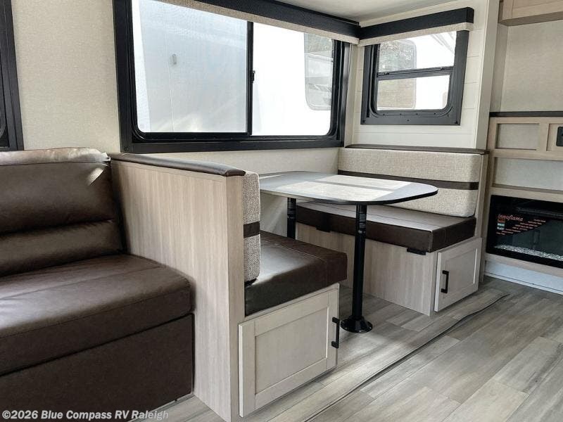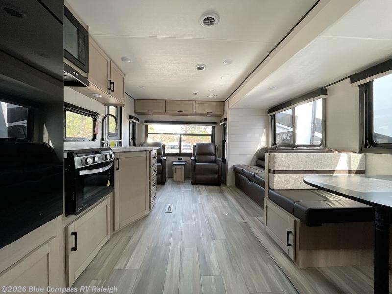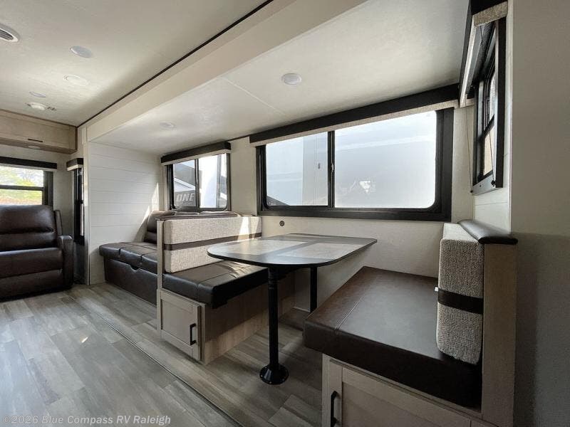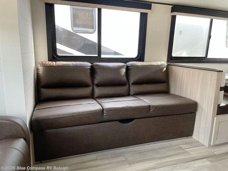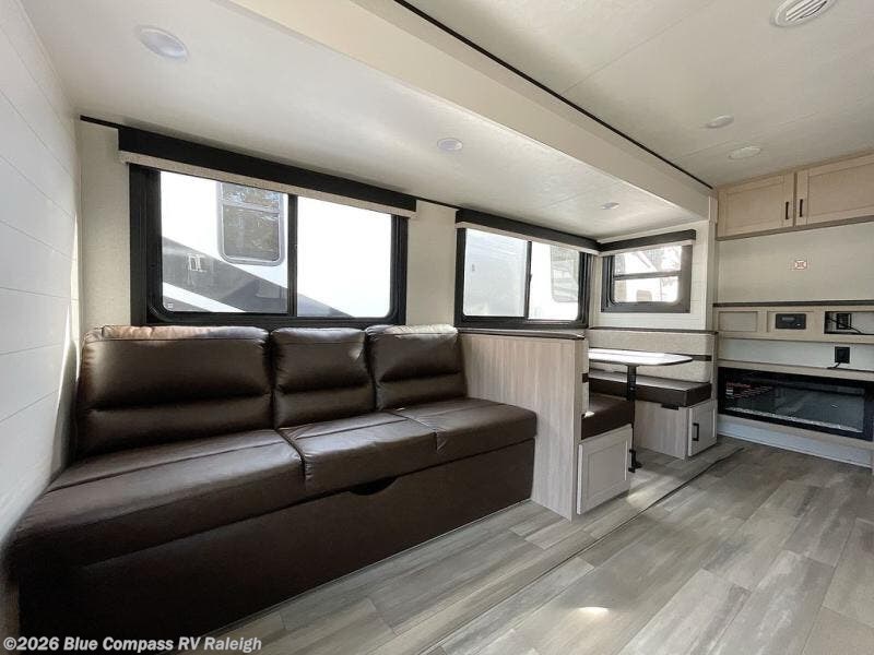 Time spent in this spacious travel trailer will be time well spent! Once you arrive at your campsite, you can put out the 18' power awning and relax in your camp chairs. The dual entry doors will allow you to enter in through the rear living room with dual lounge chairs, or the front private bedroom with an RV queen bed! The chef of your group can make lunch on the three-burner cooktop or in the microwave oven, and there is a booth dinette where you can dine together. Your guests can convert the dinette to sleeping space at night, along with the jack-knife sofa!