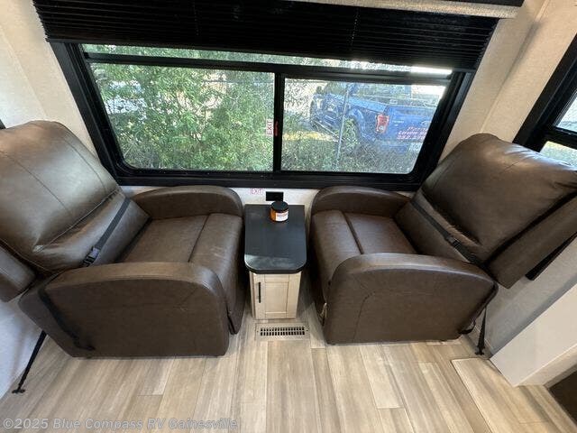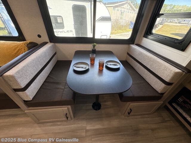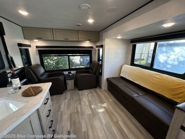 Time spent in this spacious travel trailer will be time well spent! Once you arrive at your campsite, you can put out the 18' power awning and relax in your camp chairs. The dual entry doors will allow you to enter in through the rear living room with dual lounge chairs, or the front private bedroom with an RV queen bed! The chef of your group can make lunch on the three-burner cooktop or in the microwave oven, and there is a booth dinette where you can dine together. Your guests can convert the dinette to sleeping space at night, along with the jack-knife sofa!