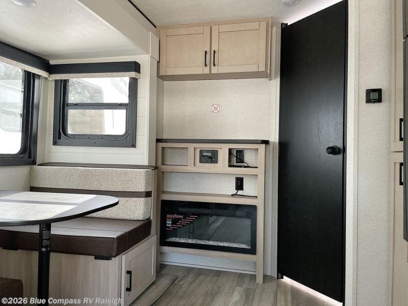 Time spent in this spacious travel trailer will be time well spent! Once you arrive at your campsite, you can put out the 18' power awning and relax in your camp chairs. The dual entry doors will allow you to enter in through the rear living room with dual lounge chairs, or the front private bedroom with an RV queen bed! The chef of your group can make lunch on the three-burner cooktop or in the microwave oven, and there is a booth dinette where you can dine together. Your guests can convert the dinette to sleeping space at night, along with the jack-knife sofa!