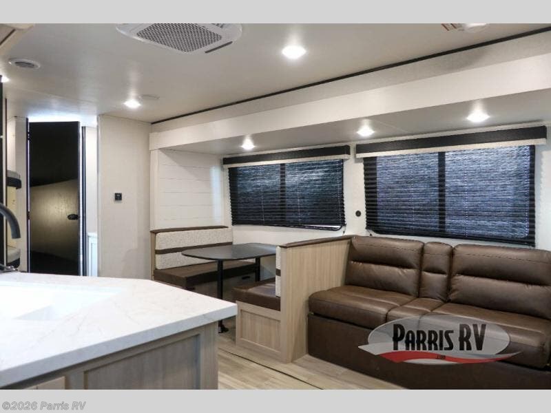 The whole gang will love weekends in the woods with this travel trailer in tow! There is a large slide out for added space, and here you'll find the jack-knife sofa and booth dinette. You can claim the front private bedroom to yourselves, while your guests or little ones take the double-size bunks. A full kitchen is complete with a three-burner cooktop and microwave oven to make meals each day, plus a 12V refrigerator and pantry for food storage. This unit also includes an outdoor kitchen with a refrigerator to keep cold drinks ready to enjoy!