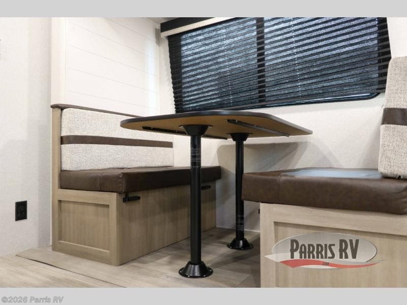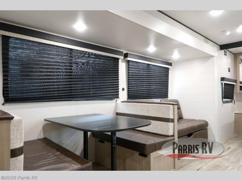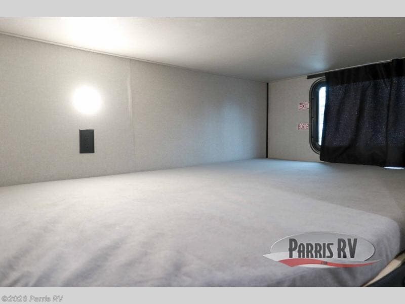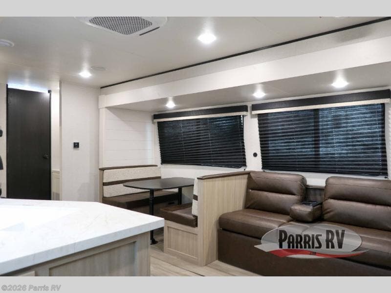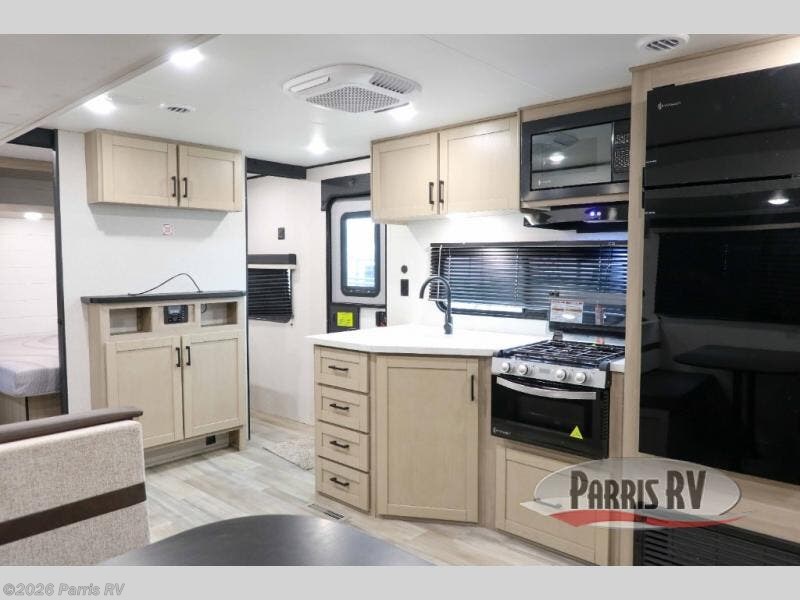 The whole gang will love weekends in the woods with this travel trailer in tow! There is a large slide out for added space, and here you'll find the jack-knife sofa and booth dinette. You can claim the front private bedroom to yourselves, while your guests or little ones take the double-size bunks. A full kitchen is complete with a three-burner cooktop and microwave oven to make meals each day, plus a 12V refrigerator and pantry for food storage. This unit also includes an outdoor kitchen with a refrigerator to keep cold drinks ready to enjoy!
