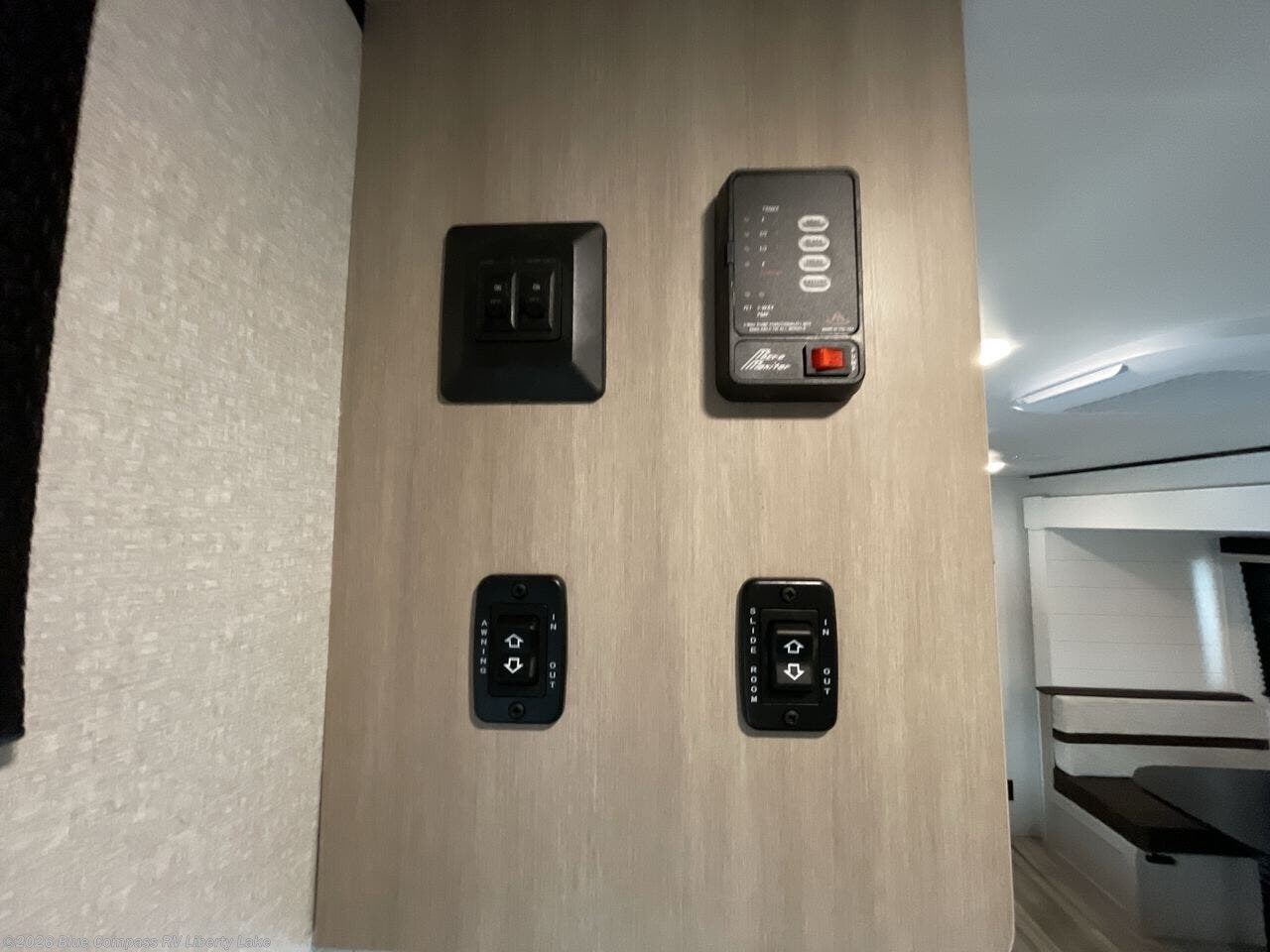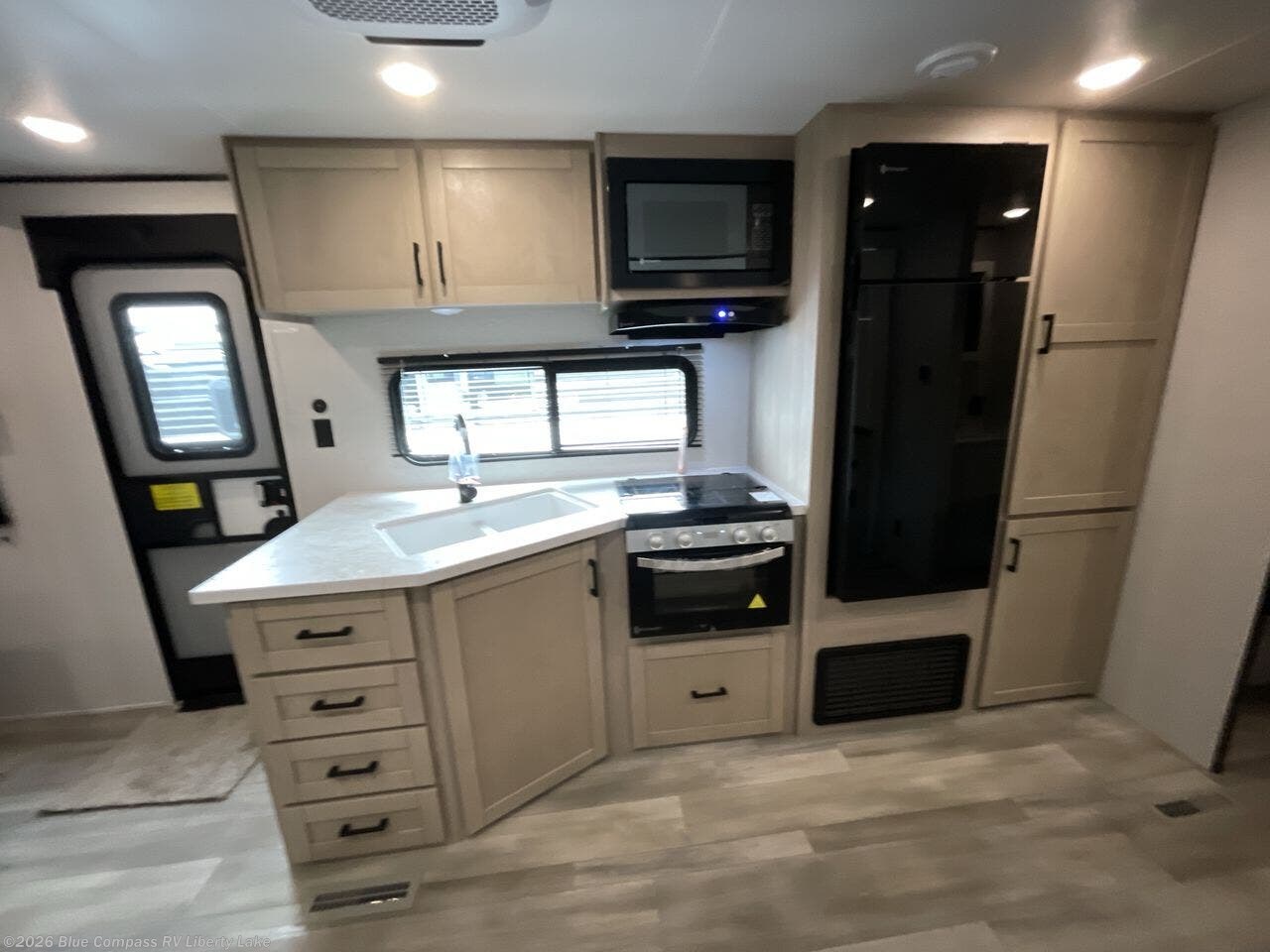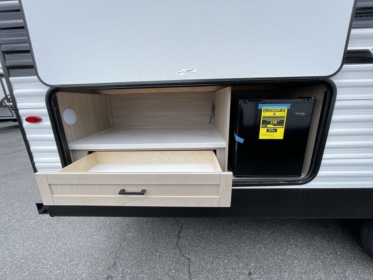 The whole gang will love weekends in the woods with this travel trailer in tow! There is a large slide out for added space, and here you'll find the jack-knife sofa and booth dinette. You can claim the front private bedroom to yourselves, while your guests or little ones take the double-size bunks. A full kitchen is complete with a three-burner cooktop and microwave oven to make meals each day, plus a 12V refrigerator and pantry for food storage. This unit also includes an outdoor kitchen with a refrigerator to keep cold drinks ready to enjoy!