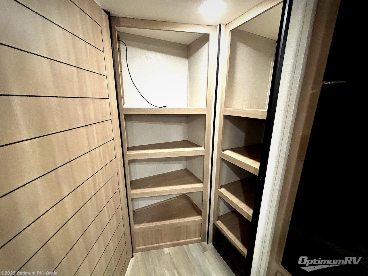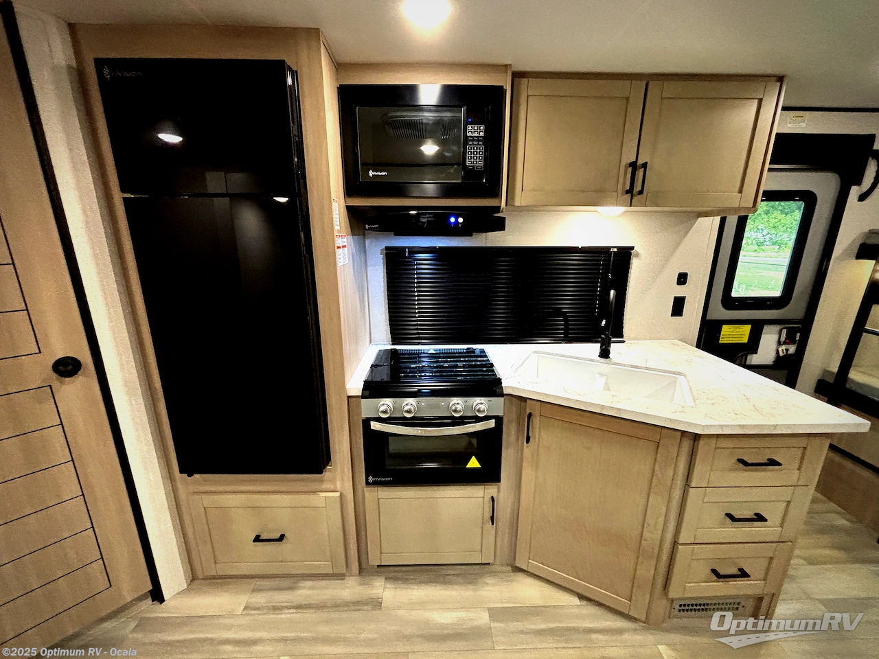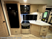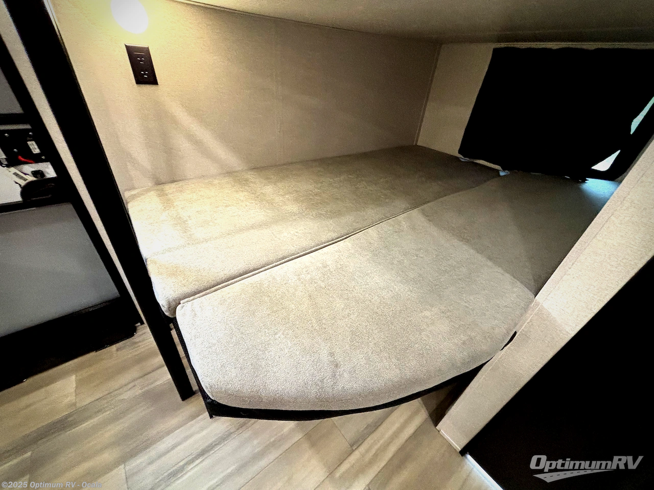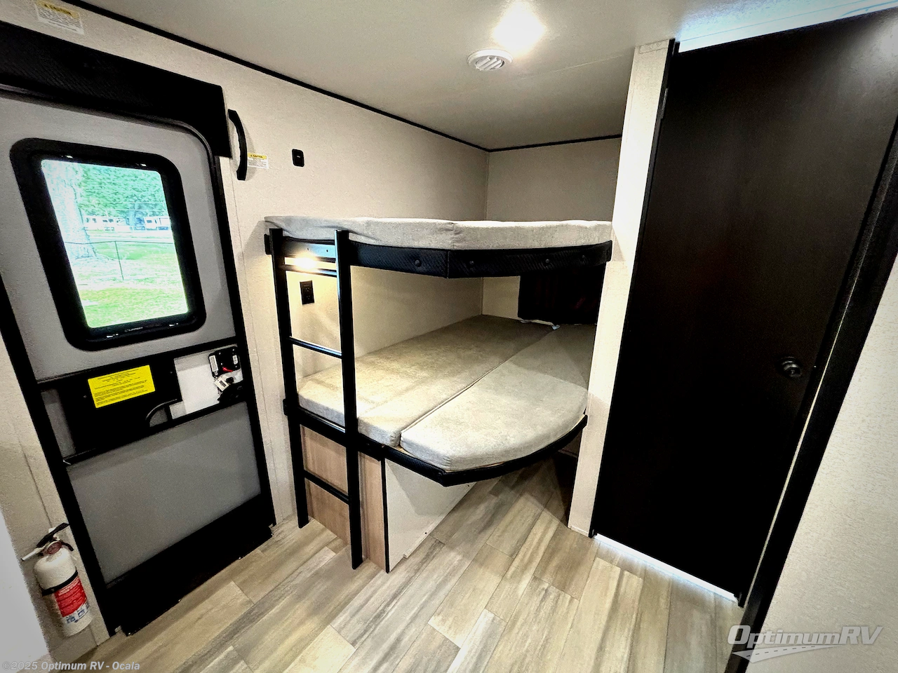 The whole gang will love weekends in the woods with this travel trailer in tow! There is a large slide out for added space, and here you'll find the jack-knife sofa and booth dinette. There is also an entertainment center with a fireplace with a hidden pantry behind, along with storage shelves for snacks, board games and more! You can claim the front private bedroom to yourselves, while your guests or little ones take the double-size bunks. A full kitchen is complete with a three-burner cooktop and microwave oven to make meals each day, plus a 12V refrigerator and pantry for food storage. This unit also includes an outdoor kitchen with a refrigerator to keep cold drinks ready to enjoy!