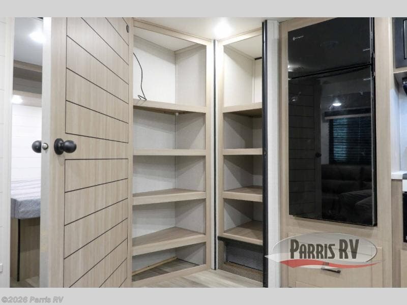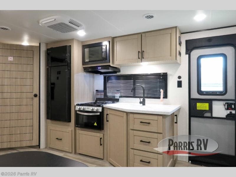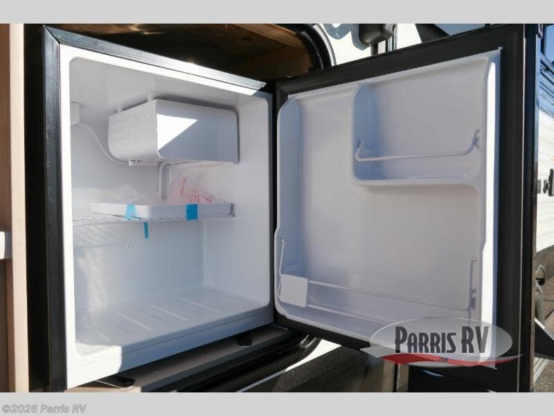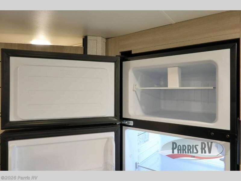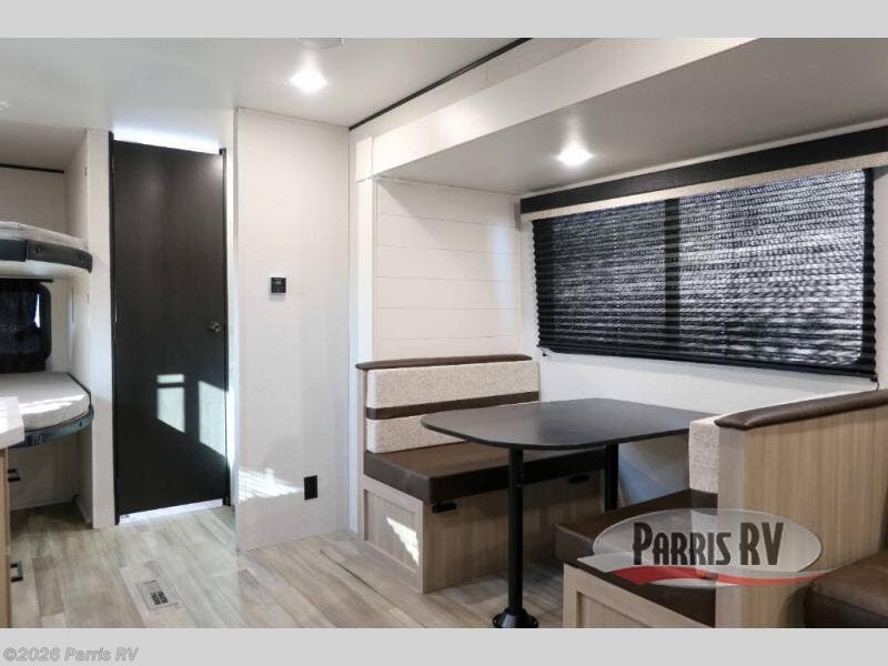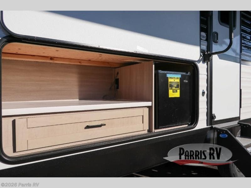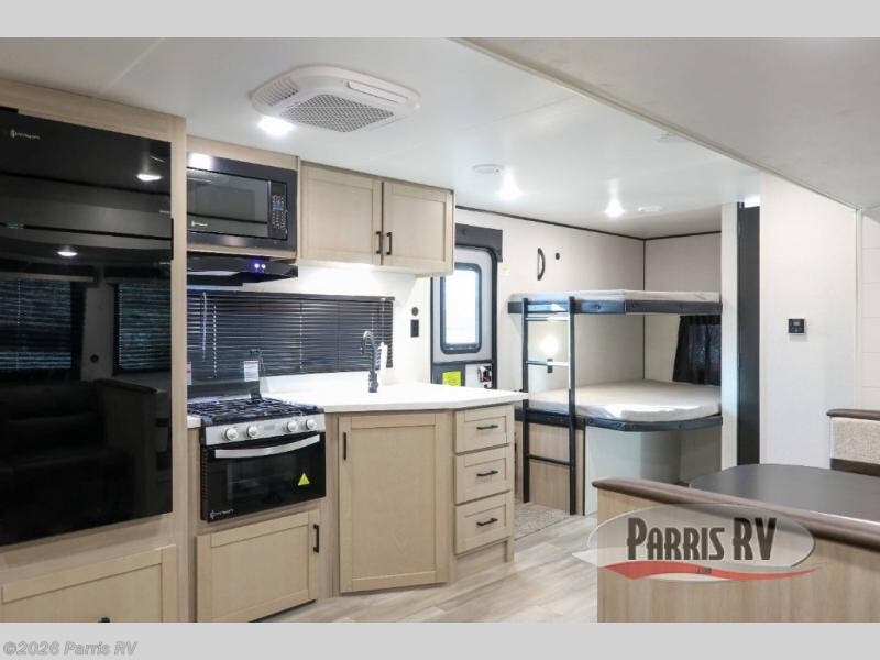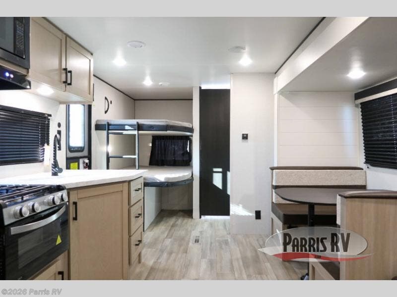 The whole gang will love weekends in the woods with this travel trailer in tow! There is a large slide out for added space, and here you'll find the jack-knife sofa and booth dinette. There is also an entertainment center with a fireplace with a hidden pantry behind, along with storage shelves for snacks, board games and more! You can claim the front private bedroom to yourselves, while your guests or little ones take the double-size bunks. A full kitchen is complete with a three-burner cooktop and microwave oven to make meals each day, plus a 12V refrigerator and pantry for food storage. This unit also includes an outdoor kitchen with a refrigerator to keep cold drinks ready to enjoy!