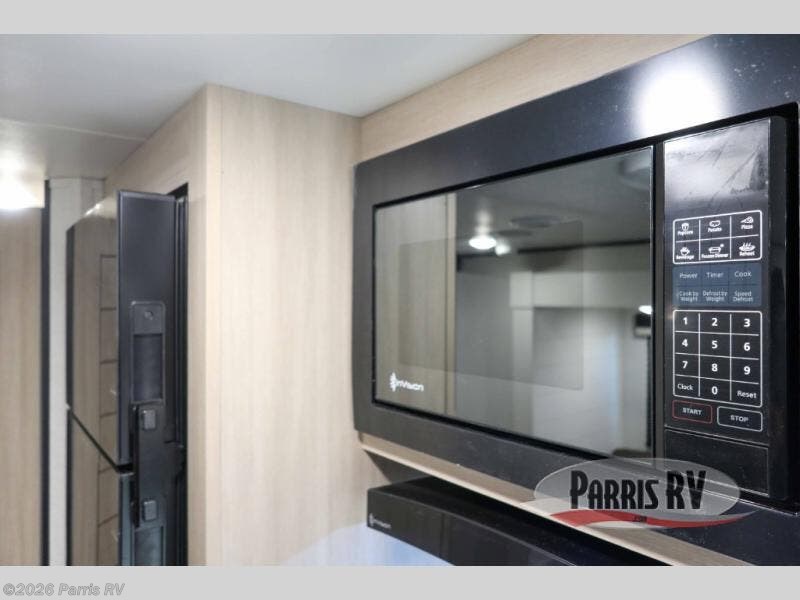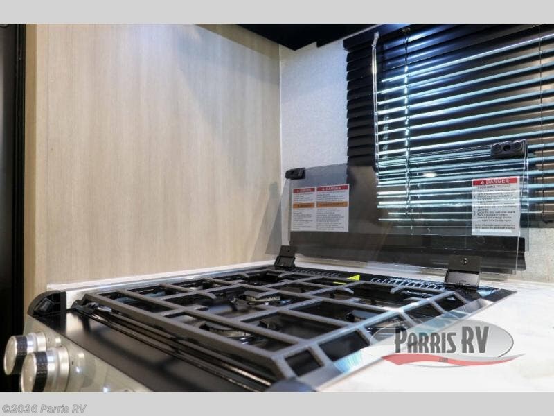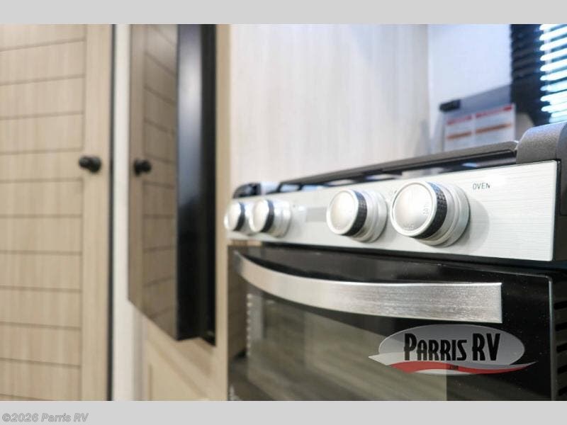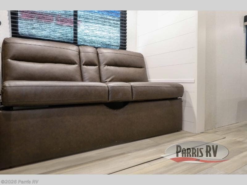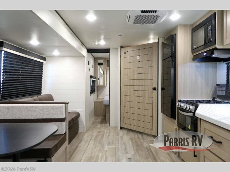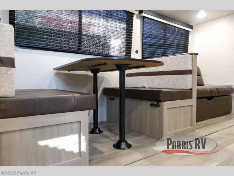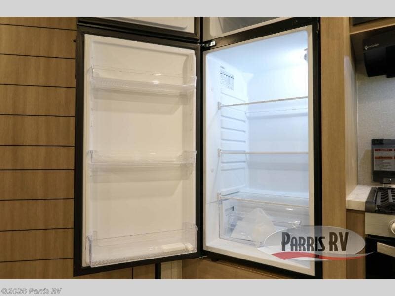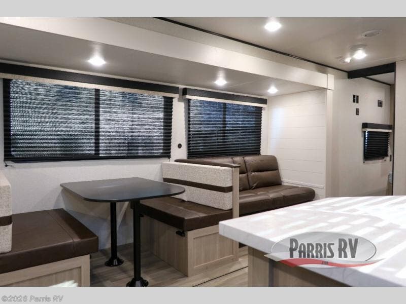 The whole gang will love weekends in the woods with this travel trailer in tow! There is a large slide out for added space, and here you'll find the jack-knife sofa and booth dinette. There is also an entertainment center with a fireplace with a hidden pantry behind, along with storage shelves for snacks, board games and more! You can claim the front private bedroom to yourselves, while your guests or little ones take the double-size bunks. A full kitchen is complete with a three-burner cooktop and microwave oven to make meals each day, plus a 12V refrigerator and pantry for food storage. This unit also includes an outdoor kitchen with a refrigerator to keep cold drinks ready to enjoy!