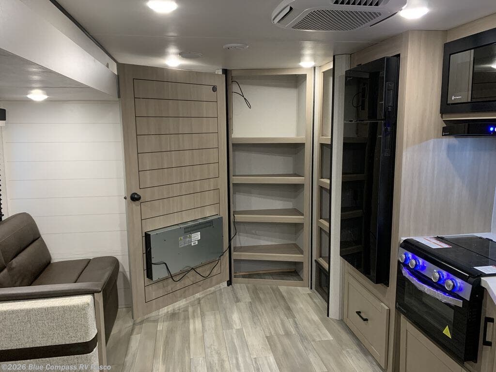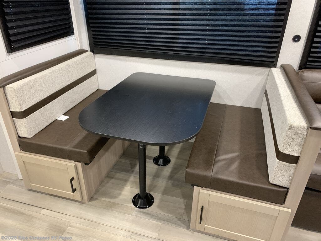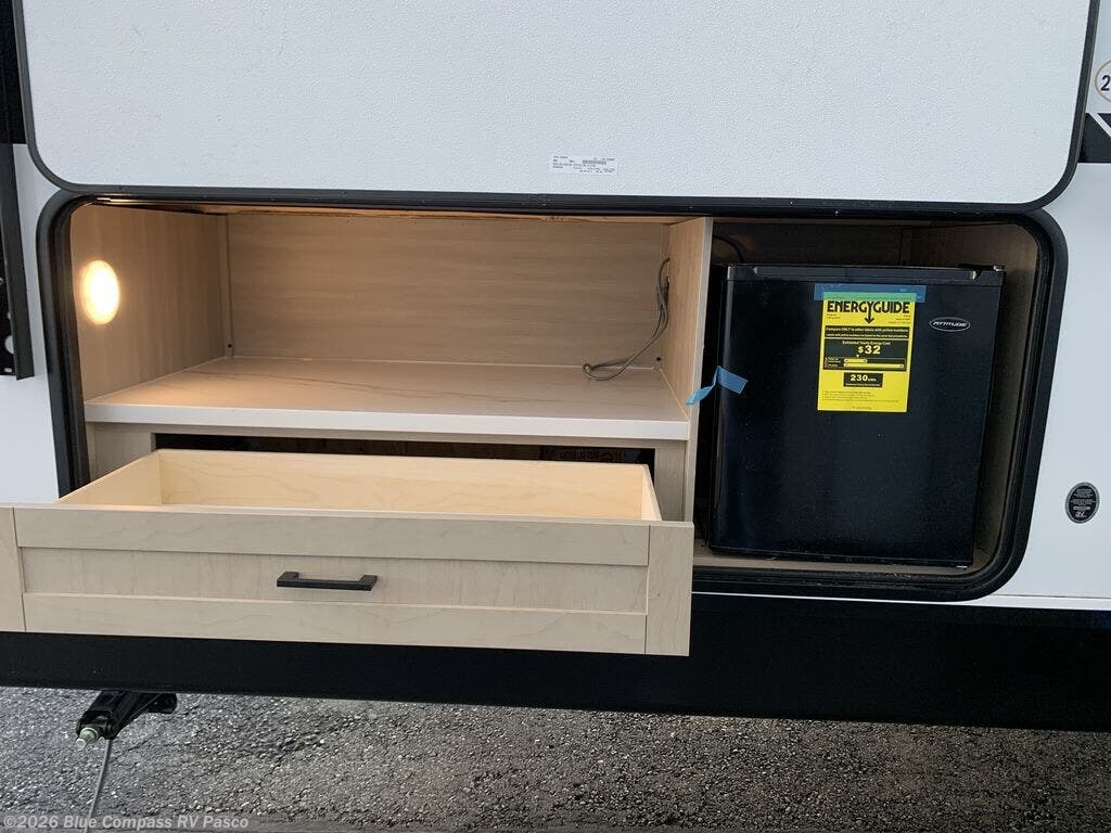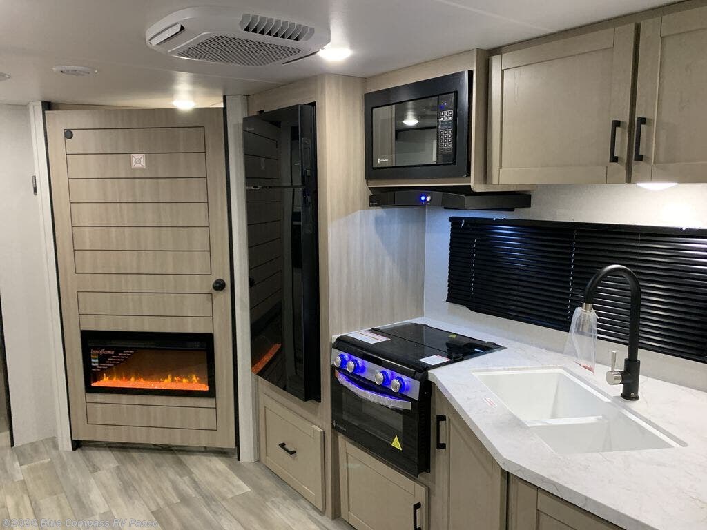 The whole gang will love weekends in the woods with this travel trailer in tow! There is a large slide out for added space, and here you'll find the jack-knife sofa and booth dinette. There is also an entertainment center with a fireplace with a hidden pantry behind, along with storage shelves for snacks, board games and more! You can claim the front private bedroom to yourselves, while your guests or little ones take the double-size bunks. A full kitchen is complete with a three-burner cooktop and microwave oven to make meals each day, plus a 12V refrigerator and pantry for food storage. This unit also includes an outdoor kitchen with a refrigerator to keep cold drinks ready to enjoy!