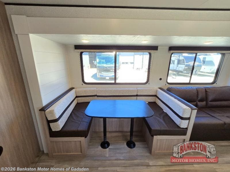 You'll enjoy more space and more fun in this travel trailer with double slides, a private bunkhouse, and an outdoor kitchen with a refrigerator. The bunkhouse includes a set of bunk beds across from a third bunk and a J-cube sofa within a slide. There is also an entertainment center here and a fireplace to make this space cozier. And the full bath with its own exterior entry door is close by the bunkhouse for easy nighttime use! The second slide out is found in the combined kitchen and living room, which houses the U-shaped dinette and jack-knife sofa. Since you'll be camping with a larger group of friends or family, the front private bedroom with an RV queen bed and dual wardrobes will provide you with privacy each night!