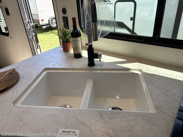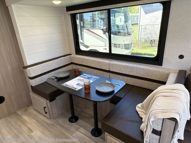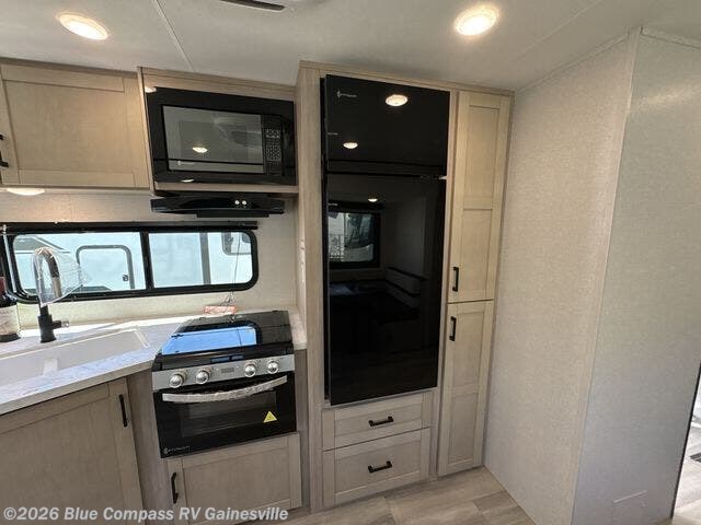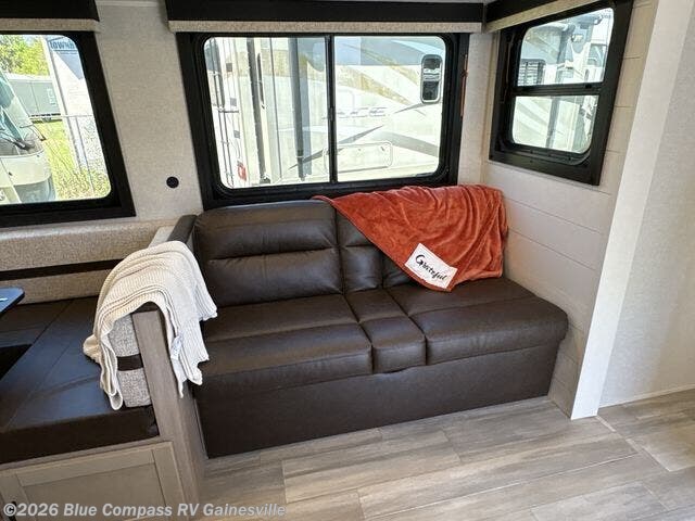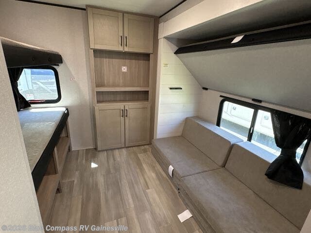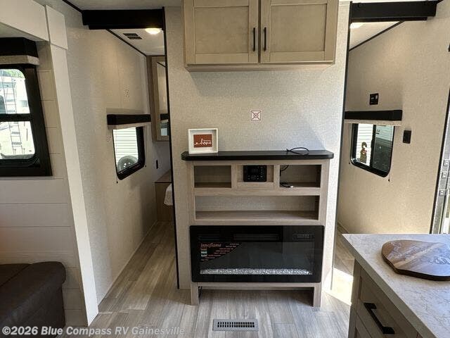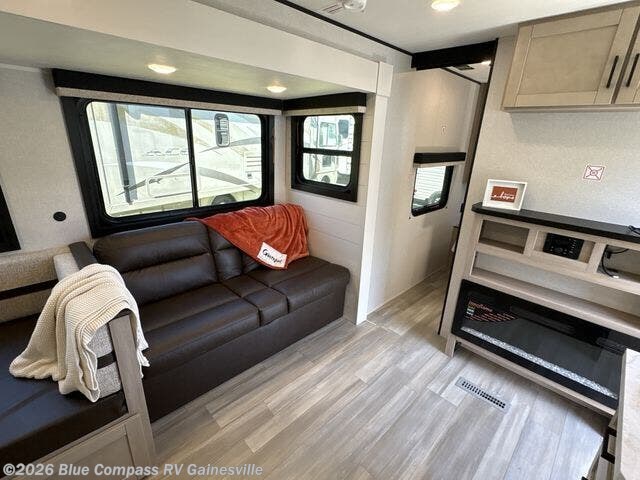 You'll enjoy more space and more fun in this travel trailer with double slides, a private bunkhouse, and an outdoor kitchen with a refrigerator. The bunkhouse includes a set of bunk beds across from a third bunk and a J-cube sofa within a slide. There is also an entertainment center here and a fireplace to make this space cozier. And the full bath with its own exterior entry door is close by the bunkhouse for easy nighttime use! The second slide out is found in the combined kitchen and living room, which houses the U-shaped dinette and jack-knife sofa. Since you'll be camping with a larger group of friends or family, the front private bedroom with an RV queen bed and dual wardrobes will provide you with privacy each night!