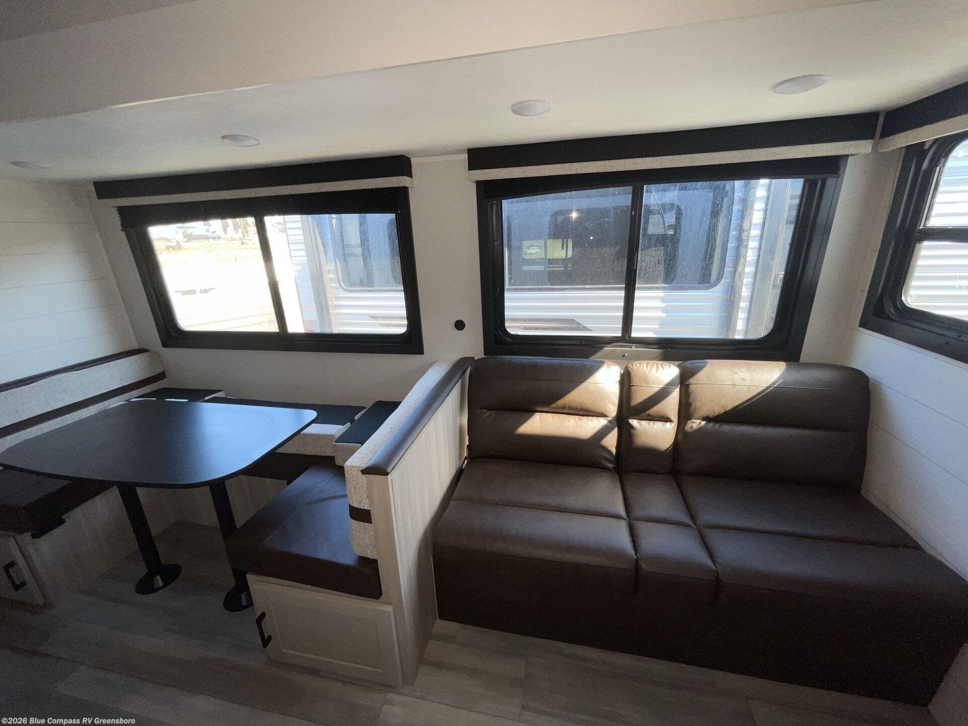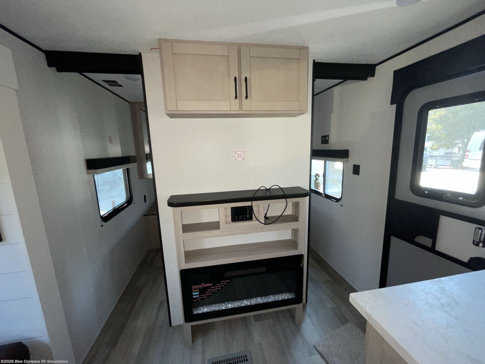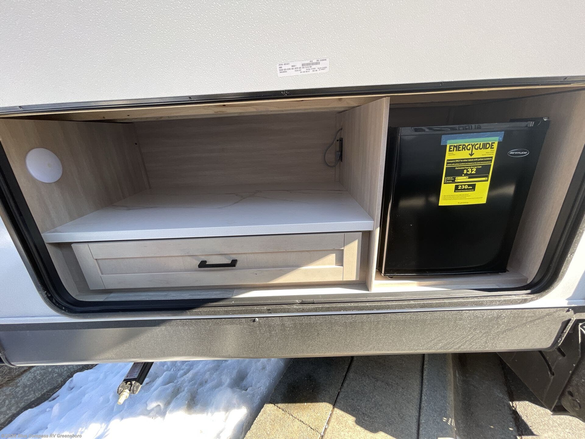You'll enjoy more space and more fun in this travel trailer with double slides, a private bunkhouse, and an outdoor kitchen with a refrigerator. The bunkhouse includes a set of bunk beds across from a third bunk and a J-cube sofa within a slide. There is also an entertainment center here and a fireplace to make this space cozier. And the full bath with its own exterior entry door is close by the bunkhouse for easy nighttime use! The second slide out is found in the combined kitchen and living room, which houses the U-shaped dinette and jack-knife sofa. Since you'll be camping with a larger group of friends or family, the front private bedroom with an RV queen bed and dual wardrobes will provide you with privacy each night!