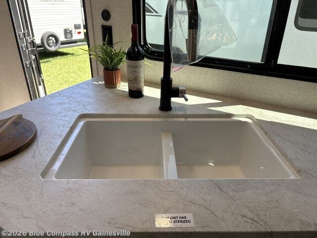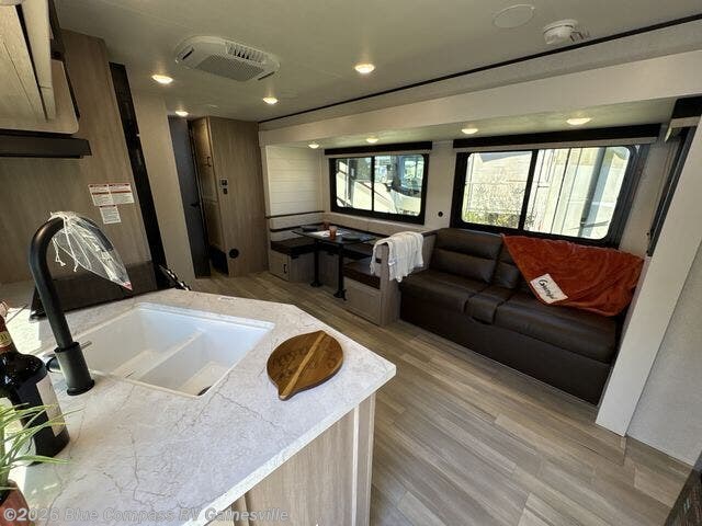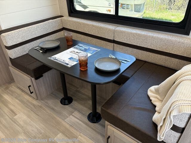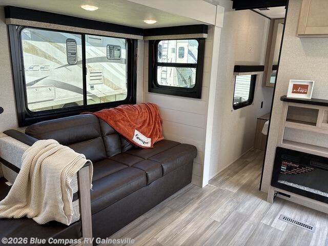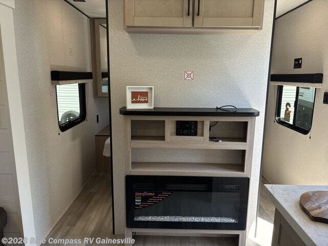 You'll enjoy more space and more fun in this travel trailer with double slides, a private bunkhouse, and an outdoor kitchen with a refrigerator. The bunkhouse includes a set of bunk beds across from a third bunk and a J-cube sofa within a slide. There is also an entertainment center here and a fireplace to make this space cozier. And the full bath with its own exterior entry door is close by the bunkhouse for easy nighttime use! The second slide out is found in the combined kitchen and living room, which houses the U-shaped dinette and jack-knife sofa. Since you'll be camping with a larger group of friends or family, the front private bedroom with an RV queen bed and dual wardrobes will provide you with privacy each night!