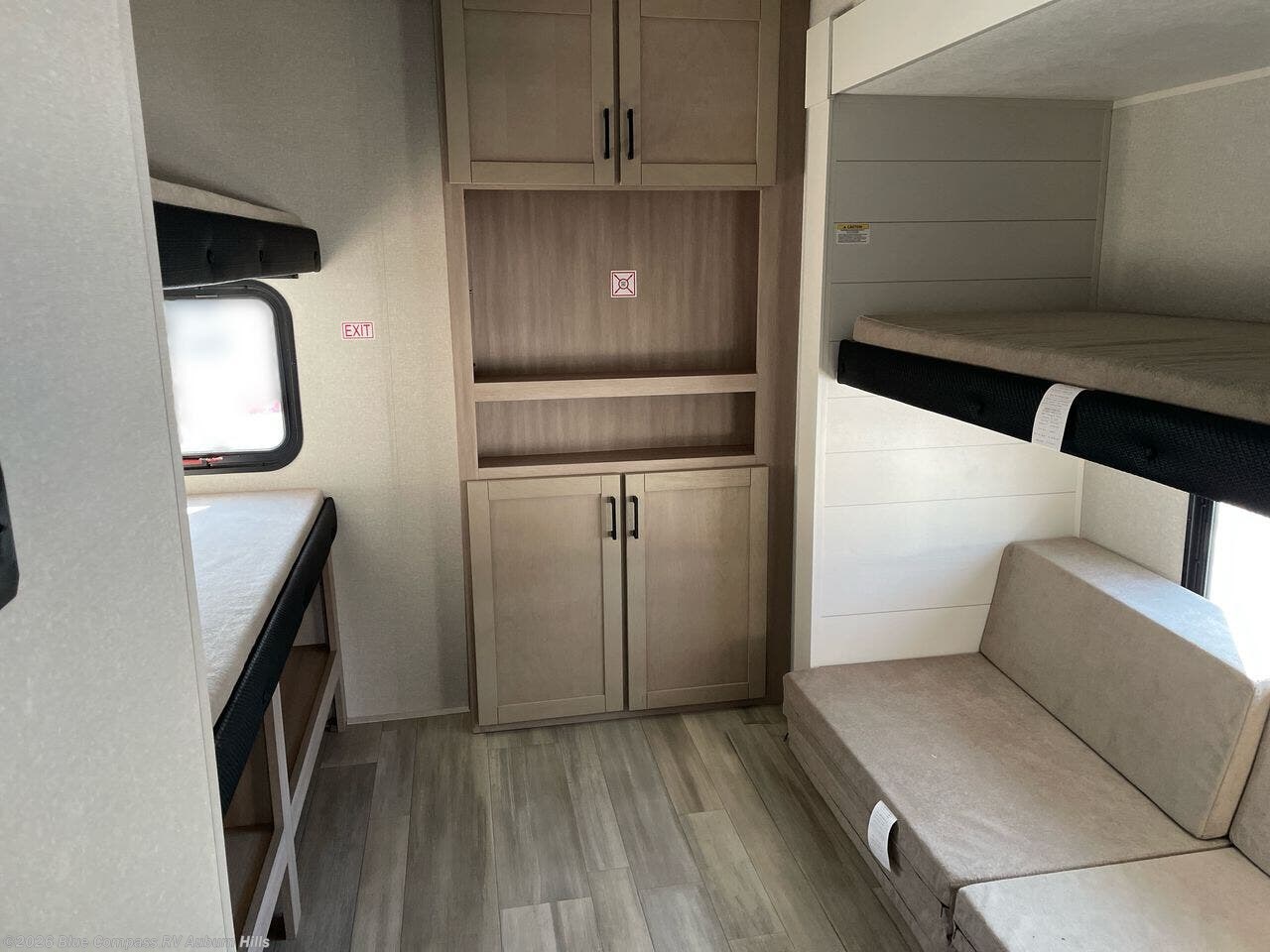 You'll enjoy more space and more fun in this travel trailer with double slides, a private bunkhouse, and an outdoor kitchen with a refrigerator. The bunkhouse includes a set of bunk beds across from a third bunk and a J-cube sofa within a slide. There is also an entertainment center here and a fireplace to make this space cozier. And the full bath with its own exterior entry door is close by the bunkhouse for easy nighttime use! The second slide out is found in the combined kitchen and living room, which houses the U-shaped dinette and jack-knife sofa. Since you'll be camping with a larger group of friends or family, the front private bedroom with an RV queen bed and dual wardrobes will provide you with privacy each night!