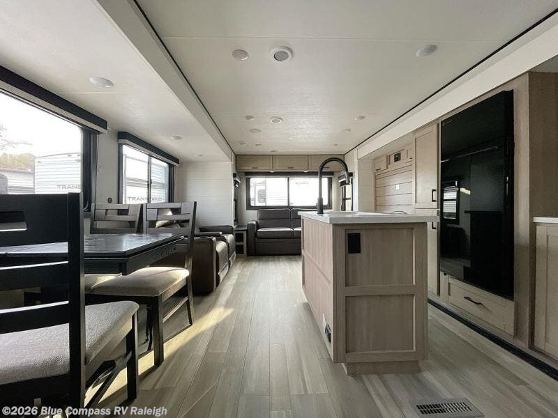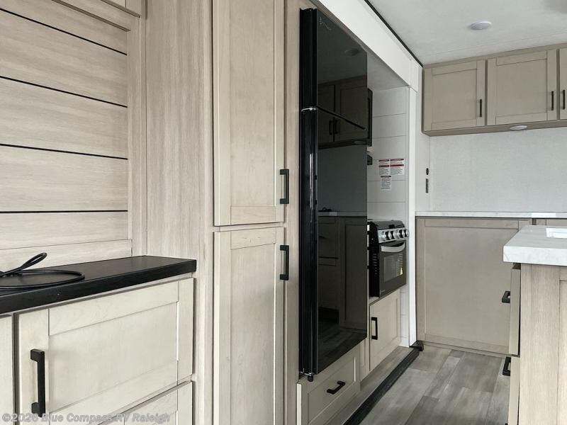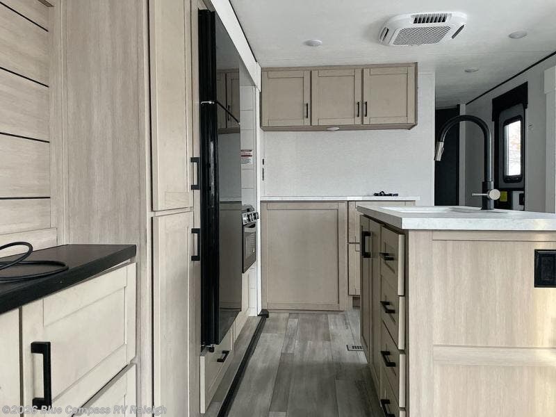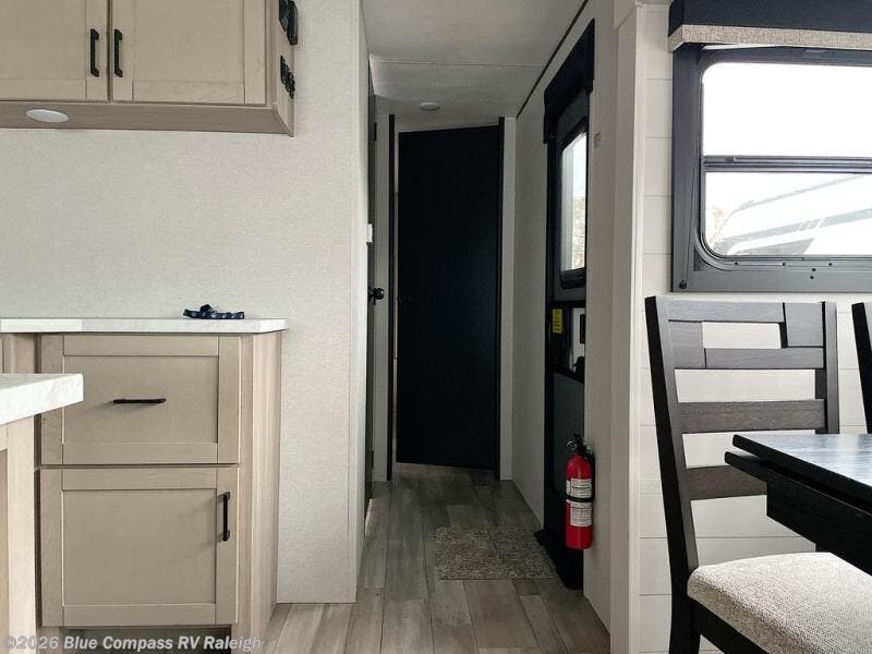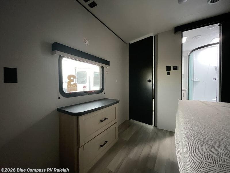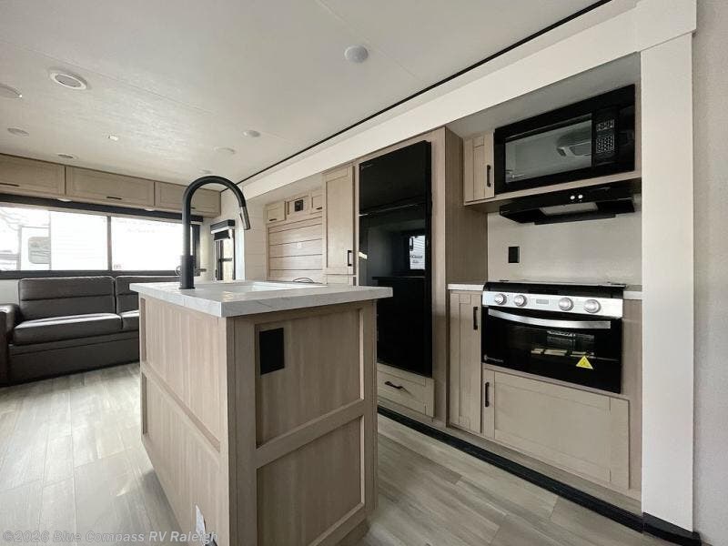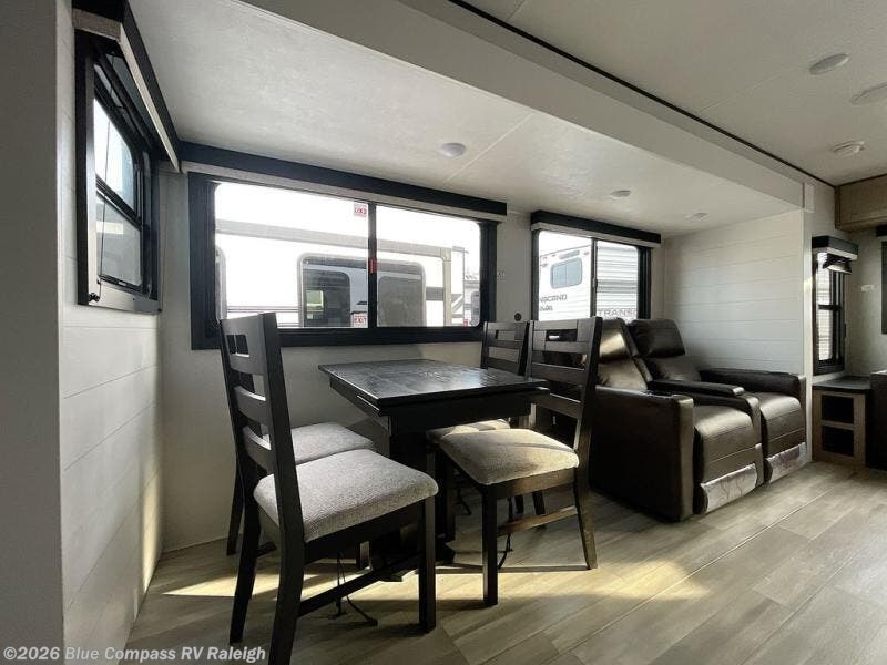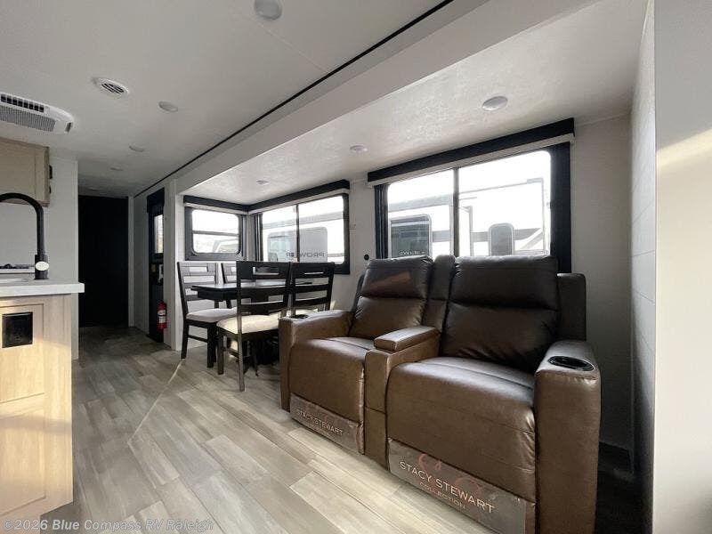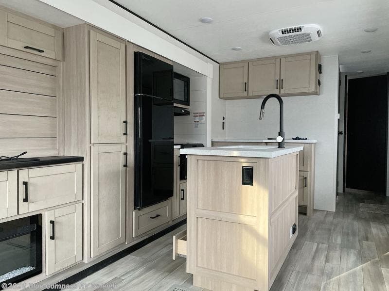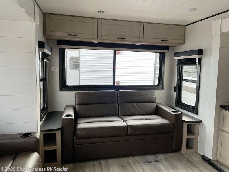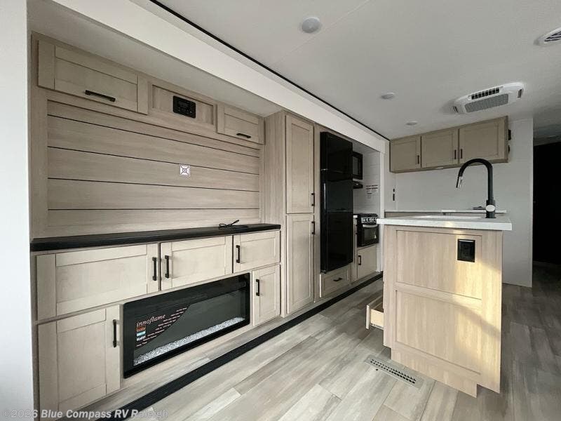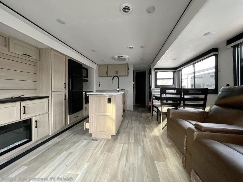 This travel trailer with triple slides will feel more like home with its spacious interior, front master bedroom, and rear living area with a sleeper sofa. The kitchen island will provide more counter space for the chef to prep food and clean up, and there is a booth dinette where you can all dine together. There is also a theater seat with cup holders in direct view of the entertainment center and fireplace. A dual entry bath is found towards the front, and a master bedroom with a queen bed is sure to provide a great night's rest. There is also a spacious bedroom wardrobe, a dresser, plus washer and dryer prep if you choose to add these appliances.