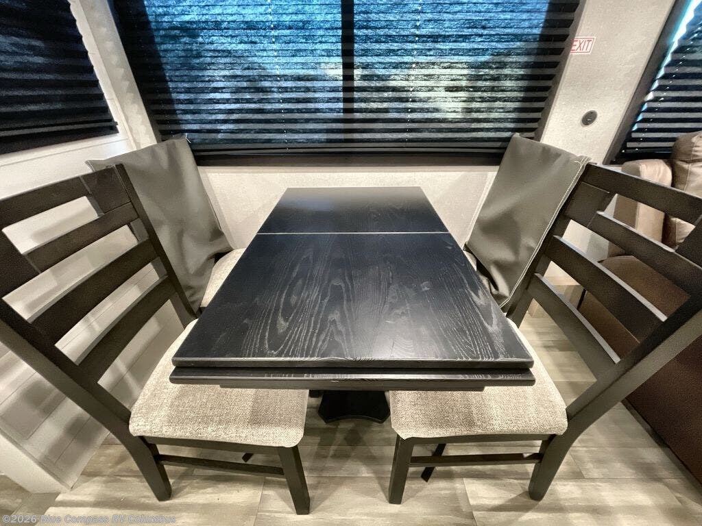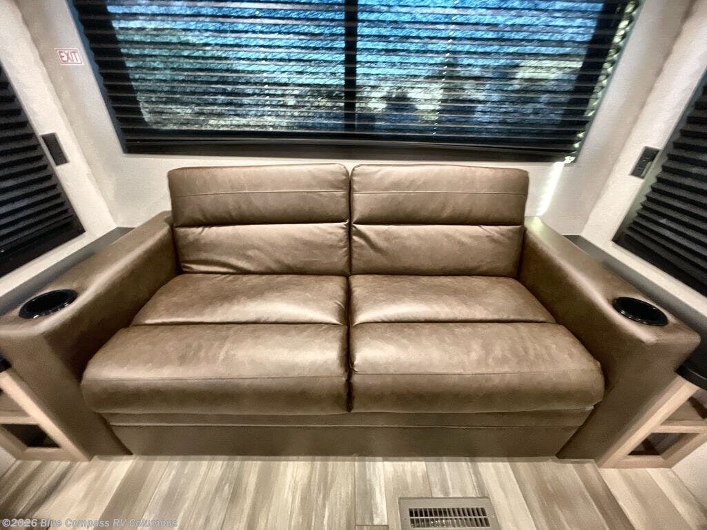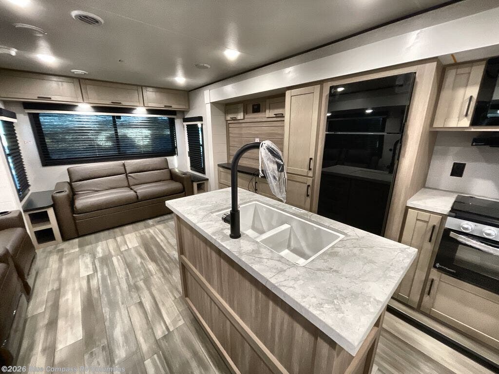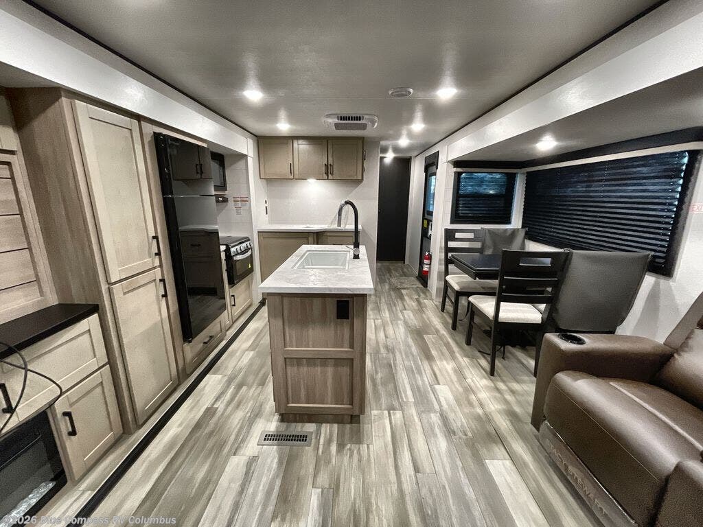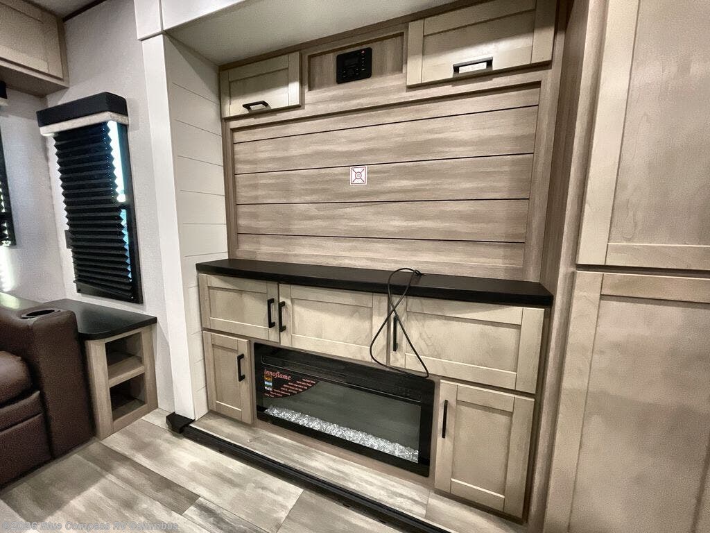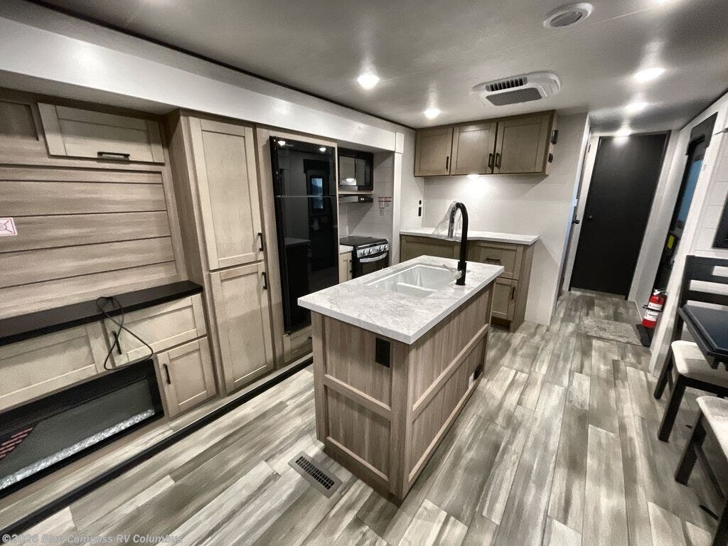 This travel trailer with triple slides will feel more like home with its spacious interior, front master bedroom, and rear living area with a sleeper sofa. The kitchen island will provide more counter space for the chef to prep food and clean up, and there is a booth dinette where you can all dine together. There is also a theater seat with cup holders in direct view of the entertainment center and fireplace. A dual entry bath is found towards the front, and a master bedroom with a queen bed is sure to provide a great night's rest. There is also a spacious bedroom wardrobe, a dresser, plus washer and dryer prep if you choose to add these appliances.