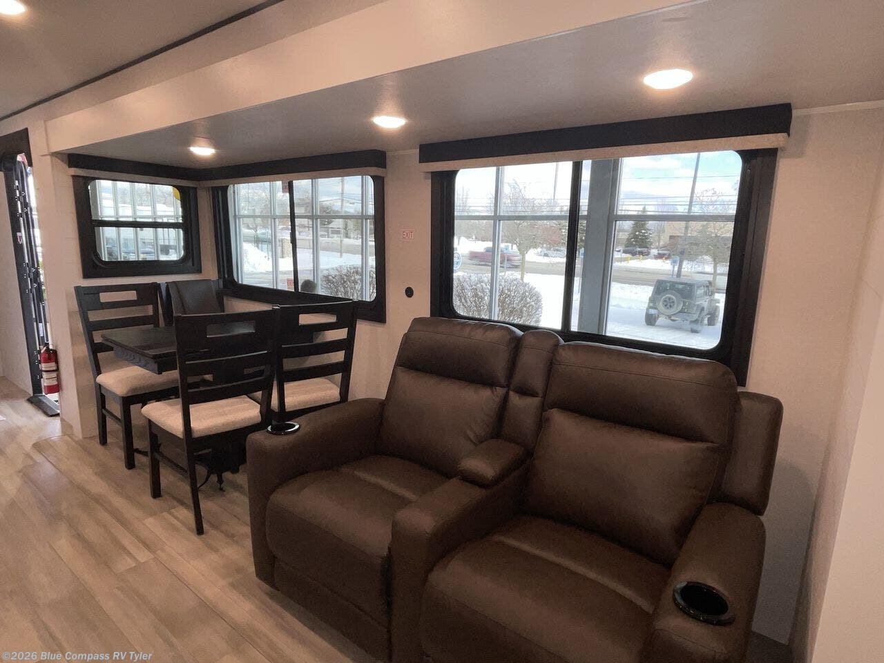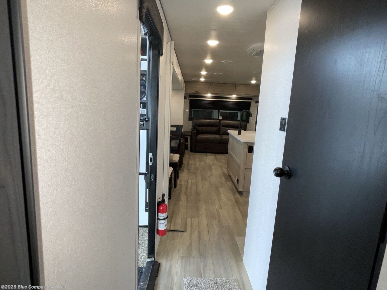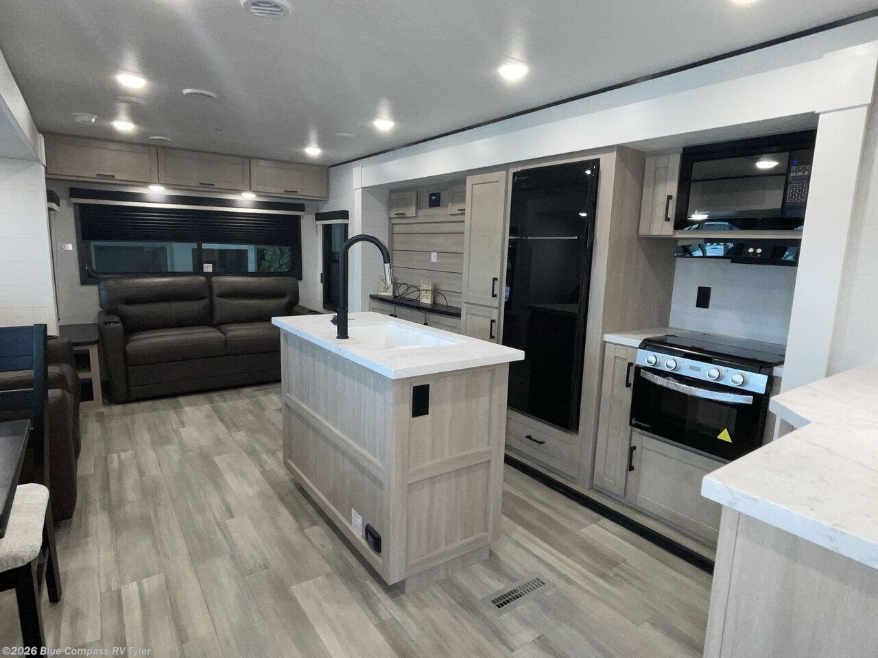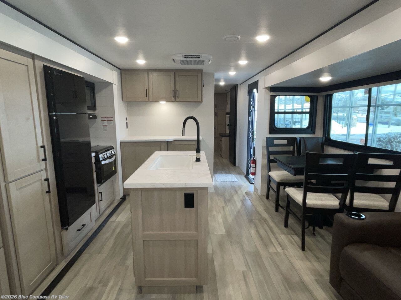 This travel trailer with triple slides will feel more like home with its spacious interior, front master bedroom, and rear living area with a sleeper sofa. The kitchen island will provide more counter space for the chef to prep food and clean up, and there is a booth dinette where you can all dine together. There is also a theater seat with cup holders in direct view of the entertainment center and fireplace. A dual entry bath is found towards the front, and a master bedroom with a queen bed is sure to provide a great night's rest. There is also a spacious bedroom wardrobe, a dresser, plus washer and dryer prep if you choose to add these appliances.