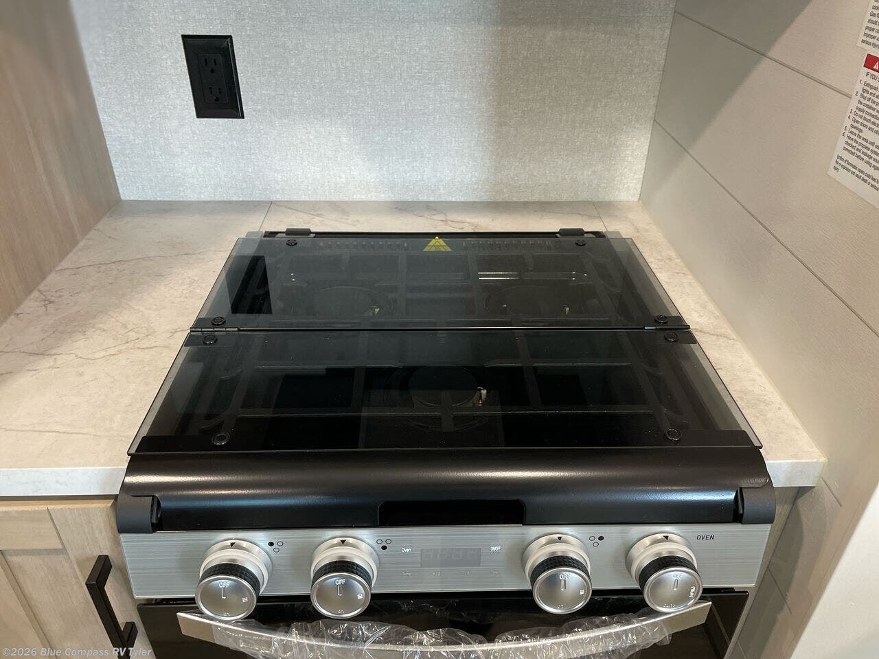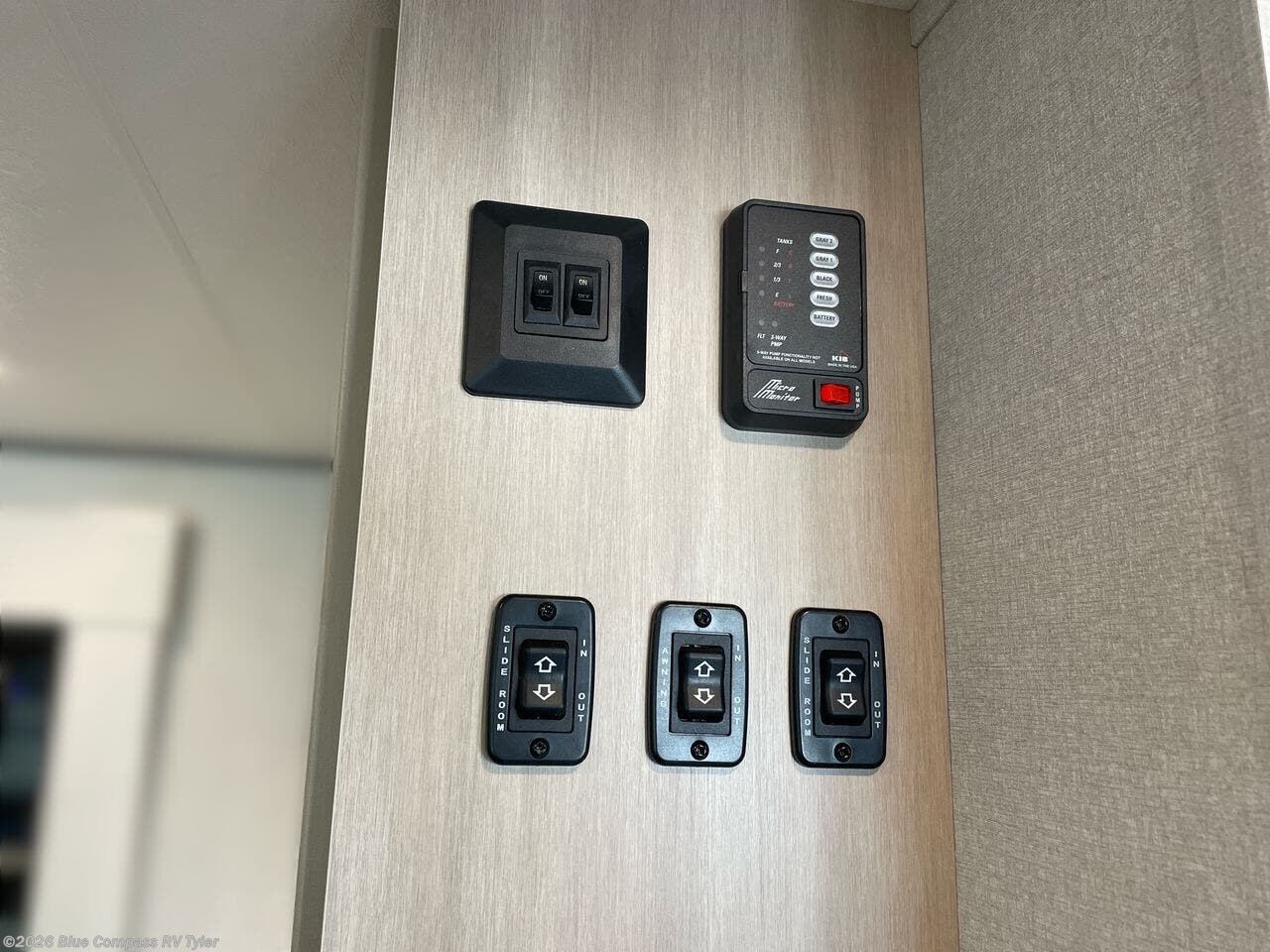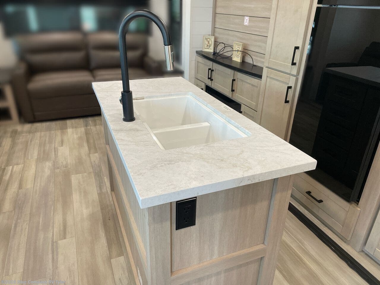This travel trailer with triple slides will feel more like home with its spacious interior, front master bedroom, and rear living area with a sleeper sofa. The kitchen island will provide more counter space for the chef to prep food and clean up, and there is a booth dinette where you can all dine together. There is also a theater seat with cup holders in direct view of the entertainment center and fireplace. A dual entry bath is found towards the front, and a master bedroom with a queen bed is sure to provide a great night's rest. There is also a spacious bedroom wardrobe, a dresser, plus washer and dryer prep if you choose to add these appliances.