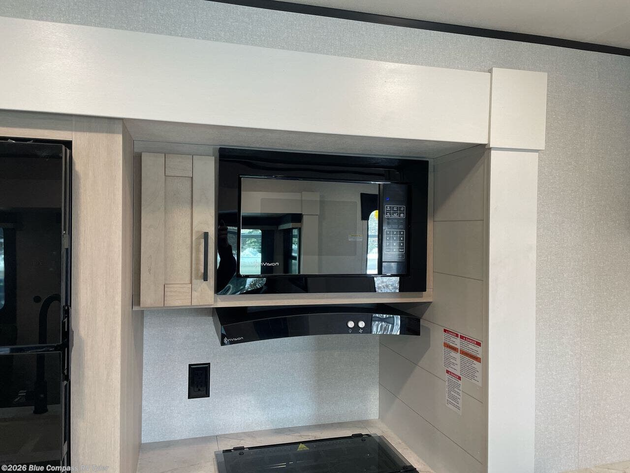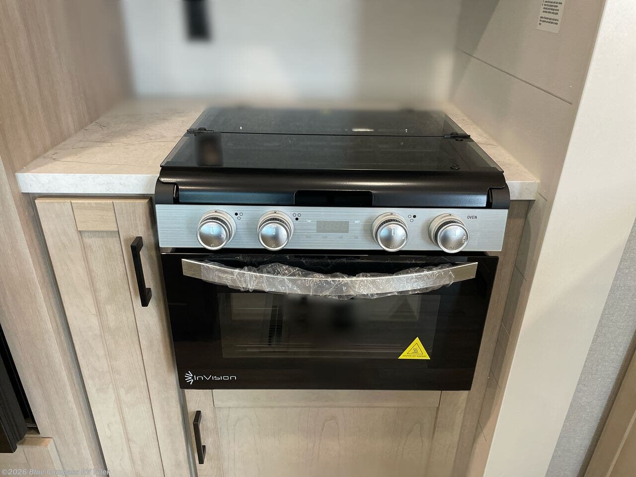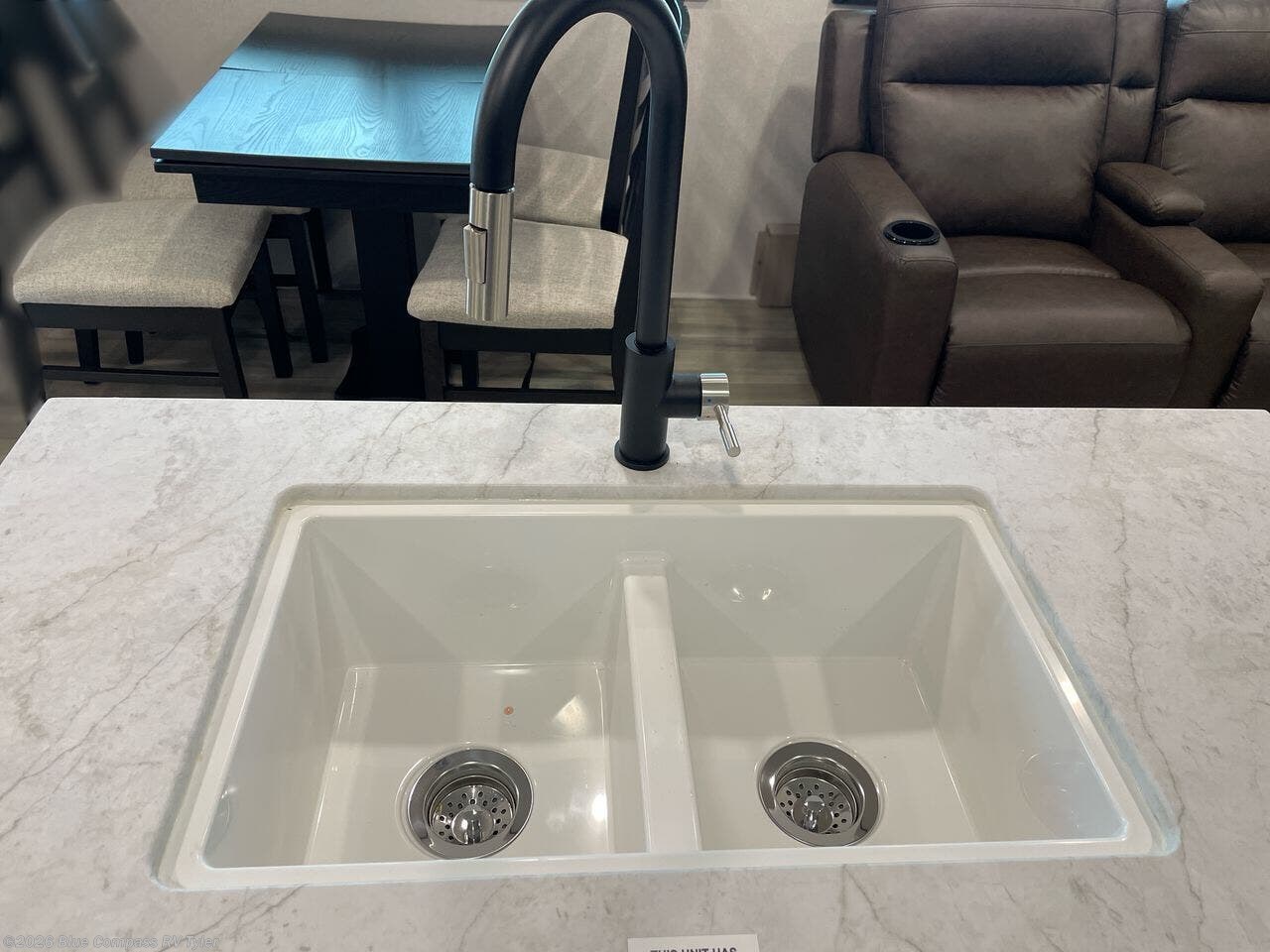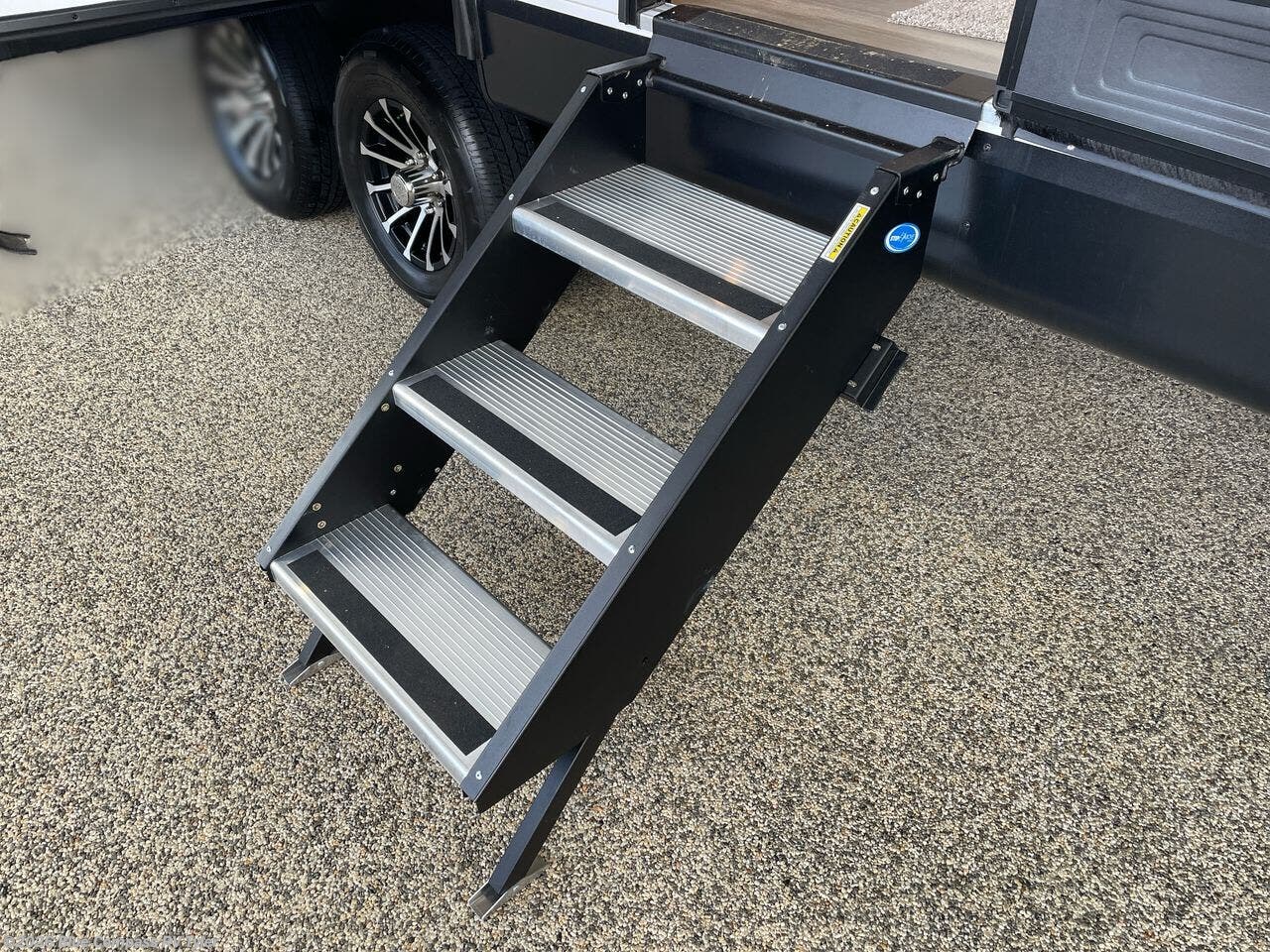 This travel trailer with triple slides will feel more like home with its spacious interior, front master bedroom, and rear living area with a sleeper sofa. The kitchen island will provide more counter space for the chef to prep food and clean up, and there is a booth dinette where you can all dine together. There is also a theater seat with cup holders in direct view of the entertainment center and fireplace. A dual entry bath is found towards the front, and a master bedroom with a queen bed is sure to provide a great night's rest. There is also a spacious bedroom wardrobe, a dresser, plus washer and dryer prep if you choose to add these appliances.