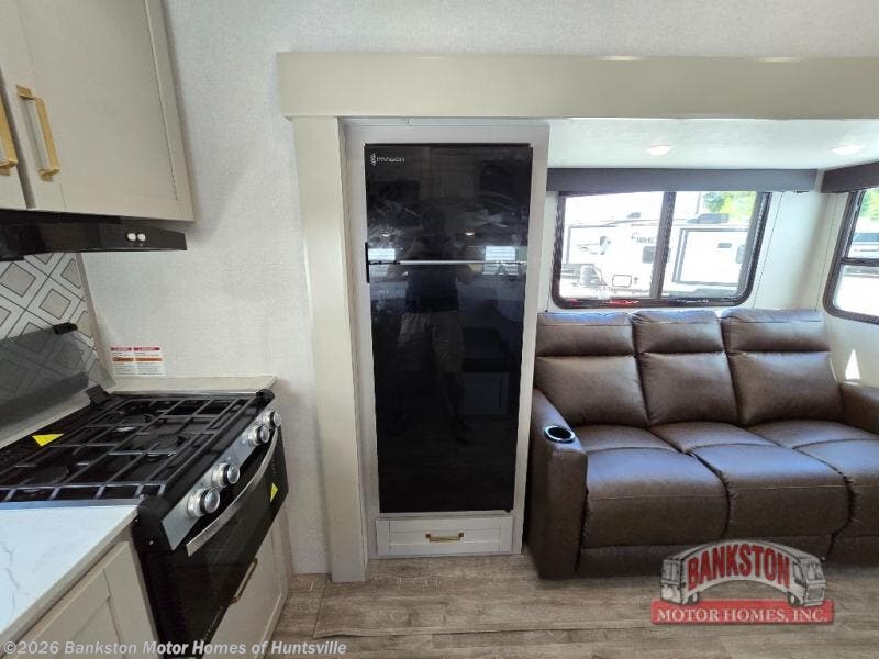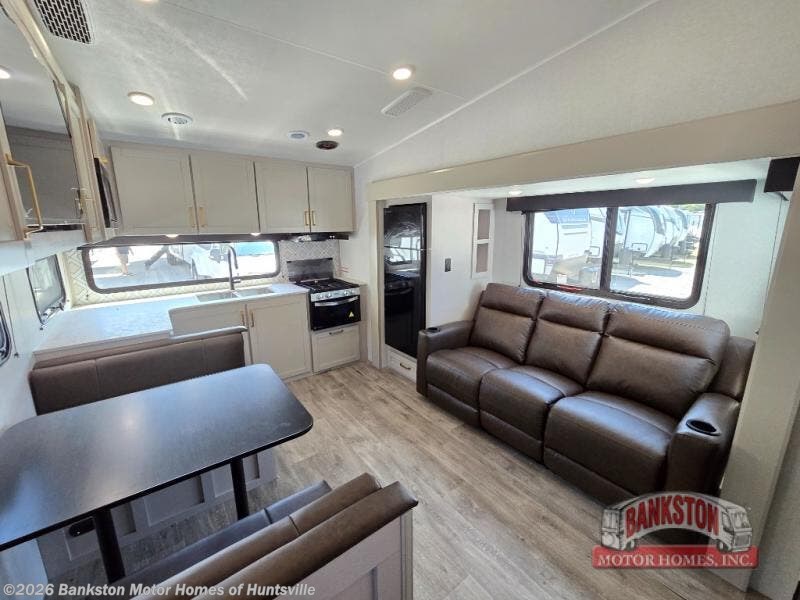 The fifth wheel you were waiting for! The spacious rear kitchen is equipped with a three-burner cooktop, microwave, booth dinette, 12V refrigerator, and sink, providing ample space for meal preparation. Overhead cabinets and a pantry provide ample storage for cookware, dishes, and other essential kitchen items. The living area features a trifold sofa, perfect for relaxation and entertainment. The full bathroom’s thoughtful design ensures that everyone has their own space, and the front bedroom is a retreat from the world, featuring a plush queen bed, a spacious wardrobe, and a closet.