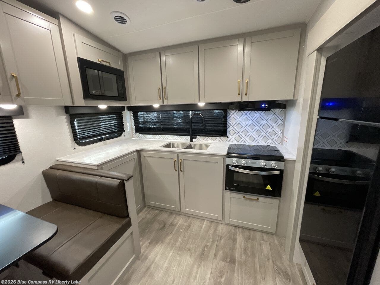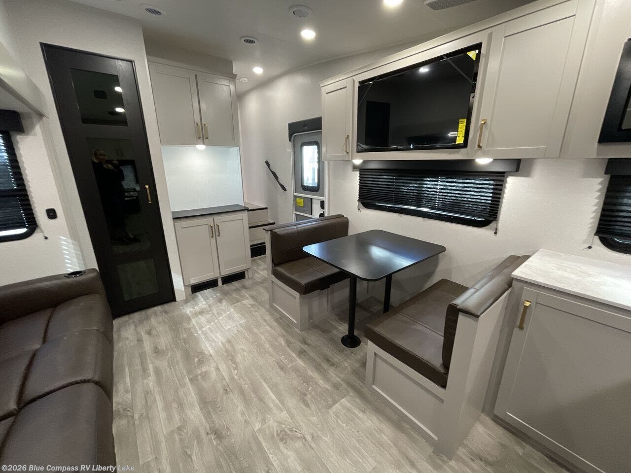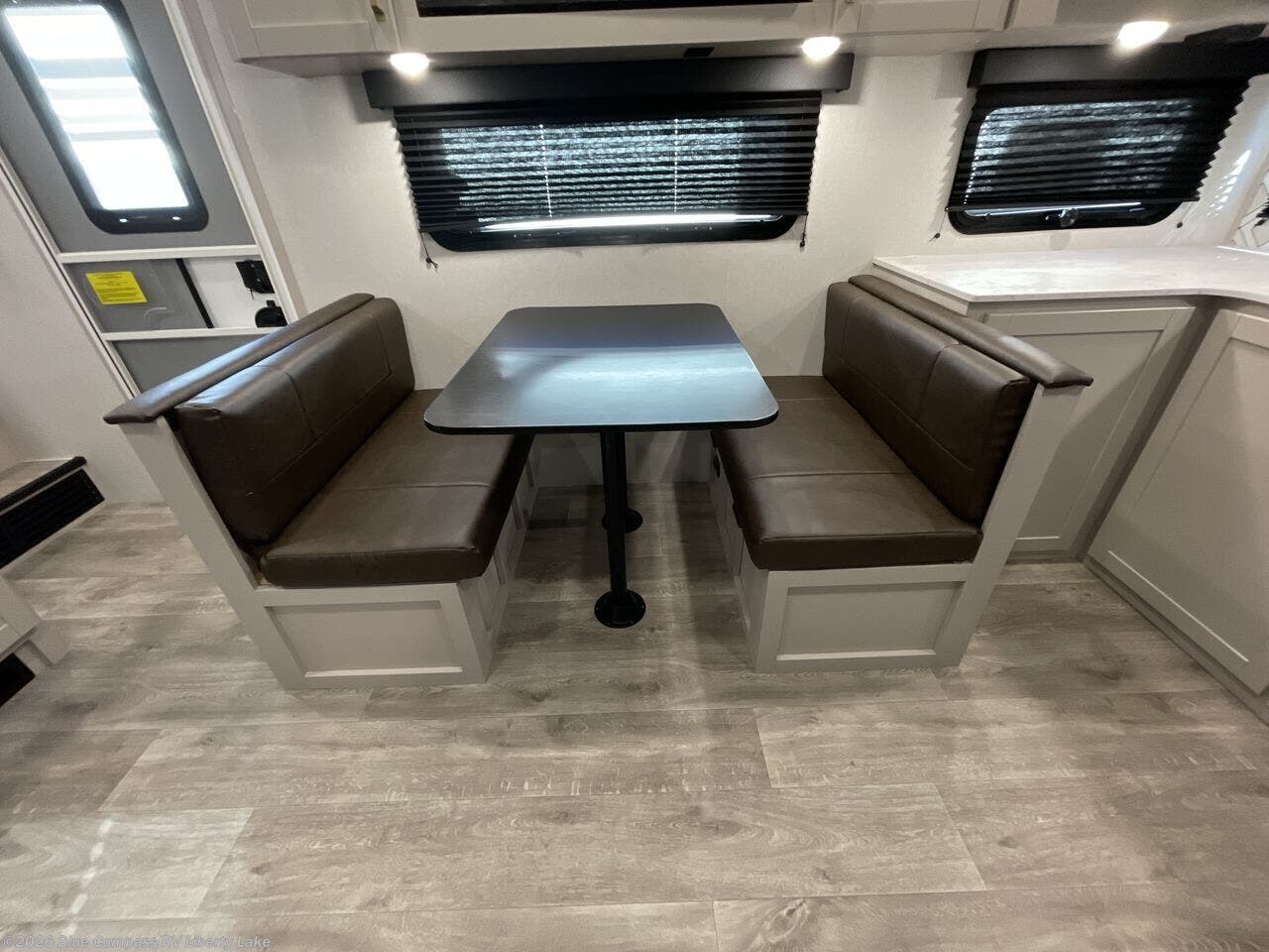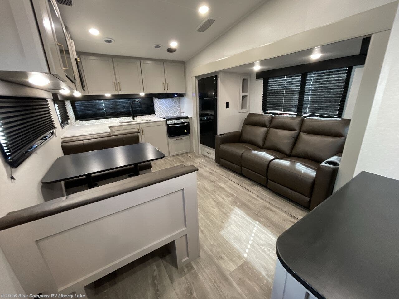 The fifth wheel you were waiting for! The spacious rear kitchen is equipped with a three-burner cooktop, microwave, booth dinette, 12V refrigerator, and sink, providing ample space for meal preparation. Overhead cabinets and a pantry provide ample storage for cookware, dishes, and other essential kitchen items. The living area features a trifold sofa, perfect for relaxation and entertainment. The full bathroom’s thoughtful design ensures that everyone has their own space, and the front bedroom is a retreat from the world, featuring a plush queen bed, a spacious wardrobe, and a closet.