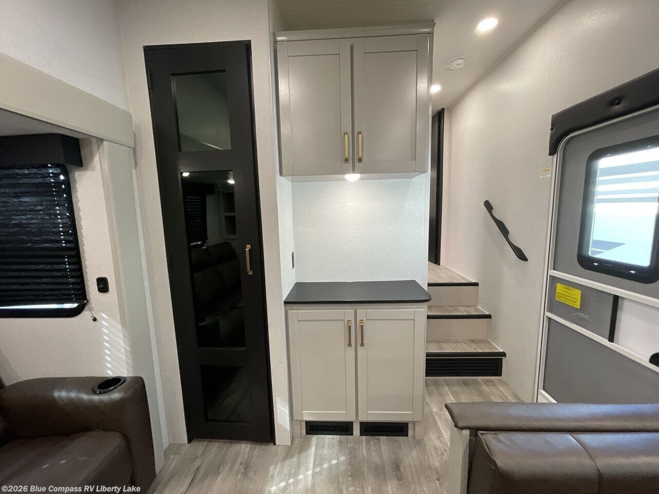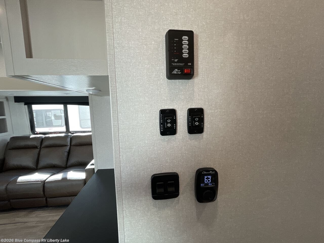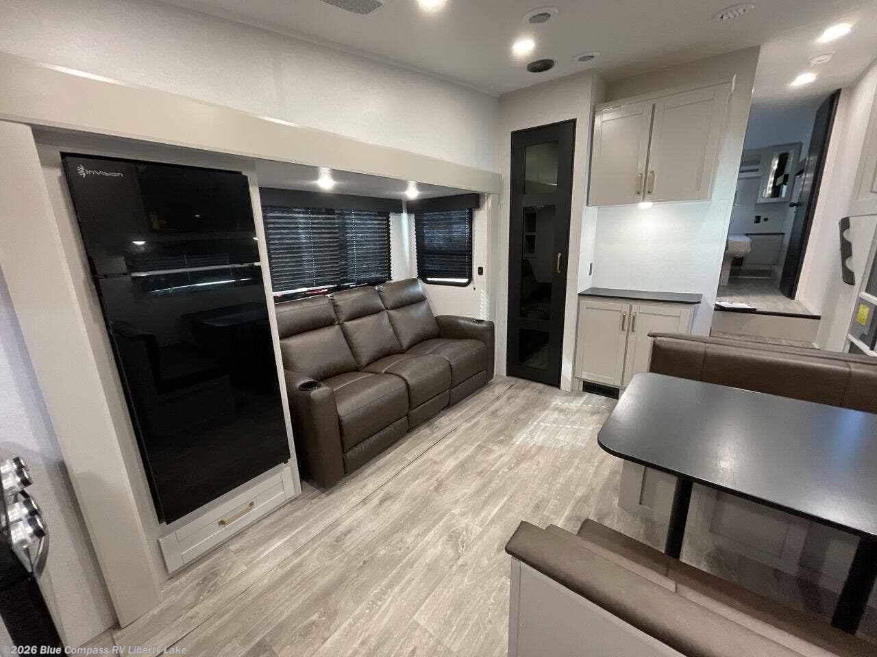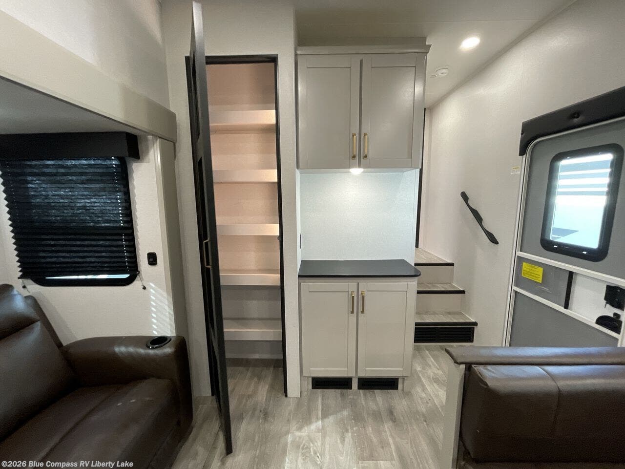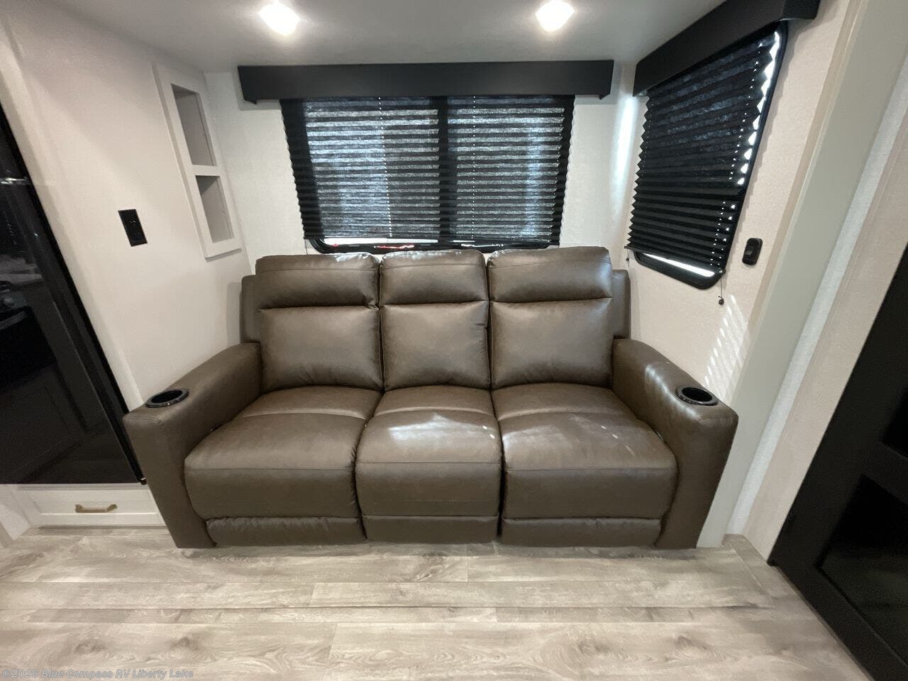 The fifth wheel you were waiting for! The spacious rear kitchen is equipped with a three-burner cooktop, microwave, booth dinette, 12V refrigerator, and sink, providing ample space for meal preparation. Overhead cabinets and a pantry provide ample storage for cookware, dishes, and other essential kitchen items. The living area features a trifold sofa, perfect for relaxation and entertainment. The full bathroom’s thoughtful design ensures that everyone has their own space, and the front bedroom is a retreat from the world, featuring a plush queen bed, a spacious wardrobe, and a closet.