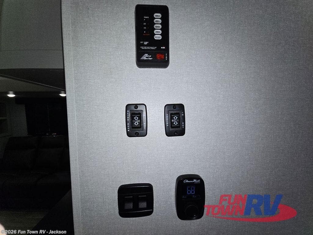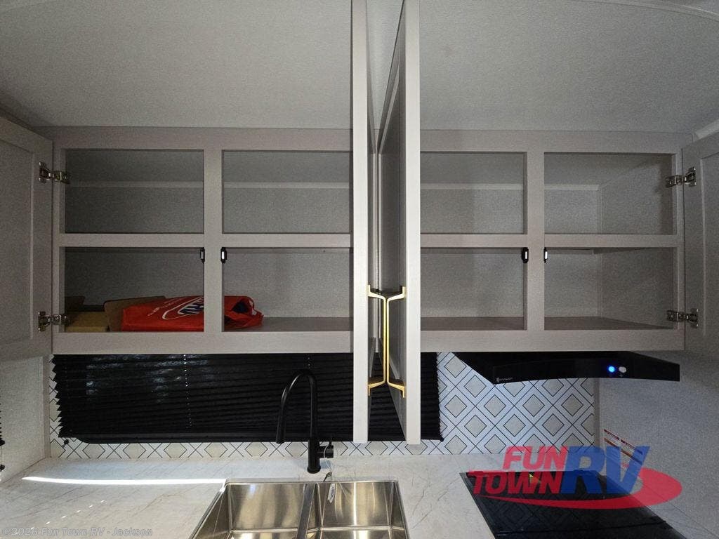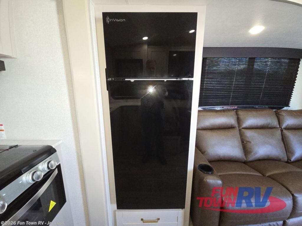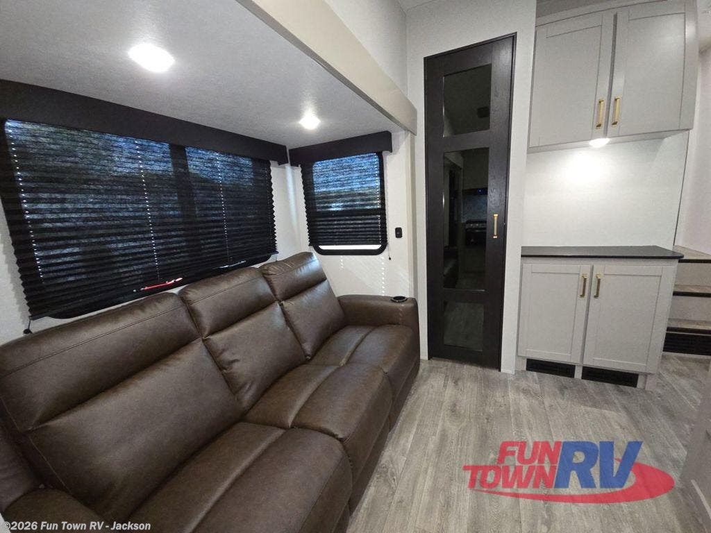 The fifth wheel you were waiting for! The spacious rear kitchen is equipped with a three-burner cooktop, microwave, booth dinette, 12V refrigerator, and sink, providing ample space for meal preparation. Overhead cabinets and a pantry provide ample storage for cookware, dishes, and other essential kitchen items. The living area features a trifold sofa, perfect for relaxation and entertainment. The full bathroom’s thoughtful design ensures that everyone has their own space, and the front bedroom is a retreat from the world, featuring a plush queen bed, a spacious wardrobe, and a closet.