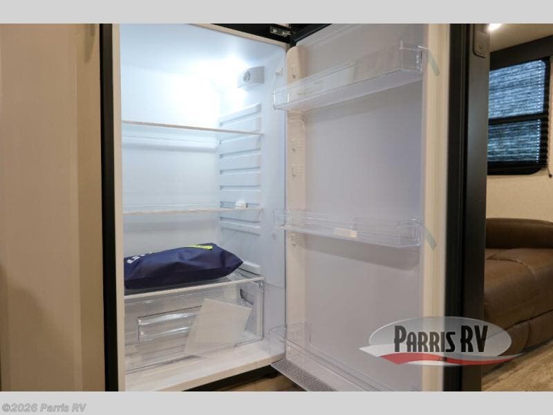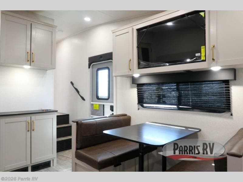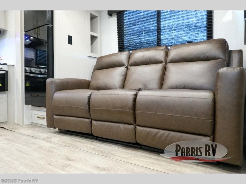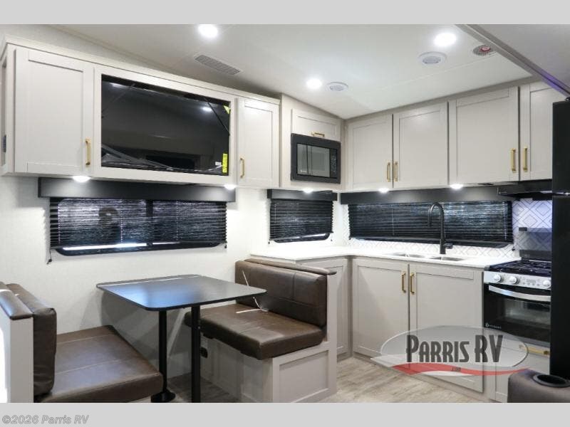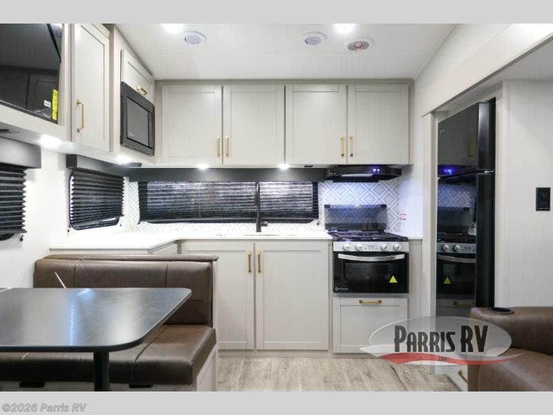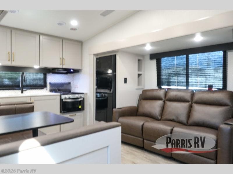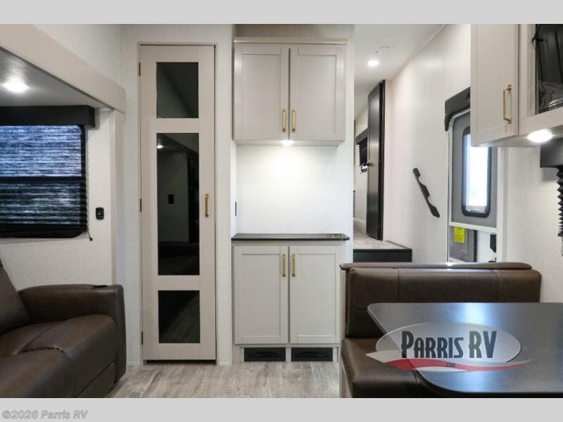 The fifth wheel you were waiting for! The spacious rear kitchen is equipped with a three-burner cooktop, microwave, booth dinette, 12V refrigerator, and sink, providing ample space for meal preparation. Overhead cabinets and a pantry provide ample storage for cookware, dishes, and other essential kitchen items. The living area features a trifold sofa, perfect for relaxation and entertainment. The full bathroom’s thoughtful design ensures that everyone has their own space, and the front bedroom is a retreat from the world, featuring a plush queen bed, a spacious wardrobe, and a closet.