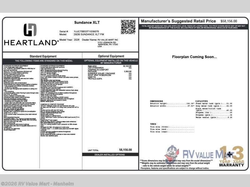 Request More Info on this 2026 Heartland Sundance 28DB Offered for sale by RV Value Mart - Manheim
