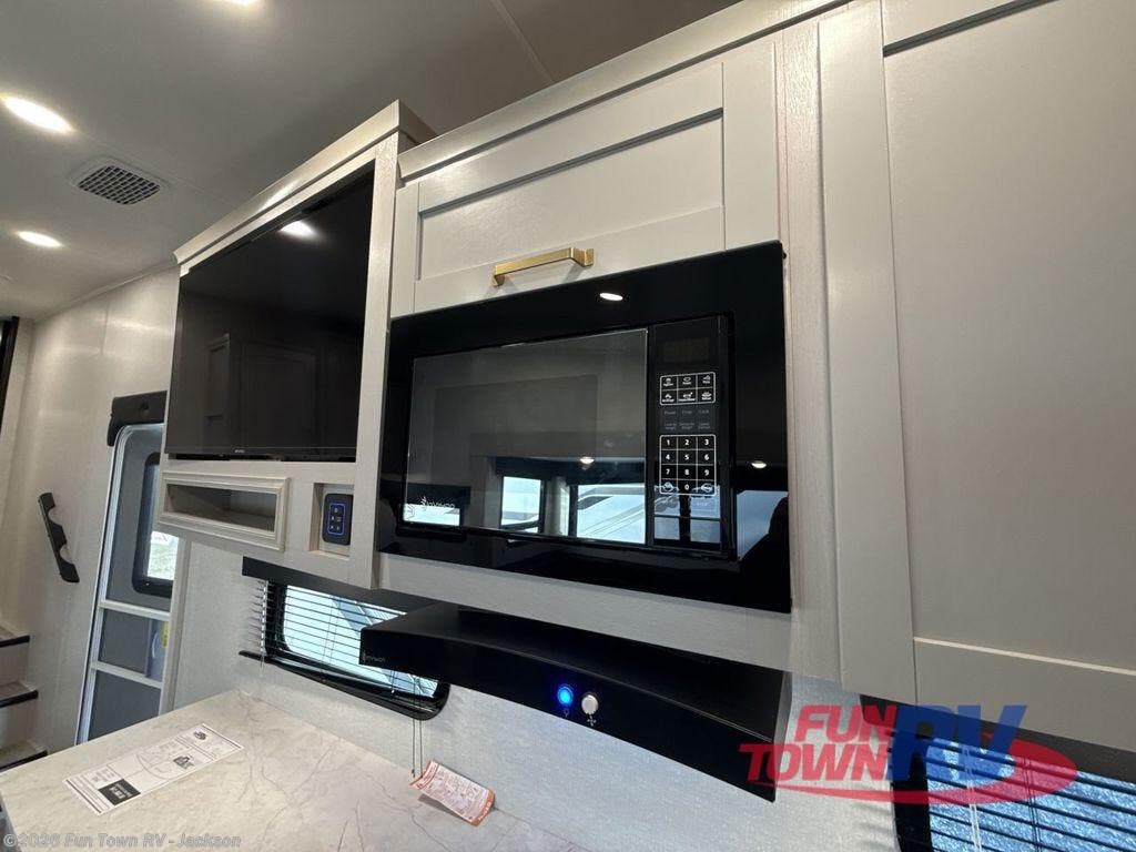 This fifth wheel's spacious interior boasts double-sized bunk beds designed for kids or guests, providing a comfortable sleeping space. A U-shaped dinette that offers ample seating and dining space for meals or even more sleeping space, as well as the 60” tri-fold sofa, which provides additional seating and can be converted into a comfortable sleeping area. In the kitchen area, you will find many amenities to cook delicious meals, such as a microwave, refrigerator, and overhead cabinets that will allow you to keep everything organized. The front bed is spacious, featuring a queen bed ideal for sleeping tight, and the full bath will complete the at-home experience since you will be able to take a refreshing shower on hot days!