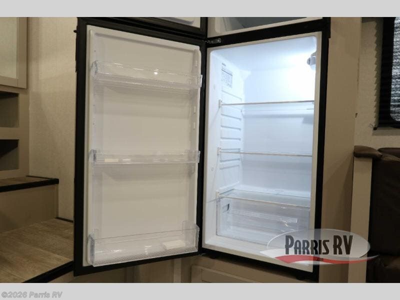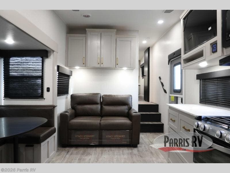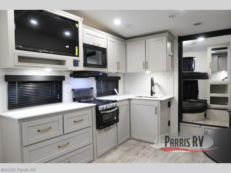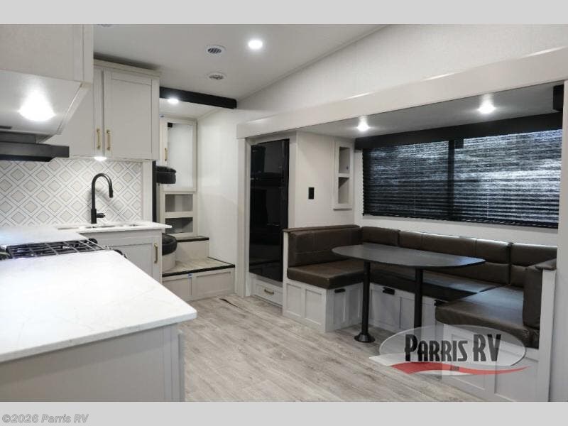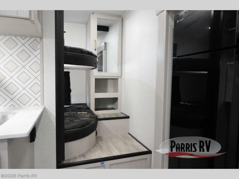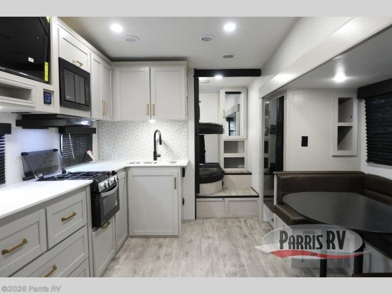 This fifth wheel's spacious interior boasts double-sized bunk beds designed for kids or guests, providing a comfortable sleeping space. A U-shaped dinette that offers ample seating and dining space for meals or even more sleeping space, as well as the 60” tri-fold sofa, which provides additional seating and can be converted into a comfortable sleeping area. In the kitchen area, you will find many amenities to cook delicious meals, such as a microwave, refrigerator, and overhead cabinets that will allow you to keep everything organized. The front bed is spacious, featuring a queen bed ideal for sleeping tight, and the full bath will complete the at-home experience since you will be able to take a refreshing shower on hot days!